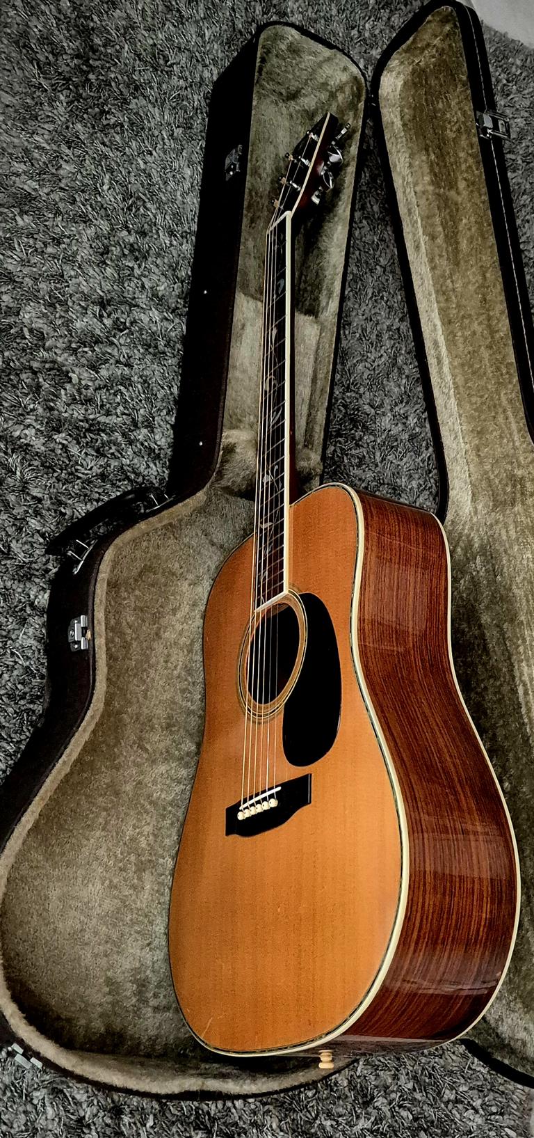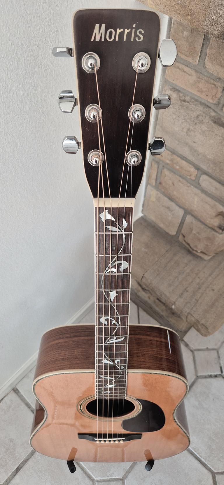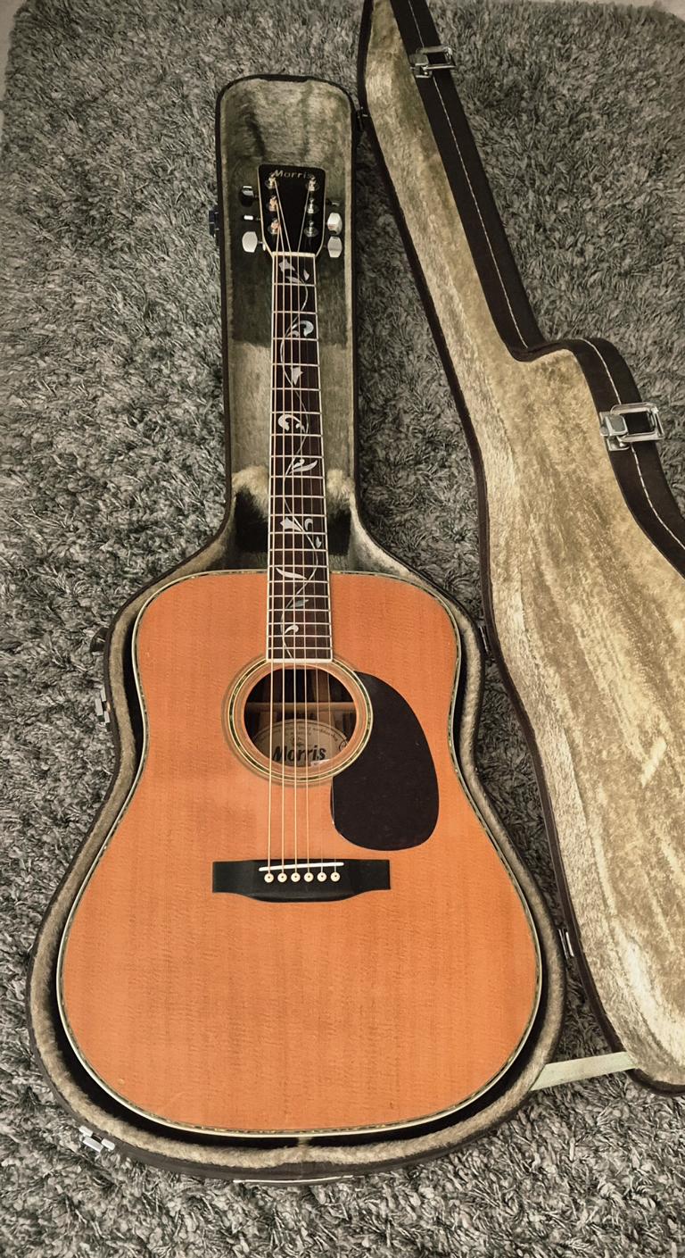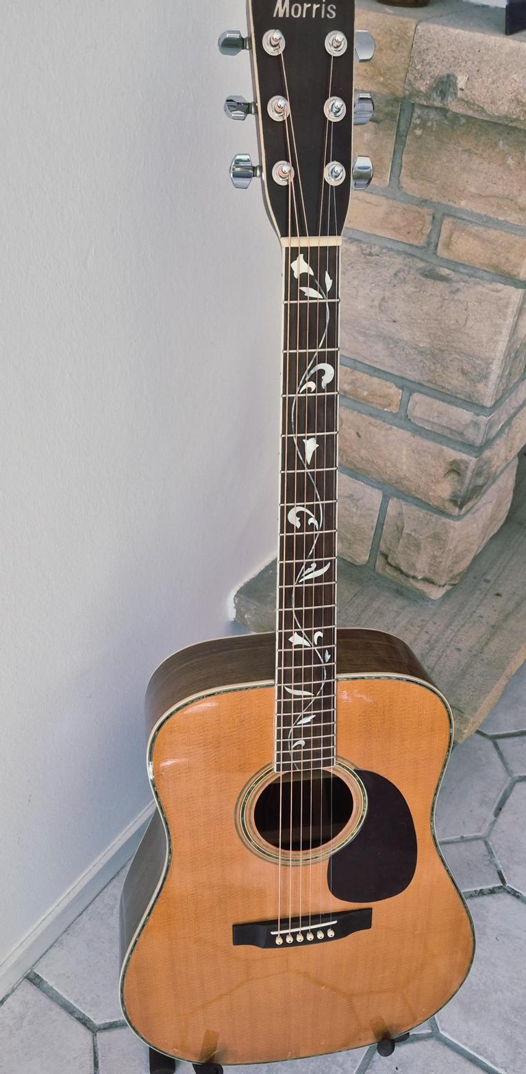 Ich biete hier eine Morris W-616 von 1978, eine in Nagayo, Japan, handgefertigte und von Gitarrenbauerlegende G.Yamada handsignierte Lawsuit Morris Dreadnought Westerngitarre mit resonanter Fichtendecke, die dreiteiligem Boden und Zargen aus wild gemasertem indischen Palisander, einteiligem Mahagonihals mit mittelbreitem C-Halsprofil und 43mm Sattelbreite, gebundenem Ebenholz-Griffbrett mit aufwändigen Tree of Life Perlmutt-Einlagen(!), originalen Morris Japan Chrommechaniken sowie Rosette und Deckenbindings aus Abalone in einem authentisch gealterten Natur-Hochglanz-Finish mit diversen Verzierungen aus Edelhölzern, Abalone und Perlmutt in einem gut gebrauchtem Zustand inkl. Hartschalenkoffer.