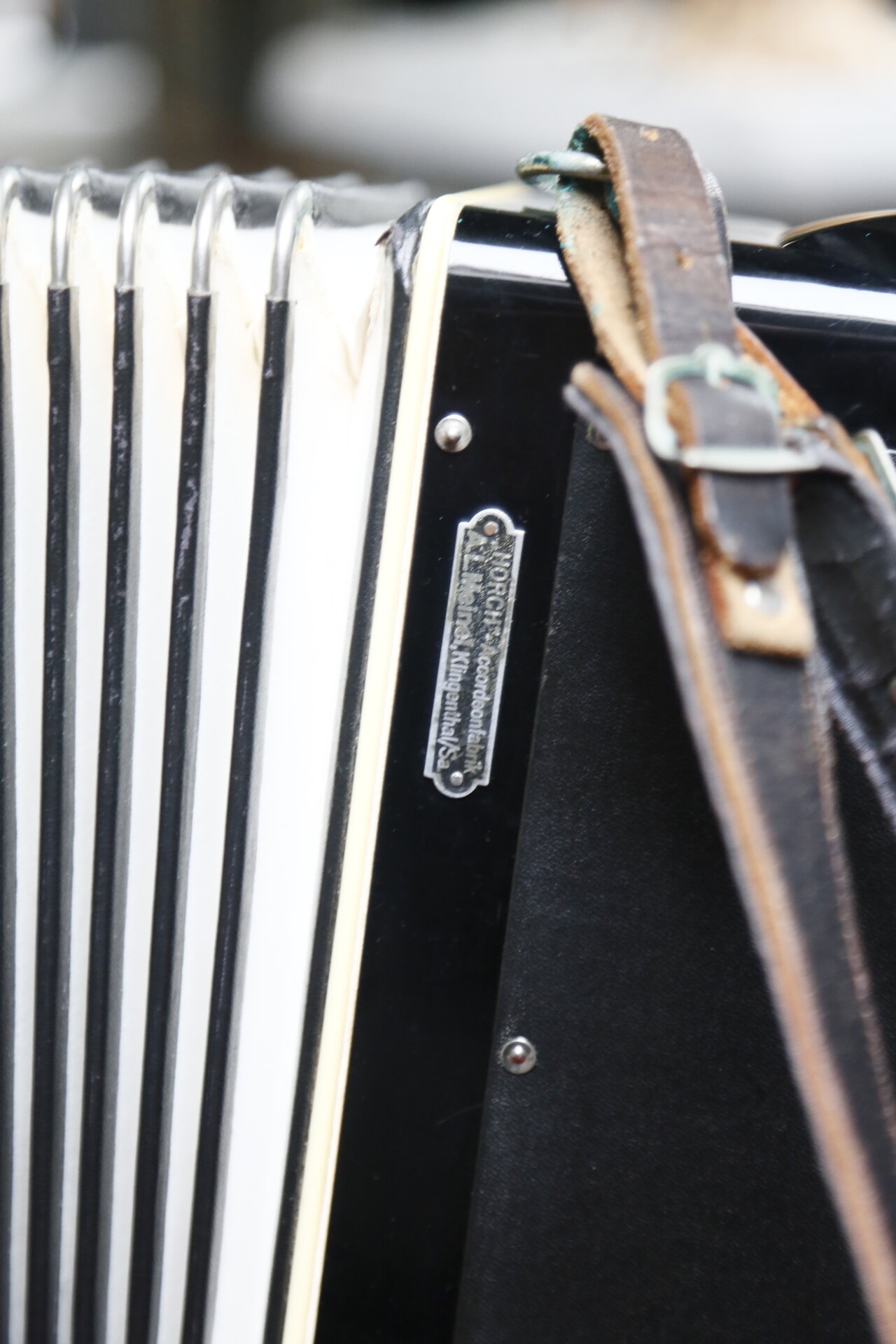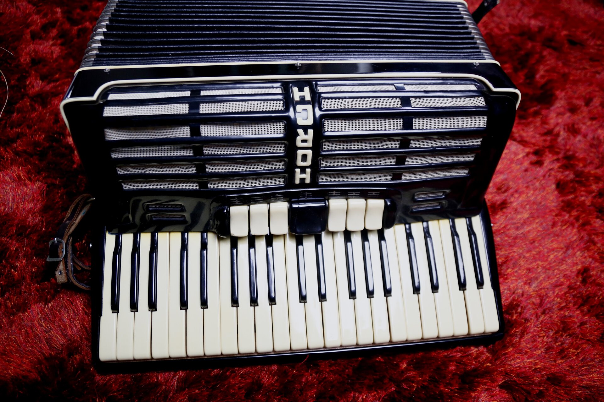 Gebe Erbstück Akkordeon ab: Ein Horch Exquisit, 120 Bässe mit Register, 5-chörig, gebaut von Meinel, wahrscheinlich in den 50'ern. Stimmplatten und Balg in gutem Zustand, interessanter Sound, seidig und etwas "mystisch". Der Koffer ist etwas verschlissen. Nicht für kleine Leute zu empfehlen, es ist wirklich groß und schwer ( knapp 10 kg). Kann selbstverständlich probegespielt werden.