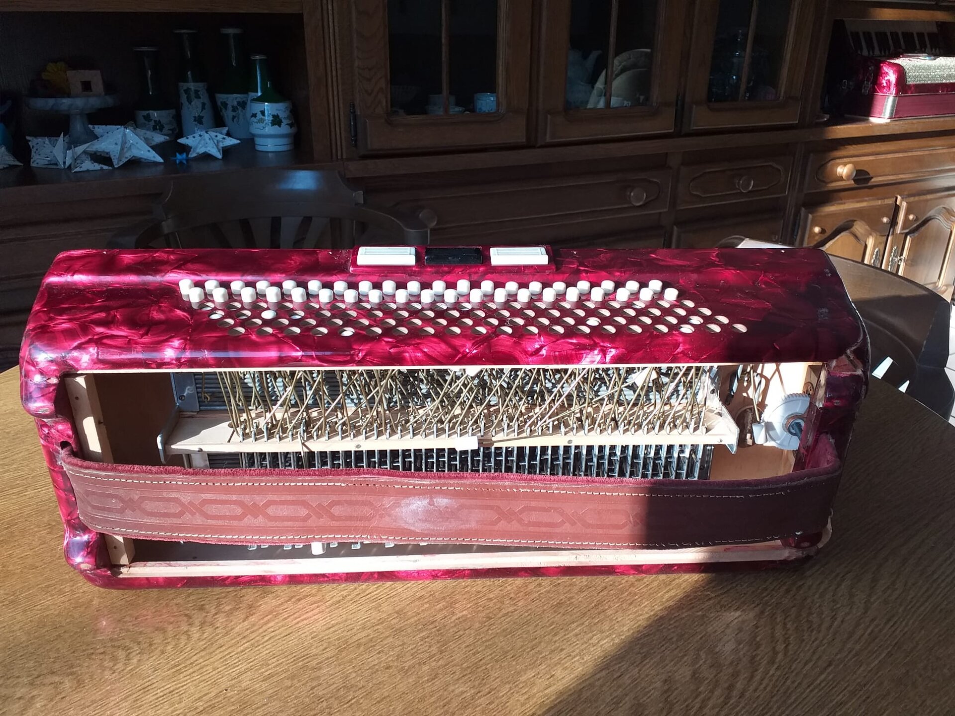 Es ist auf dem Transport trotz bester Verpackung offenbar ein Sturz aus größerer Höhe oder ein Zusammenprall passiert, so dass das Bassteil irreparabel defekt ist. Der Käufer des Akkordeons ist natürlich vom Kauf zurück getreten und es ist wieder bei mir.