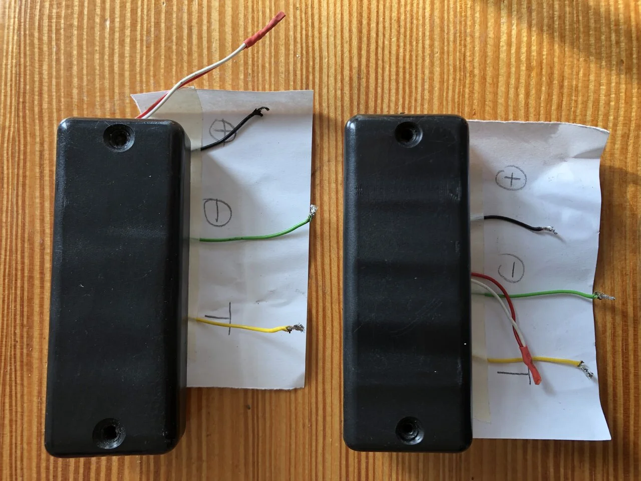Die Gehäuse haben Gebrauchsspuren (s. Fotos), die Pickups funktionieren aber einwandfrei. Sie waren in einem 4-Saiter verbaut.