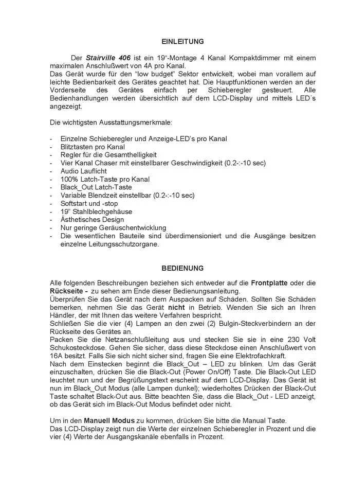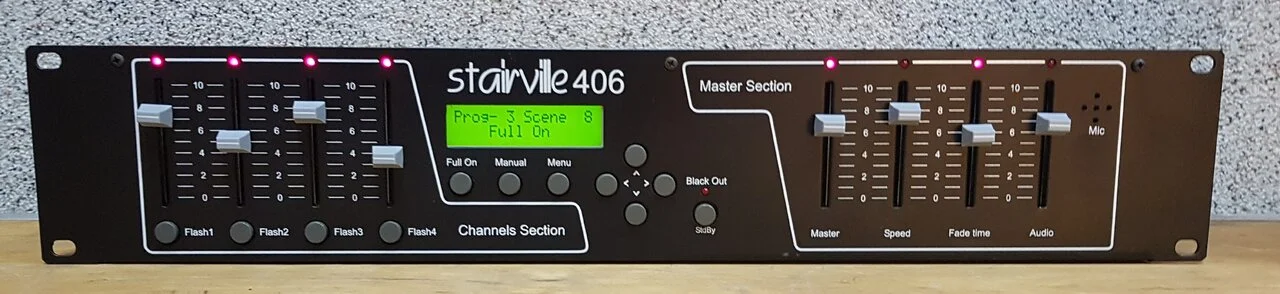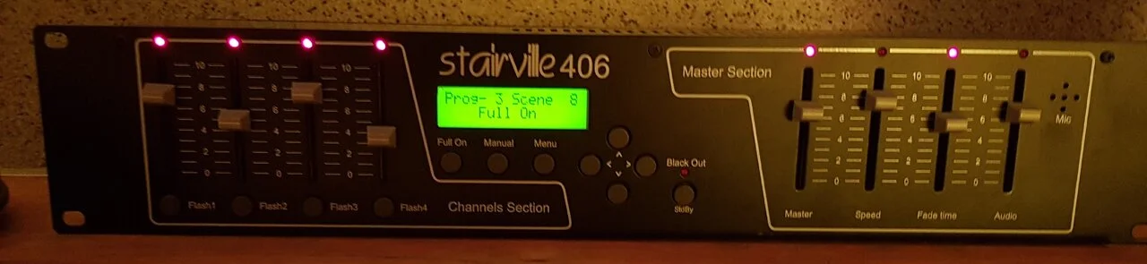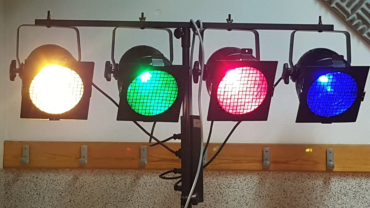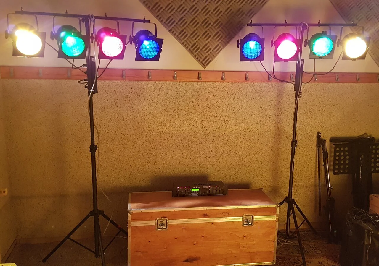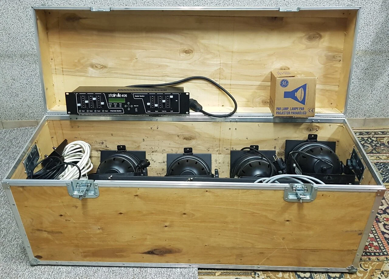 Hallo, hier biete ich eine komplette Licht-Anlage an. Sie besteht aus einem Steuergerät STAIRVILLE 406, 2 x 4 Strahlern mit entsprechenden Farbfolien, dazugehörige Traversen, auf denen die Strahler montiert werden sowie 2 höhenverstellbare Stative.