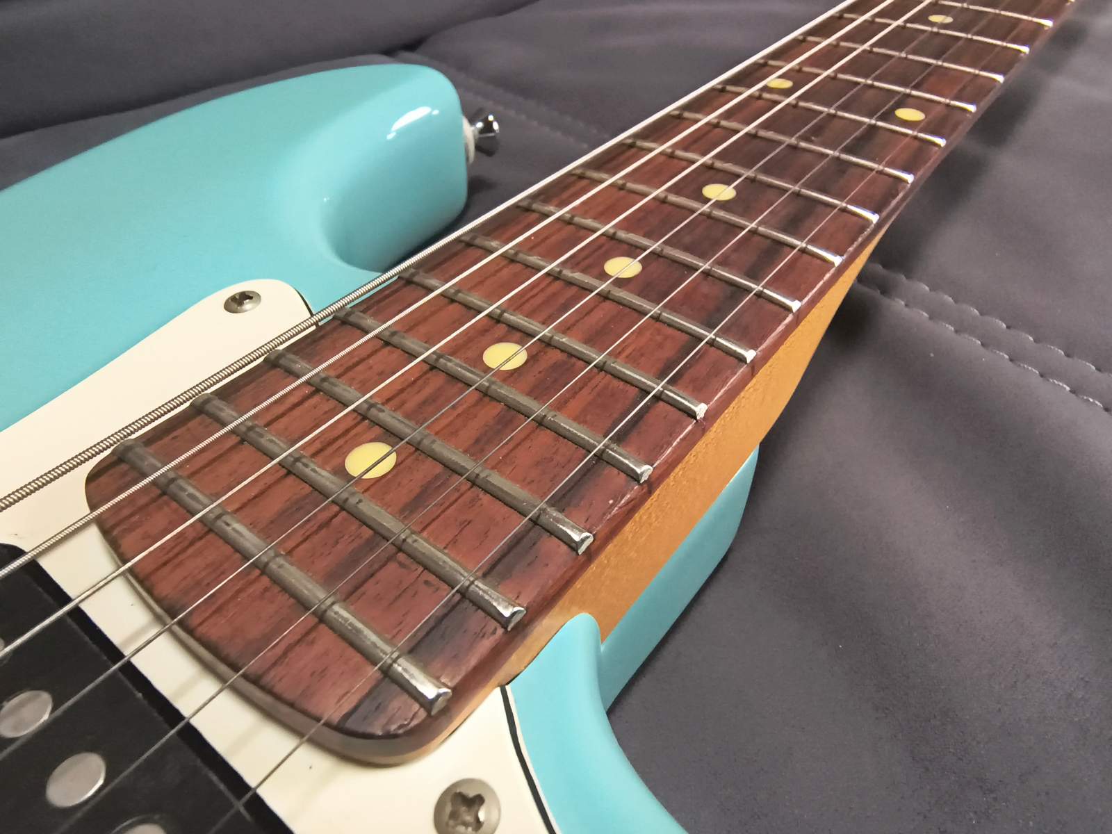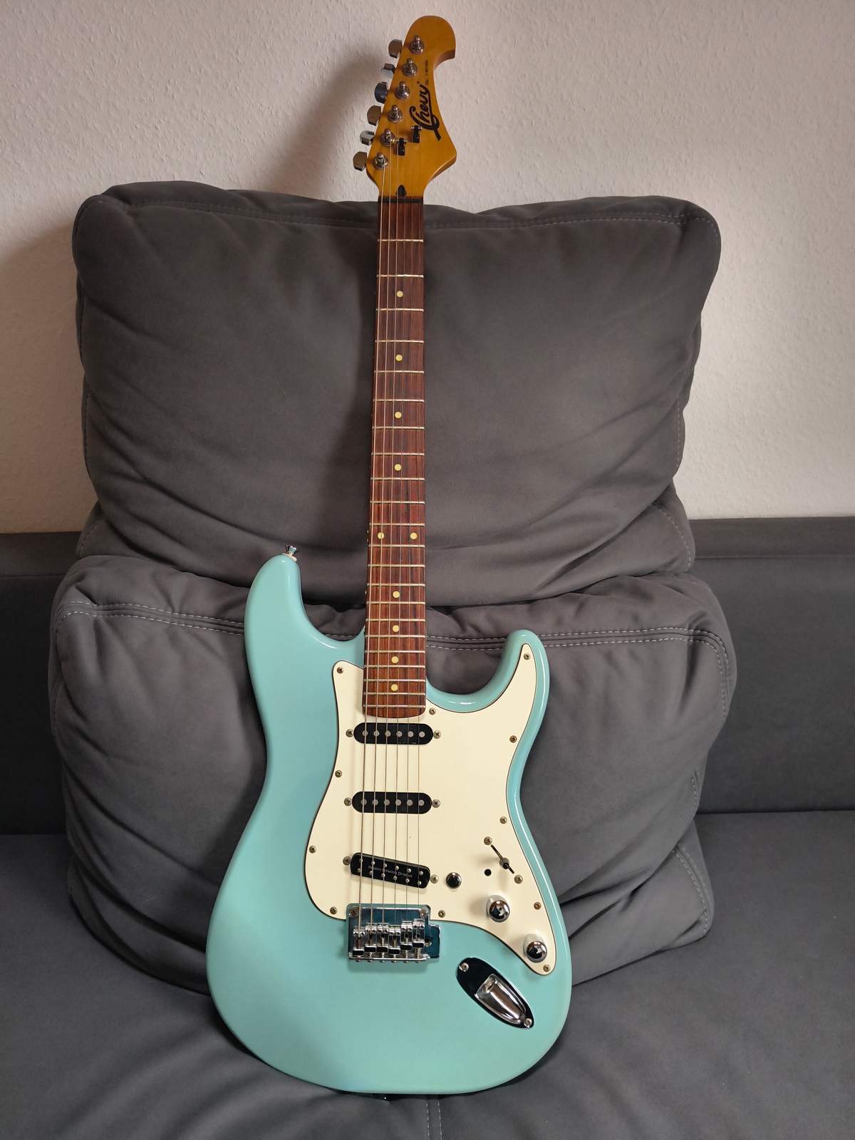 Anfangs hatte die Gitarre noch ein neutrales "Babyblau", aber mit den Jahren hat sich die Farbe des Korpus durch natürliche UV-Einstrahlung richtig schön verändert.
