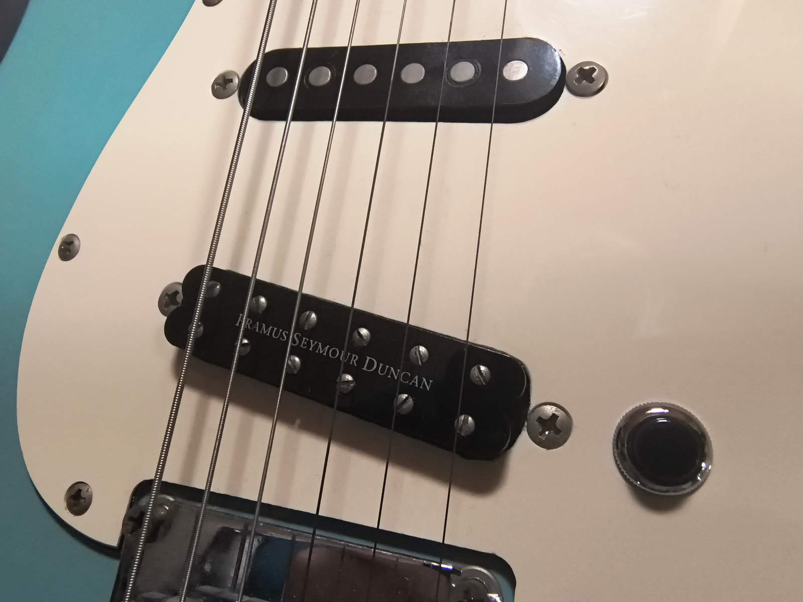 1) An der Stegposition ist nun ein Mini-Humbucker verbaut. Wie auf den Fotos zu sehen ist, handelt es sich um einen "Framus Seymour Duncan", letztlich ein waschechter Seymour Duncan Jeff Beck Junior.