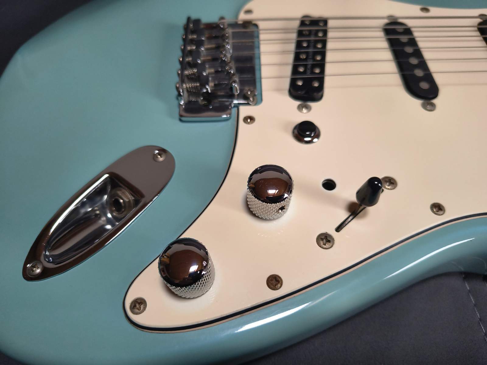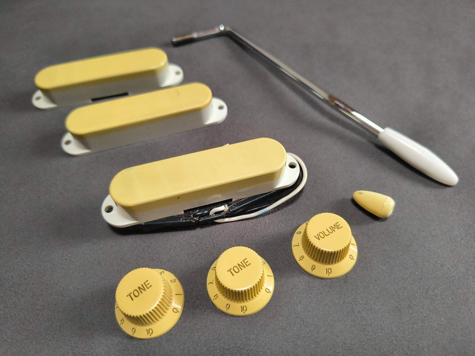 3) Ich komme mit der Position des Volume-Potis einer Strat nicht gut zurecht. Deshalb habe ich die Position frei gemacht und alles auf nur ein Tone-Poti gelegt. Das Poti näher an den Saiten ist das Volume-Poti.