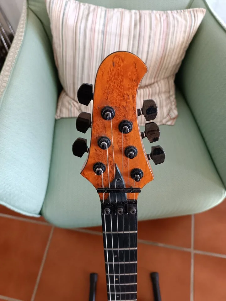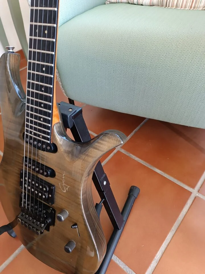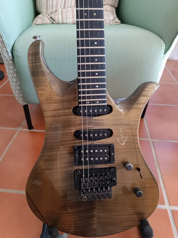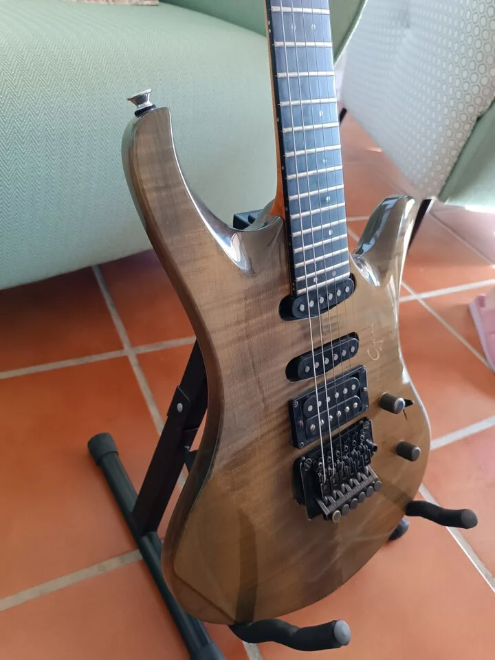 El cuerpo está en frenesí con un toque de llama de arco. Bridge Floyd Rose, fans Gotoh y pastillas Dimarzio.