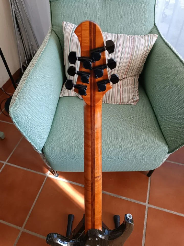Tiene un mástil de arce ojo de perdiz y un diapasón de ébano.