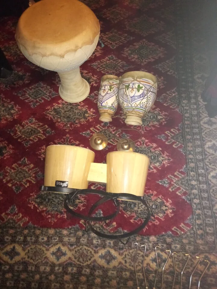 Aus unserem Probenraum biete ich hier dieses Konvolut an. Bei den Bongos von "STAGG" müssten neue Felle aufgezogen werden. Wer sich in dem Bereich einfach mal ausprobieren möchte, nur zu