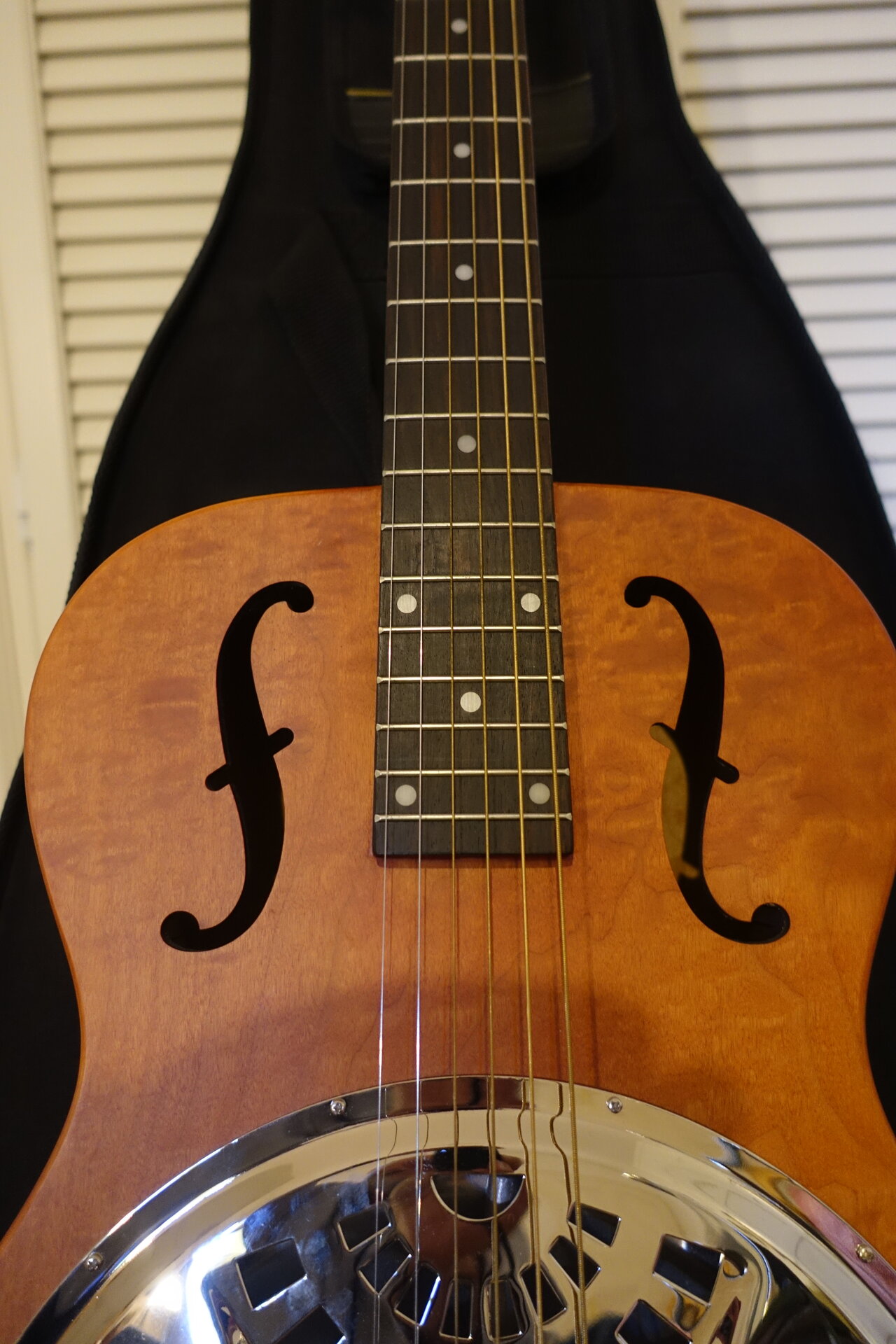 Ich biete eine Resonatorgitarre, Marke Dobro, an. Sie hat einen Holzkorpus, einen Spider-Resonator und einen Round-Neck. Die Gitarre ist gebraucht, aber in tadellosem Zustand, lediglich die Halsrückseite wurde zur besseren Bespielbarkeit glatt geschliffen. Sie ist leicht spielbar und klingt, wie eine Resonator-Gitarre klingen muss - voll und laut. Dank der gekapselten Mechaniken ist sie leicht und stabil stimmbar.