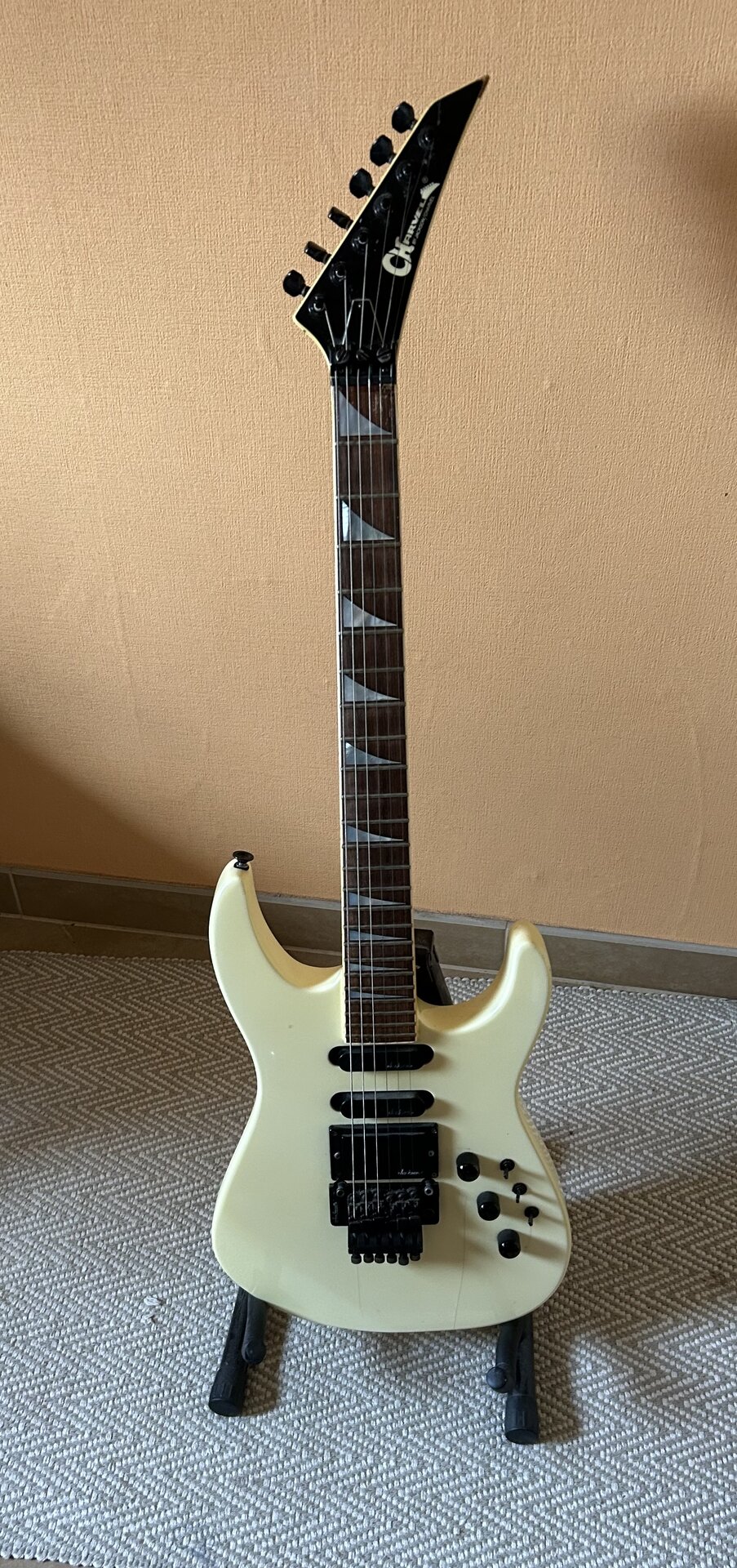 • Ästhetik: Einfarbige Lackierungen und gebundener Hals und Kopfplatte, mit typischem schwarzen Jackson-Headstock mit Charvel-Schriftzug.