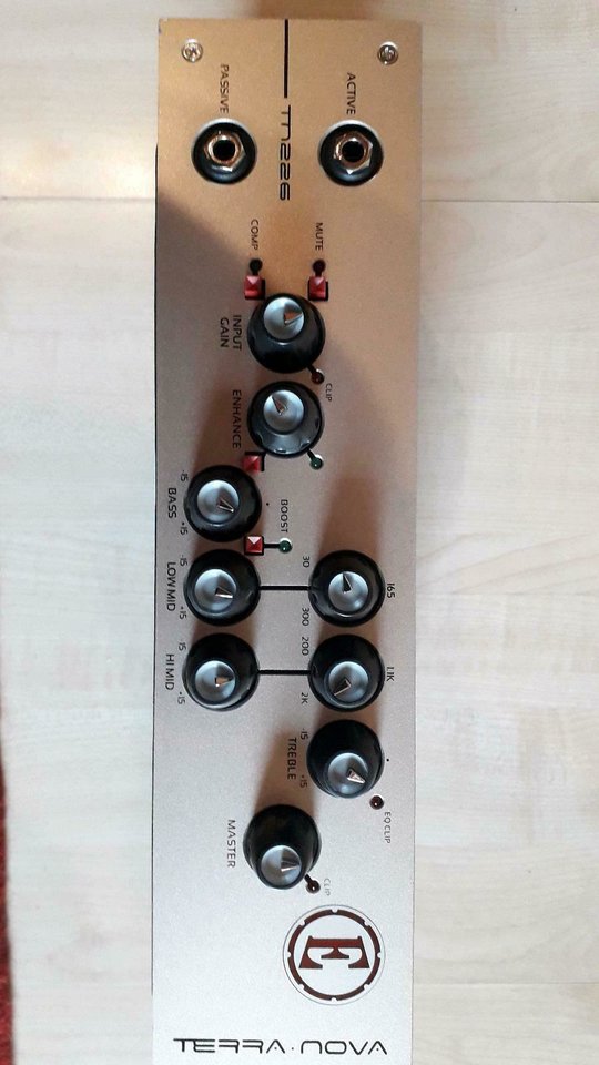 Bedienelemente: Input Gain-Pegelregler, 4-Band-EQ-Schaltung mit semiparametrischen Mittenreglern, Kompressor mit On/Off-Regler, Bass Boost, Enhance EQ Sweep, Master Volume-Regler, Mute-Schalter