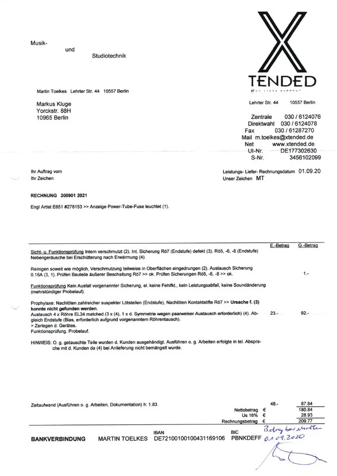 Der Amp ist technisch und optisch in einem super Zustand. Alle Potis und Schalter funktionieren einwandfrei. Der Amp wurde gut geschützt im passenden Case transportiert und gelagert. In 09/2020 wurde er einem technischen Check unterzogen und hat komplett neue Endstufenröhren (4xEL34) samt Bias erhalten. Seitdem wurde er insgesamt maximal 5 Stunden gespielt.