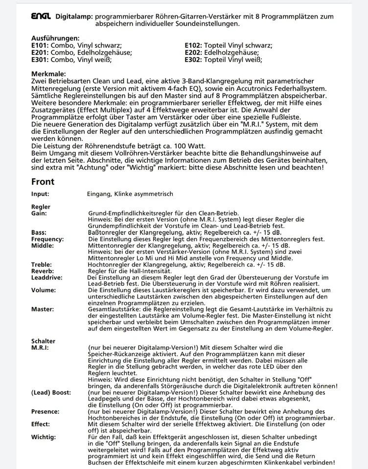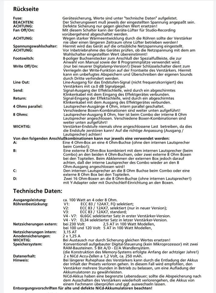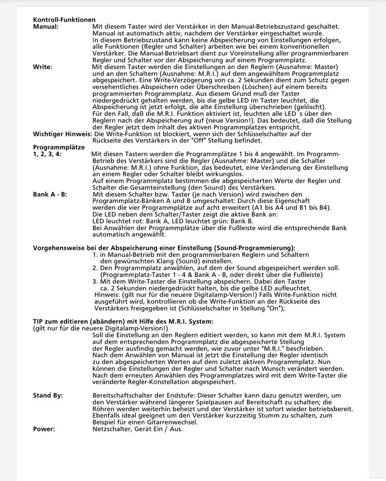 Programmierbarer Röhrenamp mit 8 Speicherplätzen um seine eingestellten Sounds abzuspeichern. Voll funktionsfähig, steht bei mir jedoch nur herum und ist dafür zu schade.