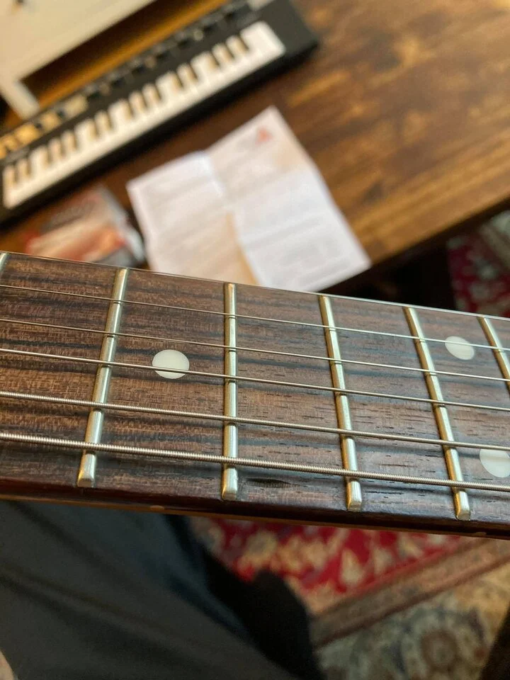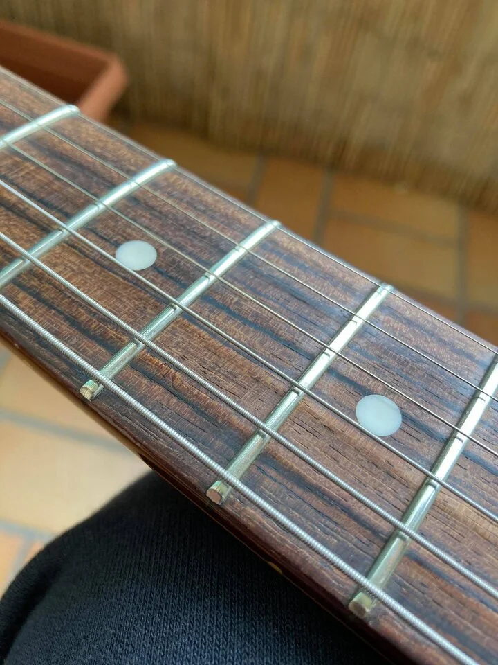 Es gibt eine kleine Macke im Fretboard. Vermutlich war sie ab Werk schon drin; hat allerdings keinen Einfluss auf die Bespielbarkeit und ist nicht hörbar.