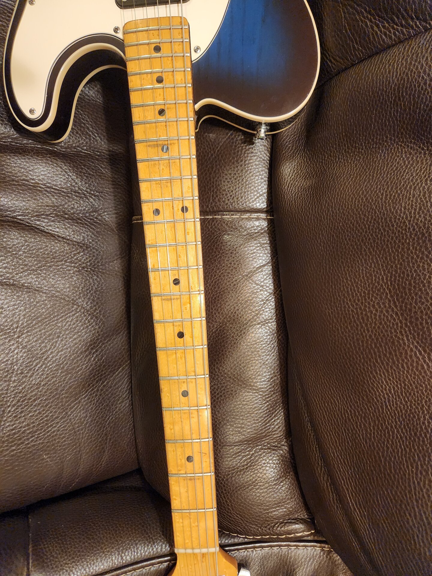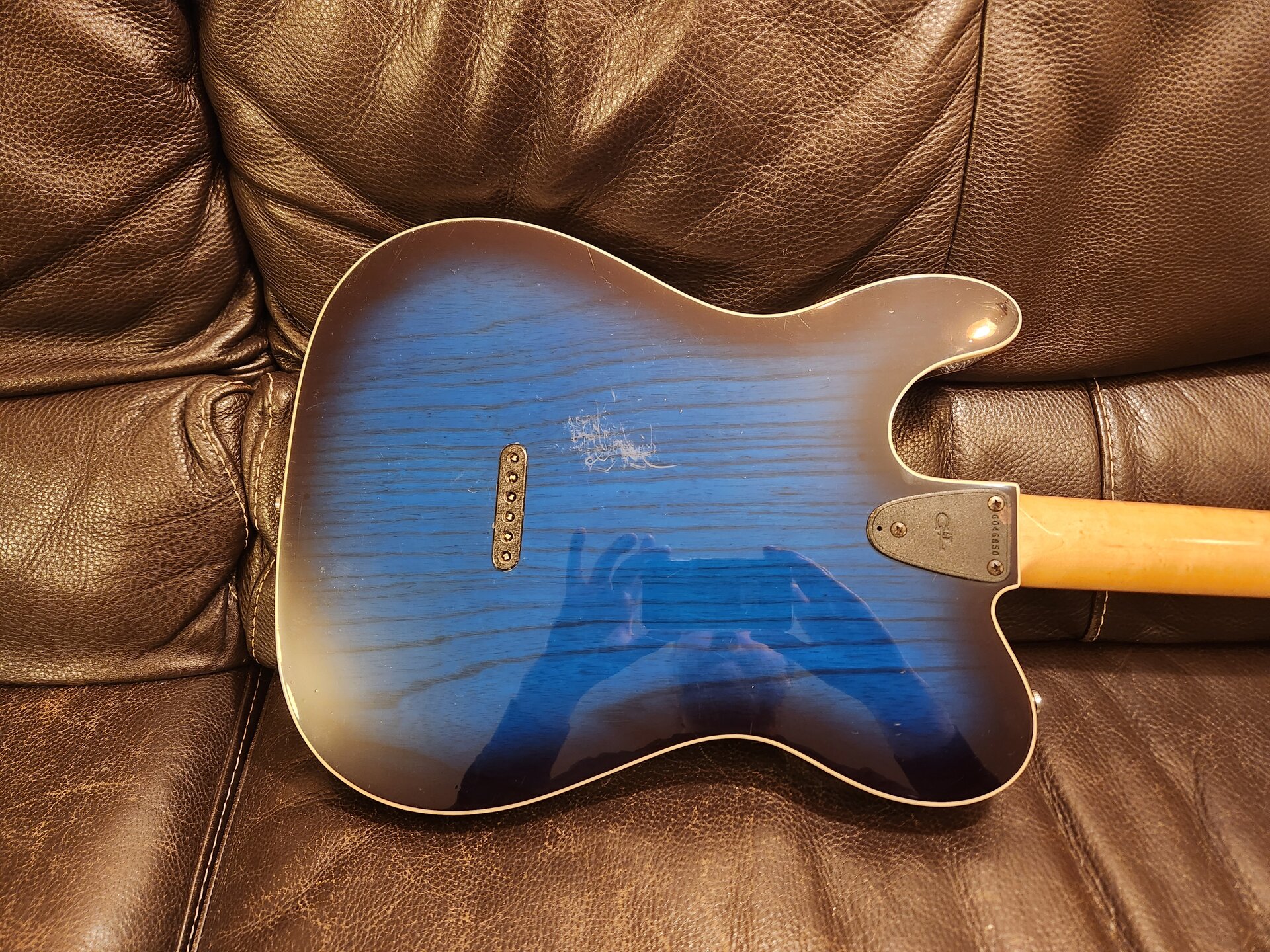 . Mit den originalen und oft gesuchten G&L-Pickups klingt sie wunderbar, ist vielseitig, liegt gut in der Hand und ist einfach eine tolle Gitare. Sie ist von Anfang der 90er Jahre, wiegt 3,4 kg und wurde von mir sehr gerne und viel gespielt, im Studio und live (vom Jazzclub um die Ecke, Gigs in New York oder Paris bis Nürburgring), ein paar Dings und Dongs hat sie abbekommen (andere geben zusätzliches Geld für Relic-Gitarren aus, hier ist alles ehrlich on the road entstanden