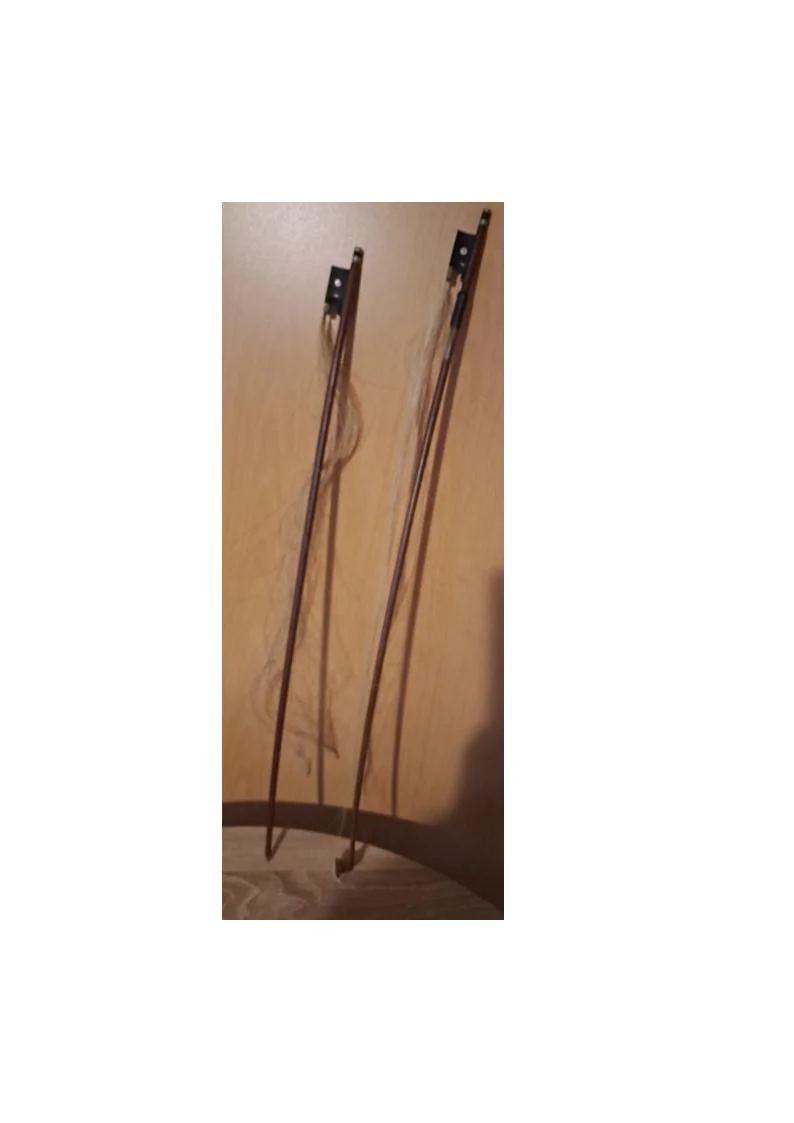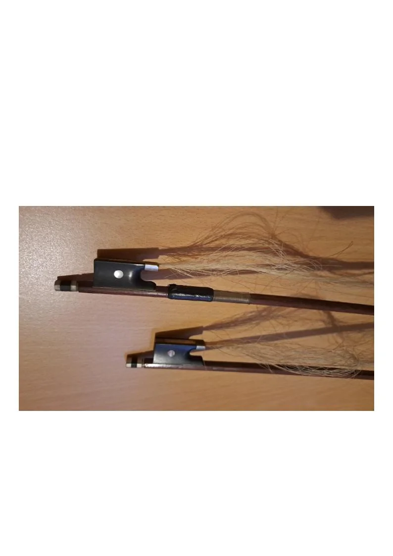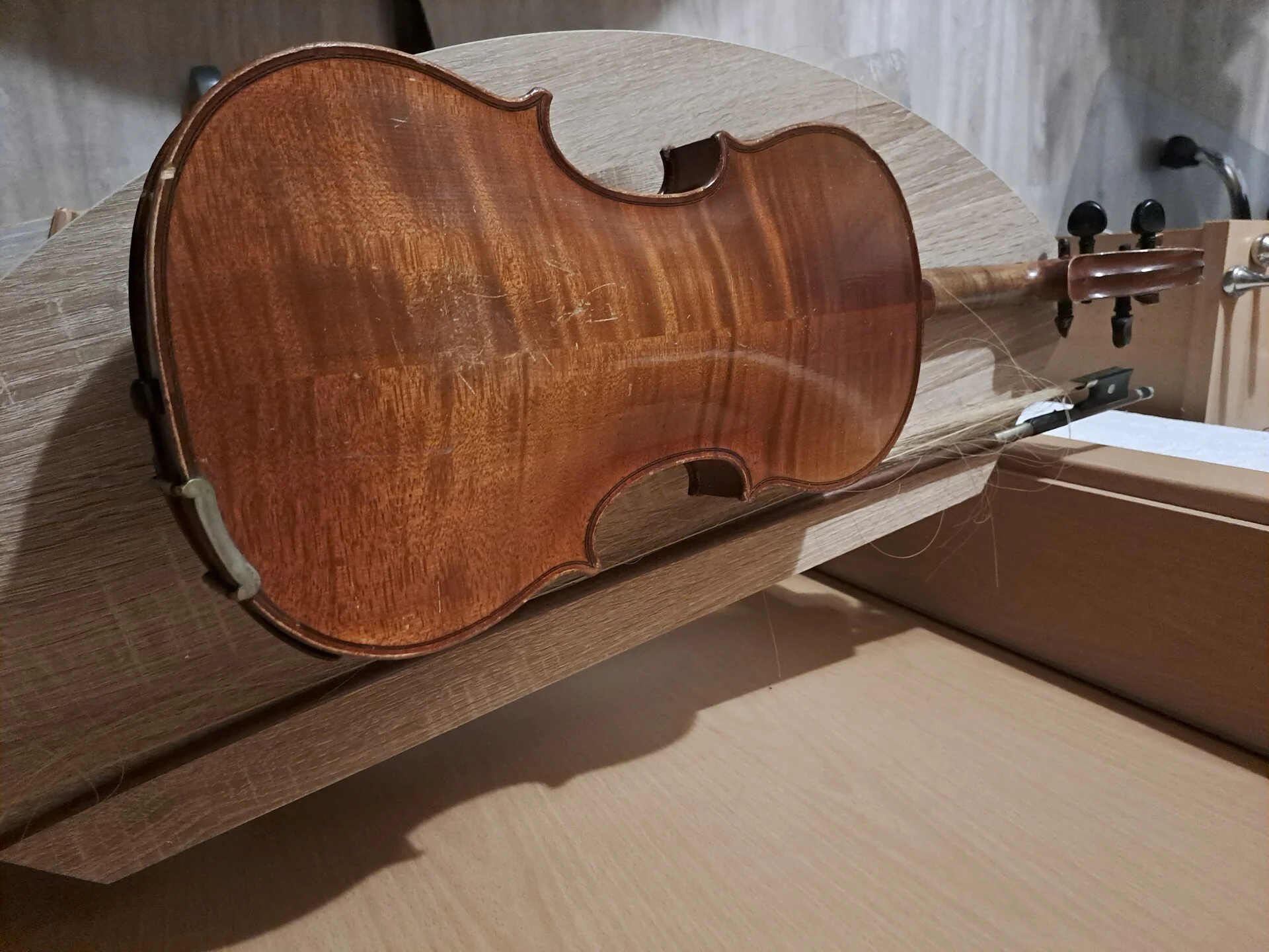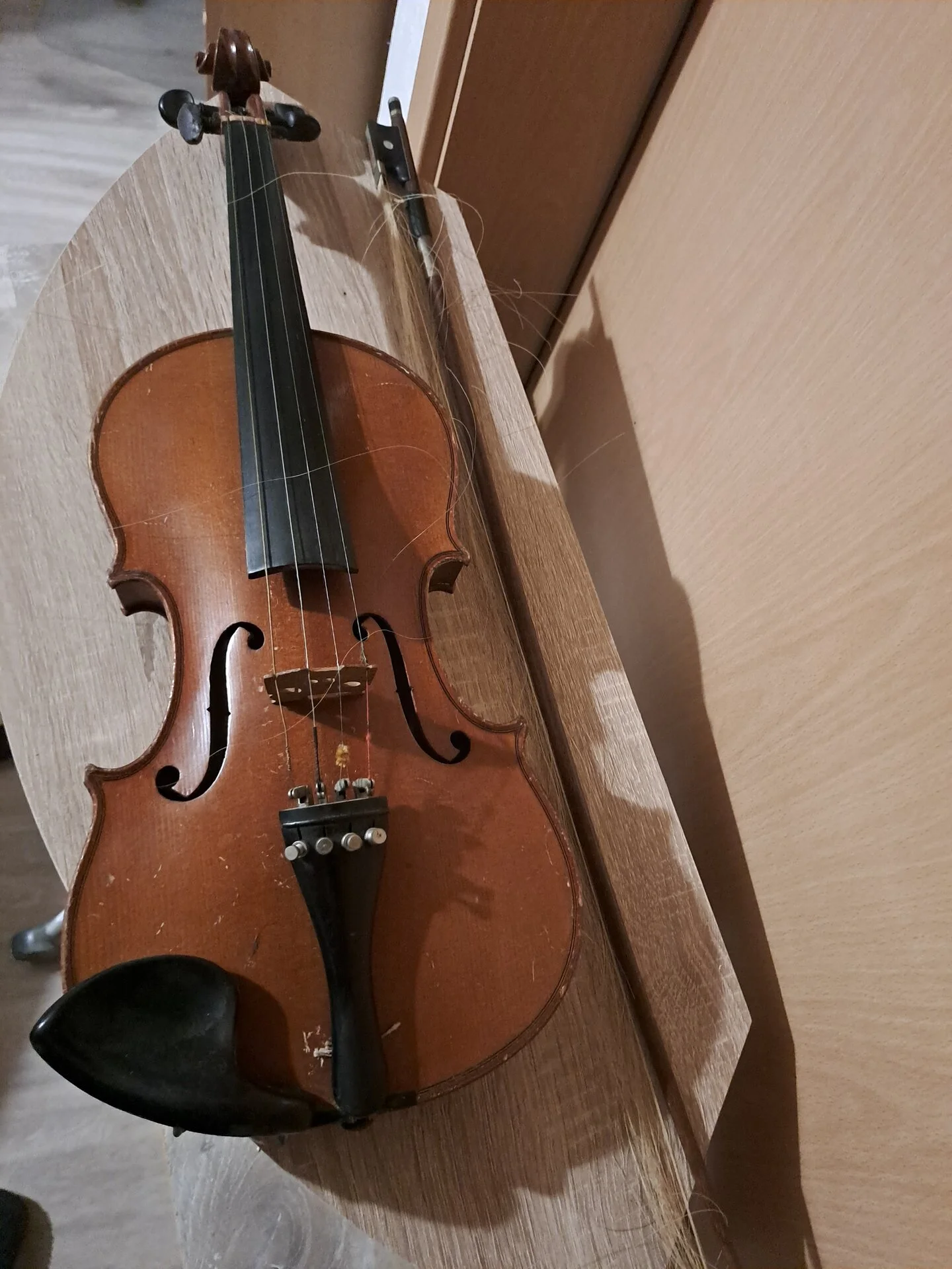 Geige mit Gebrauchsspuren, wobei ein Bogen einer Neubespannung bedarf. Das Instrument weist keine Funktionsbeeinträchtigungen auf, es wird jedoch eine Überholung empfohlen, die insbesondere den Lack, Bogenbespannung und einen Geigenwirbel umfasst.