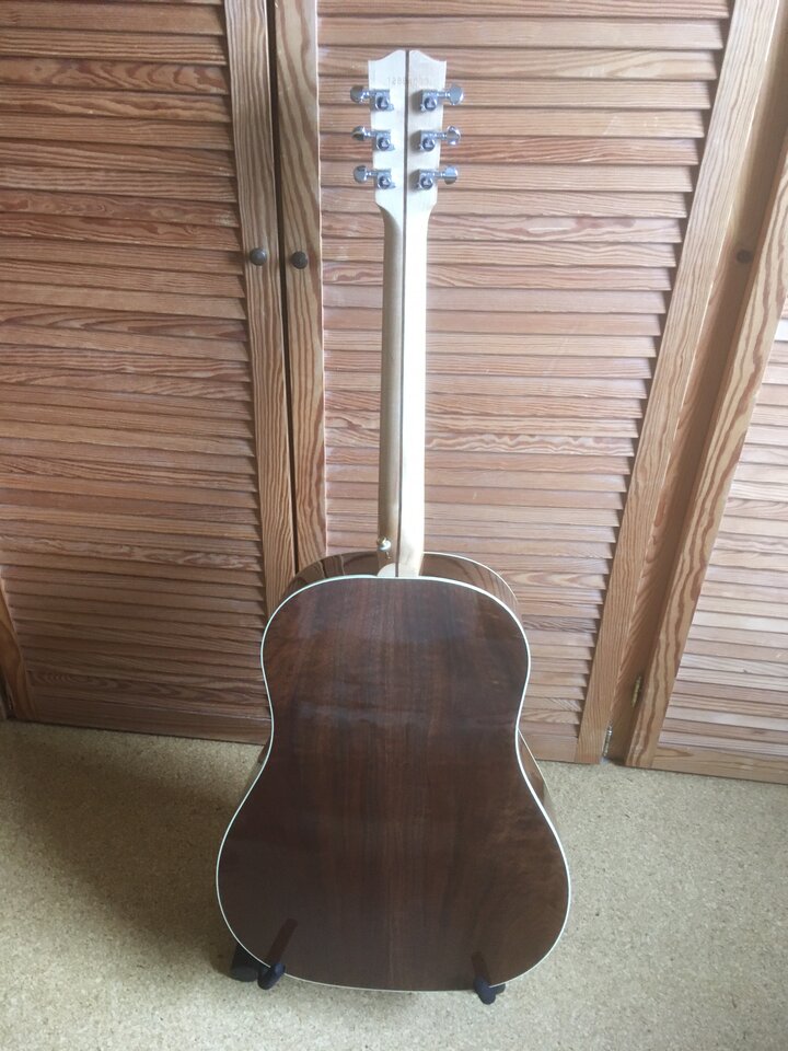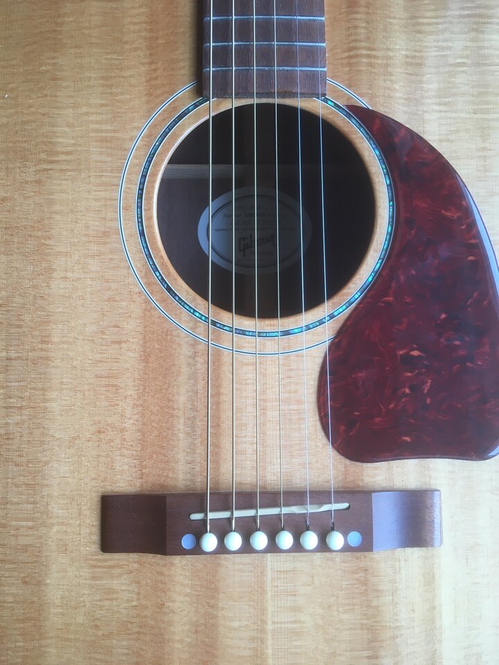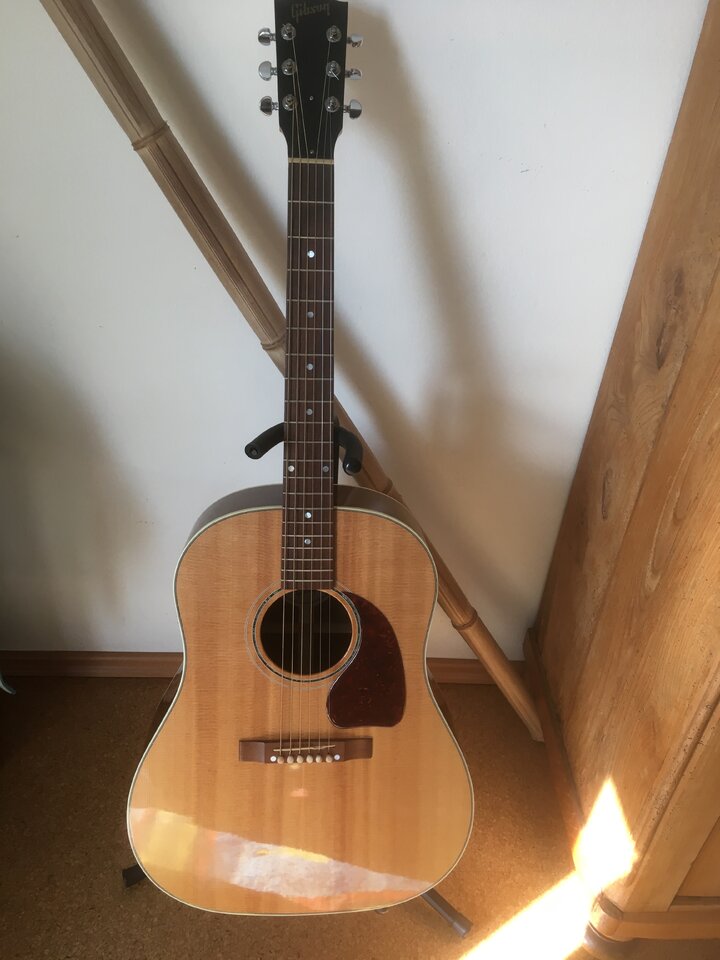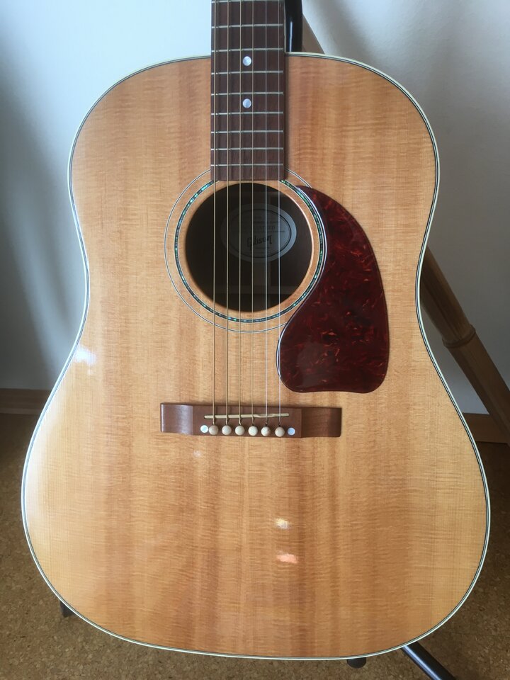 Die von mir angebotene Gibson J-15 stammt aus dem Jahr 2014. Da die Gitarre (vor mir) einem Sammler gehörte, der sie kaum spielte, ist sie so gut wie neu, in optimalem Zustand, aber mittlerweile eingespielt. Die Fichtendecke bekommt langsam Farbe und wird jeden Tag schöner.