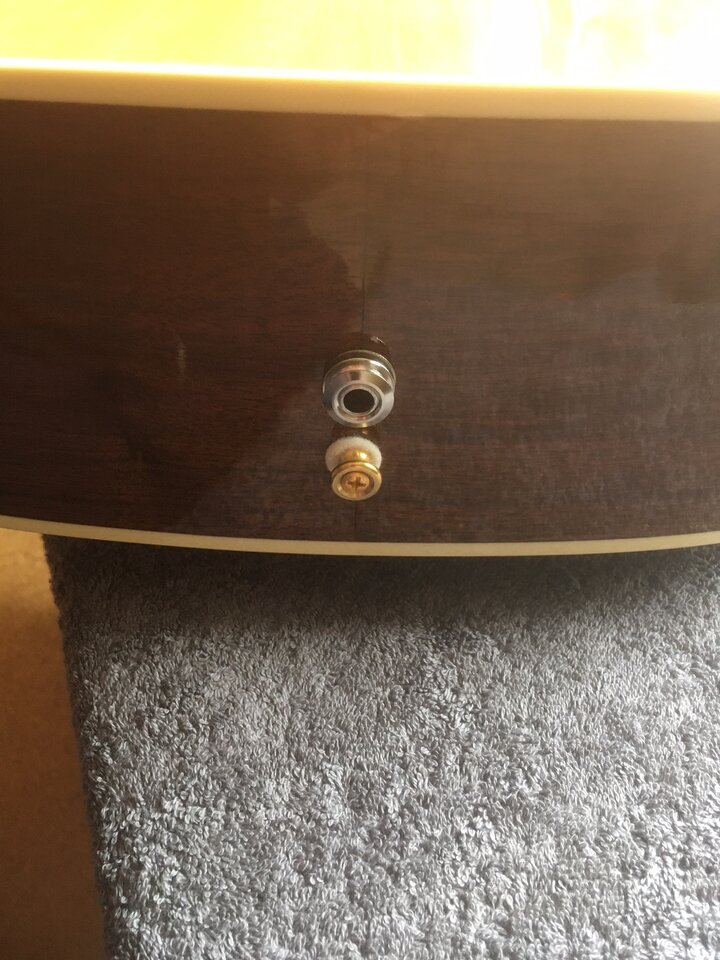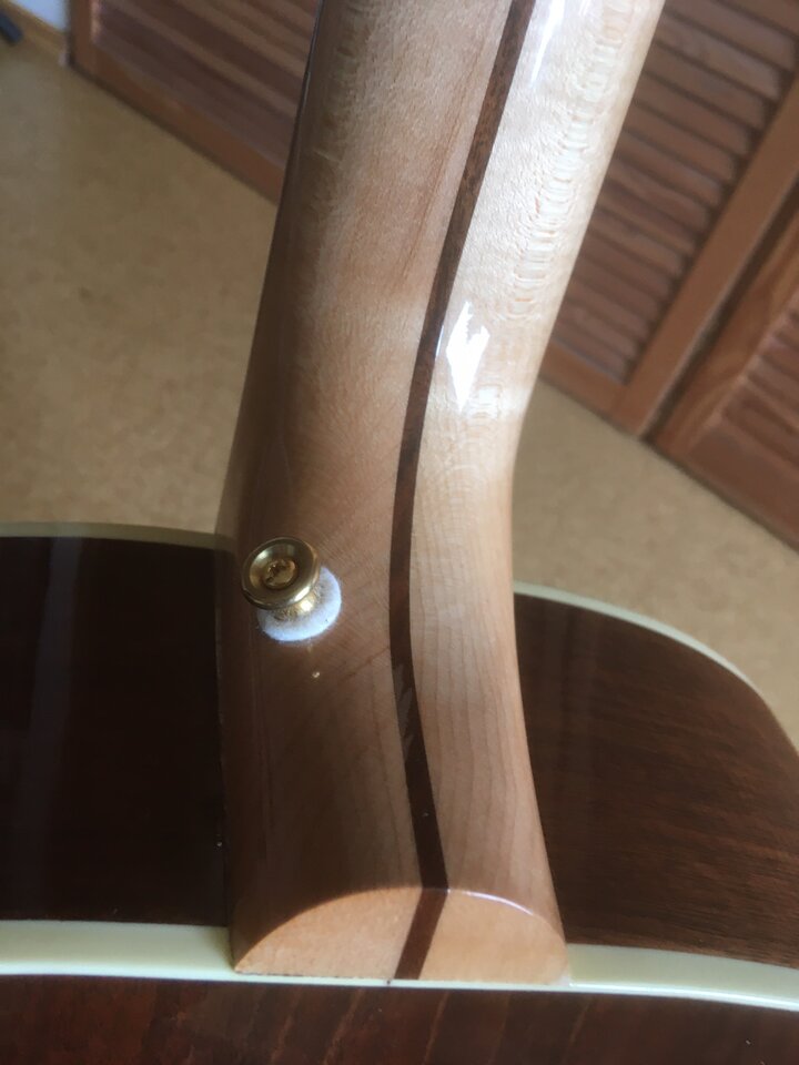 Upgrades: Die Saitenlage ist sehr flach eingestellt. Es wurden zwei Gurtpins angebracht und der Piezo-Pickup wurde durch einen hochwertigen passive Ceramic Transducer ersetzt.