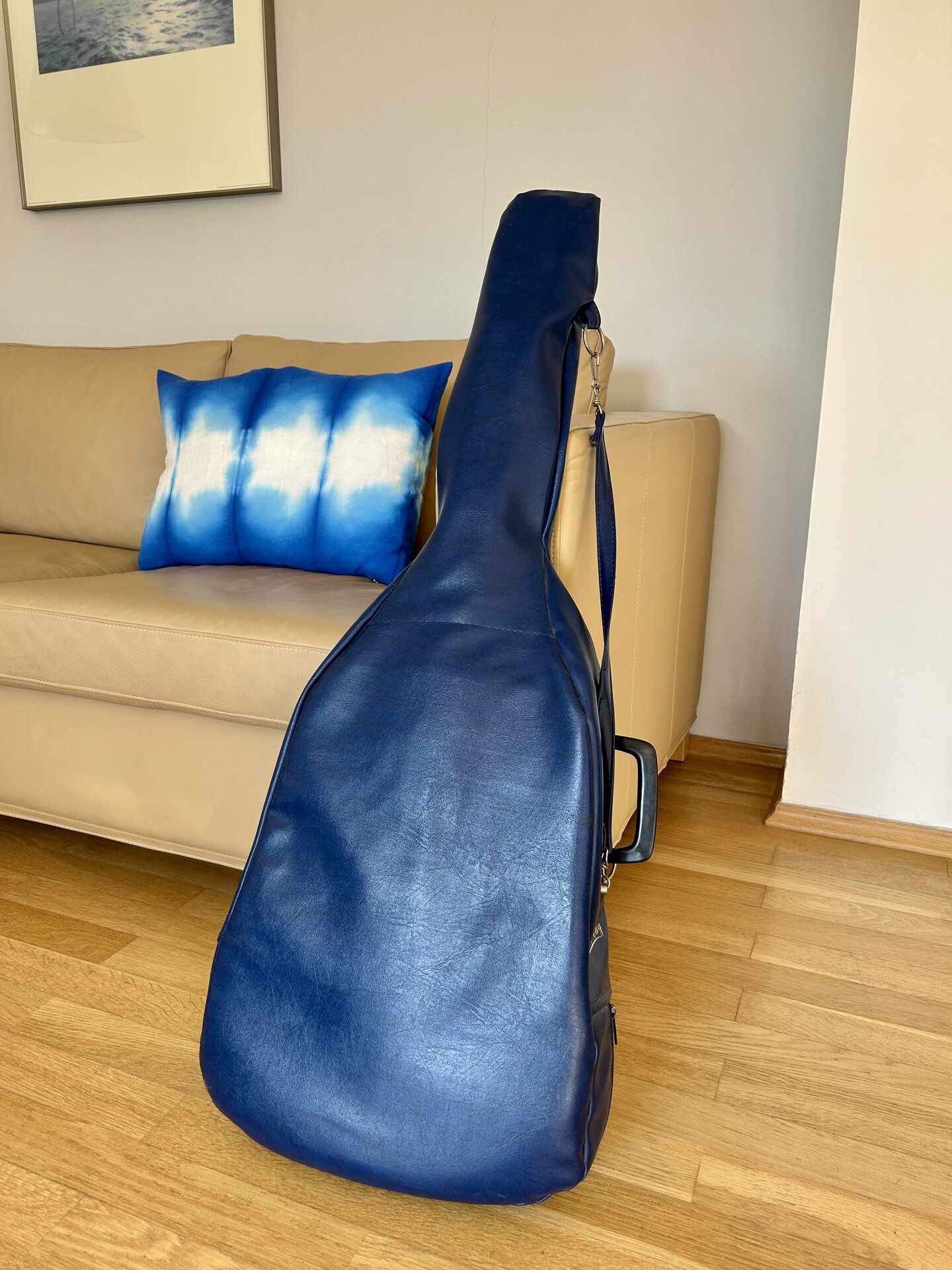 Die Gitarre wir inklusive einer blauen Kunstledertasche verkauft.