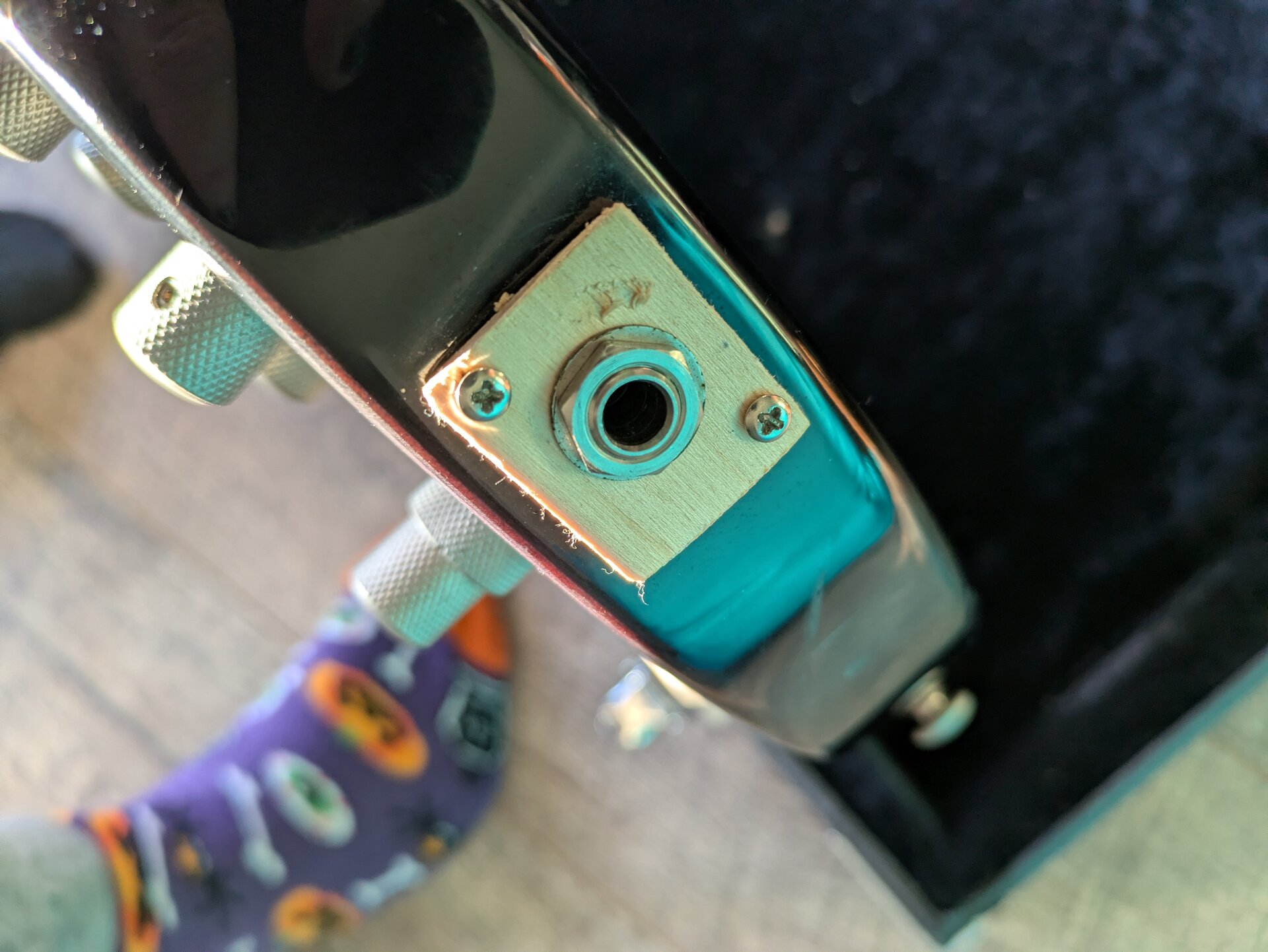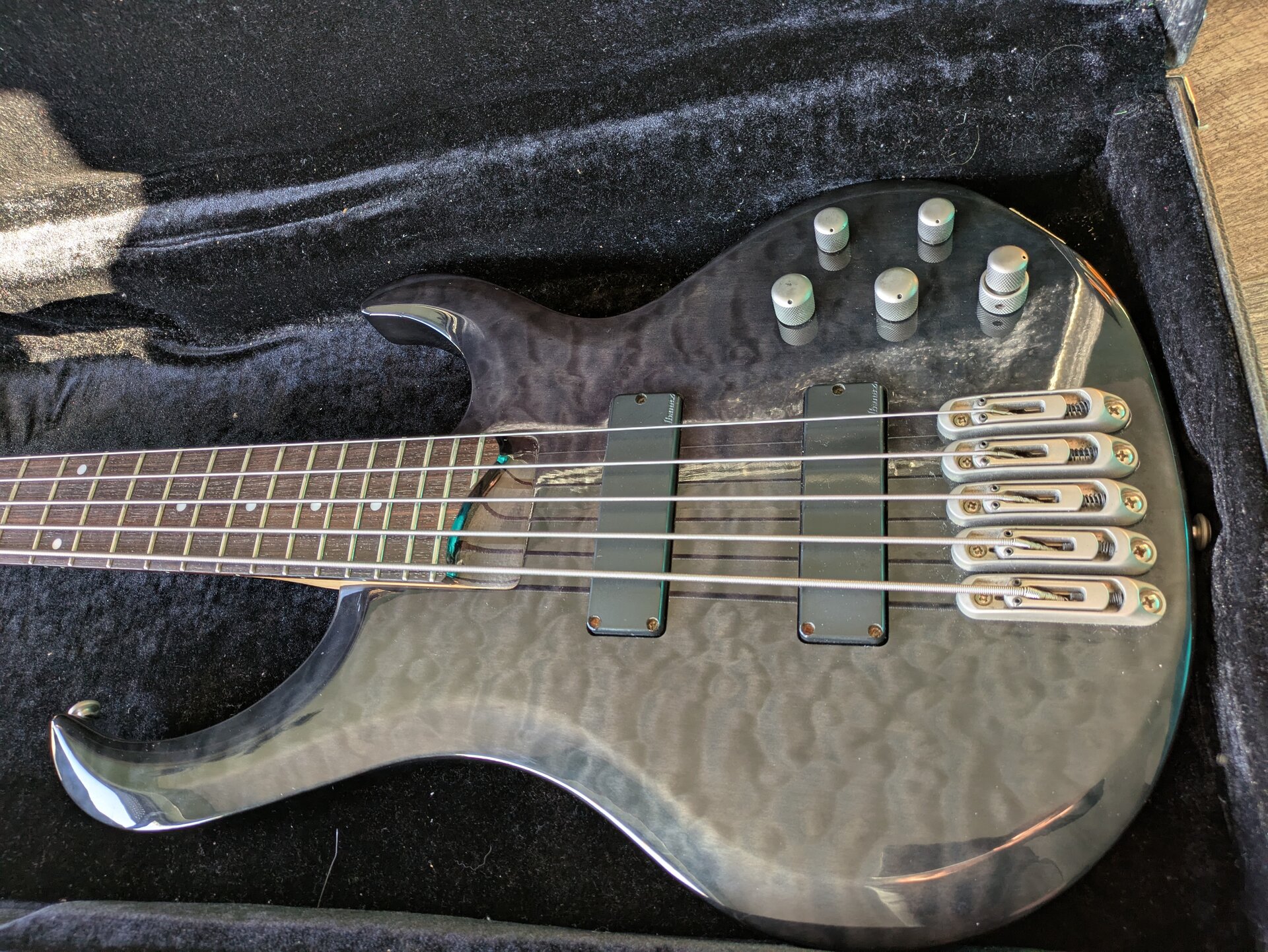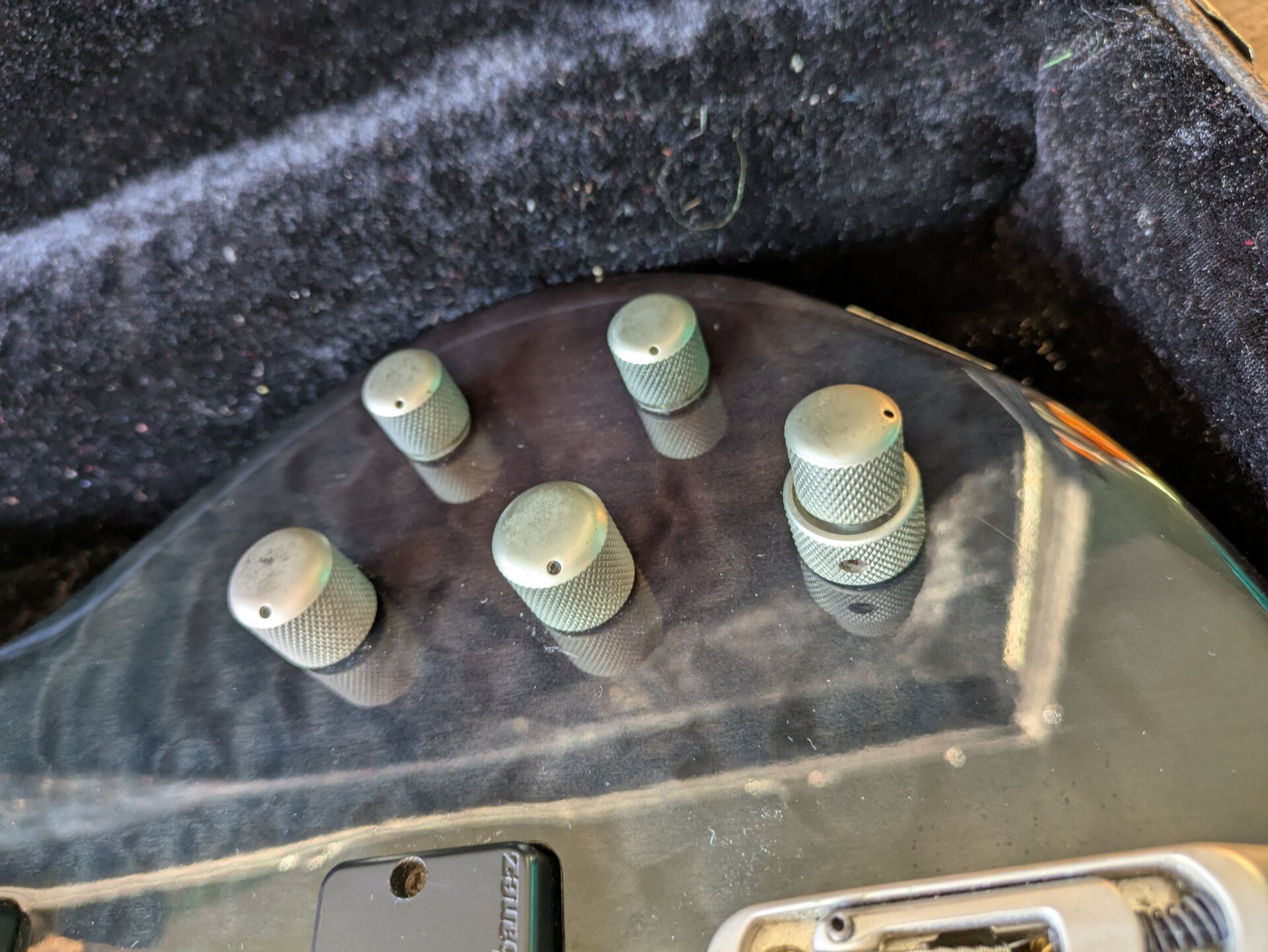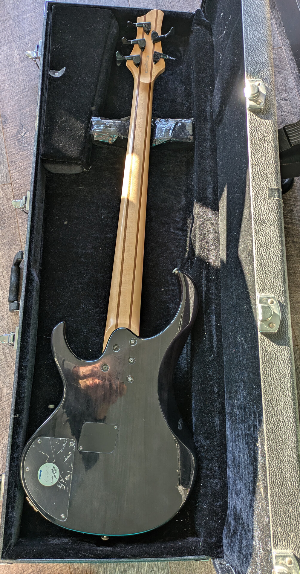 Ich bin Zweitbesitzer, der Vorbesitzer hat den Bass viel gespielt, daher alle Spielspuren (siehe vor allem Bild von der Rückseite). Die Klinkenbuchsenplatte war irgendwann nicht mehr fest zu bekommen, die "Notlösung" hält seit Jahren und ich tausche das jetzt nicht nur für den Verkauf. Die original Mechaniken waren nicht mehr zu gebrauchen, deswegen sind neue von Warwick dran, leider gab es die nicht in dem Satin-Look. Außerdem hat mir thomann damals eine falsch geschickt, sieht doof aus, funktioniert aber tadellos. Das Mid-Poti hat auch vom Vorbesitzer mal einen Hau abbekommen und ist schief - funktioniert aber. Der Koffer gehört dazu. Aktuell sind 135er drauf und der Bass ist einen Ganzton tiefer gestimmt.