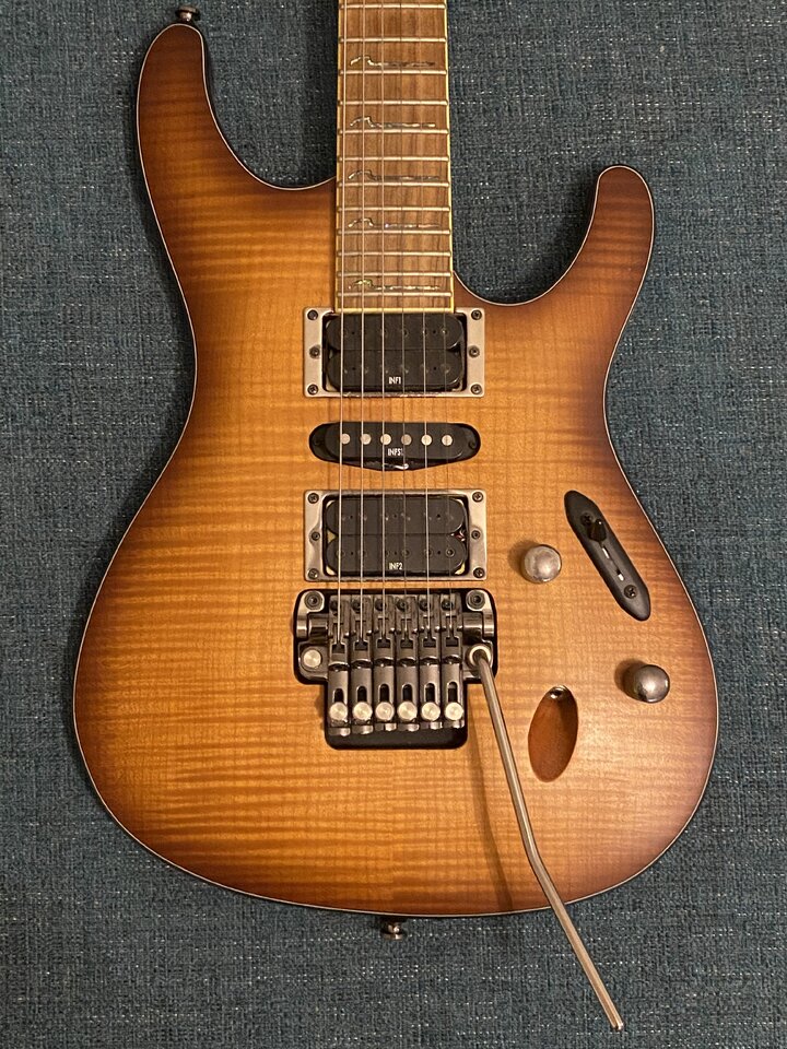Schweren Herzens biete ich hier eine Ibanez S770FM im Top-Zustand zum Verkauf an. Lediglich eine Stoßstelle außerhalb des Sichtbeteichs ist vorhanden (Bilder gerne auf Anfrage).