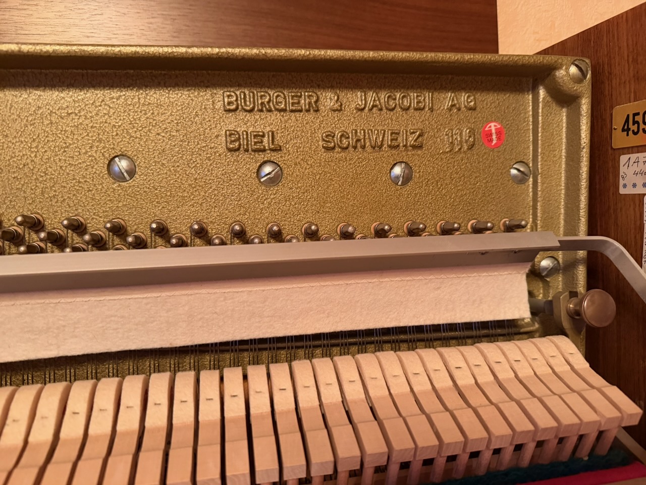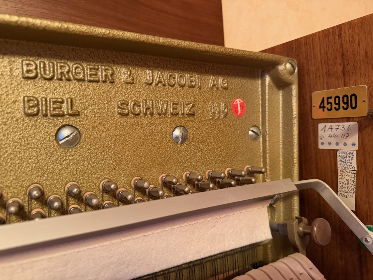 Verkaufe Schweizer Qualitätsklavier Burger & Jacobi aus 1980 (Seriennr. 45990). Sehr guter Zustand, regelmäßig gestimmt (zuletzt 2021), spielbereit. Höhe ca. 116 cm, Oberfläche Nussbaum. Mit Klavierhocker. Abholung in Duderstadt.