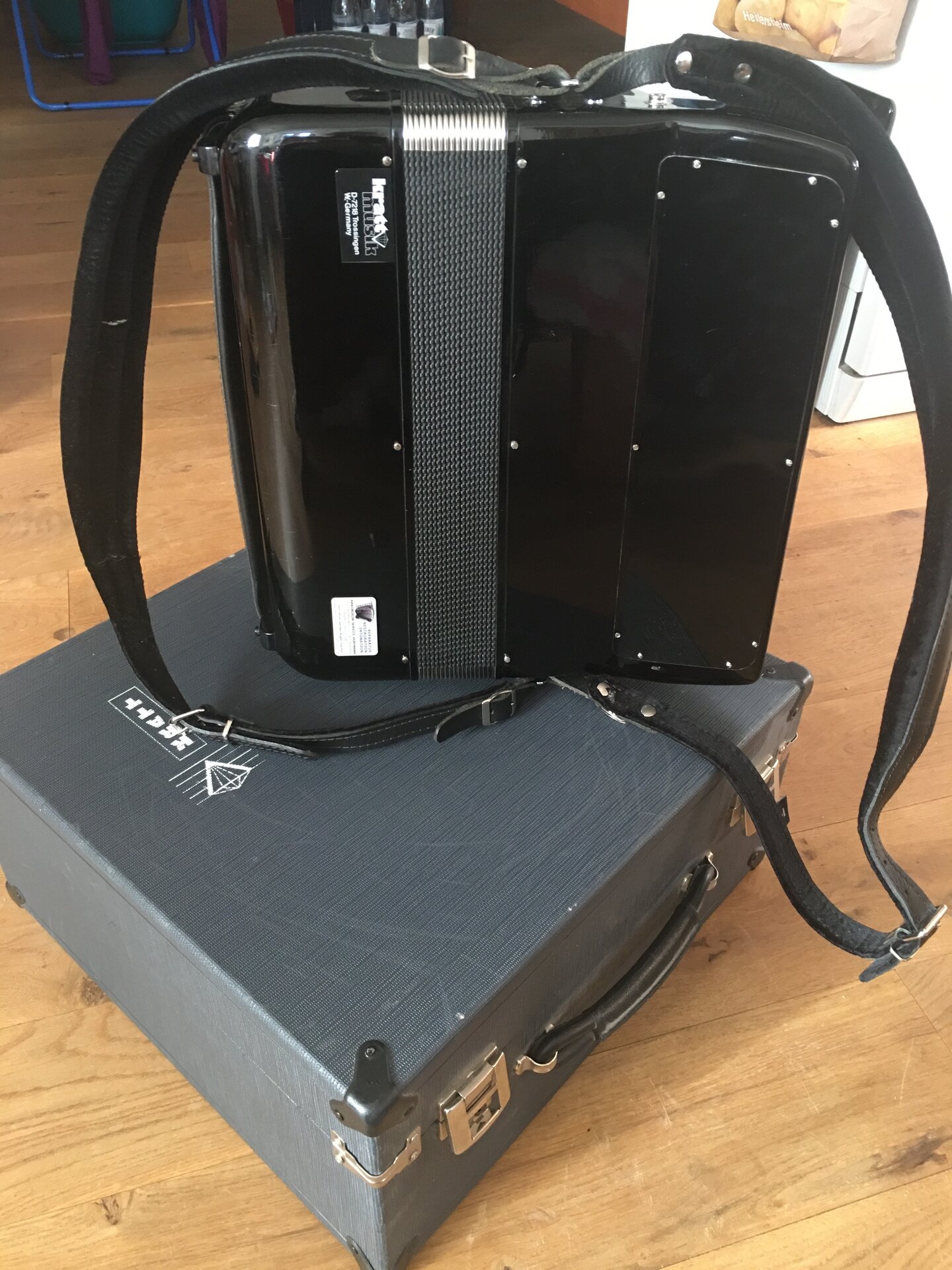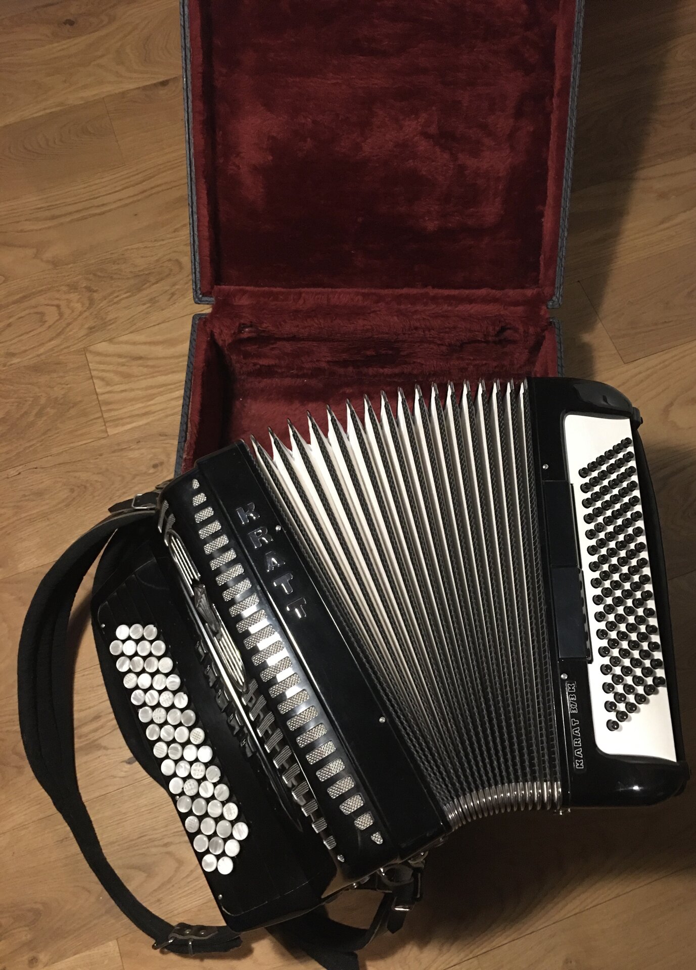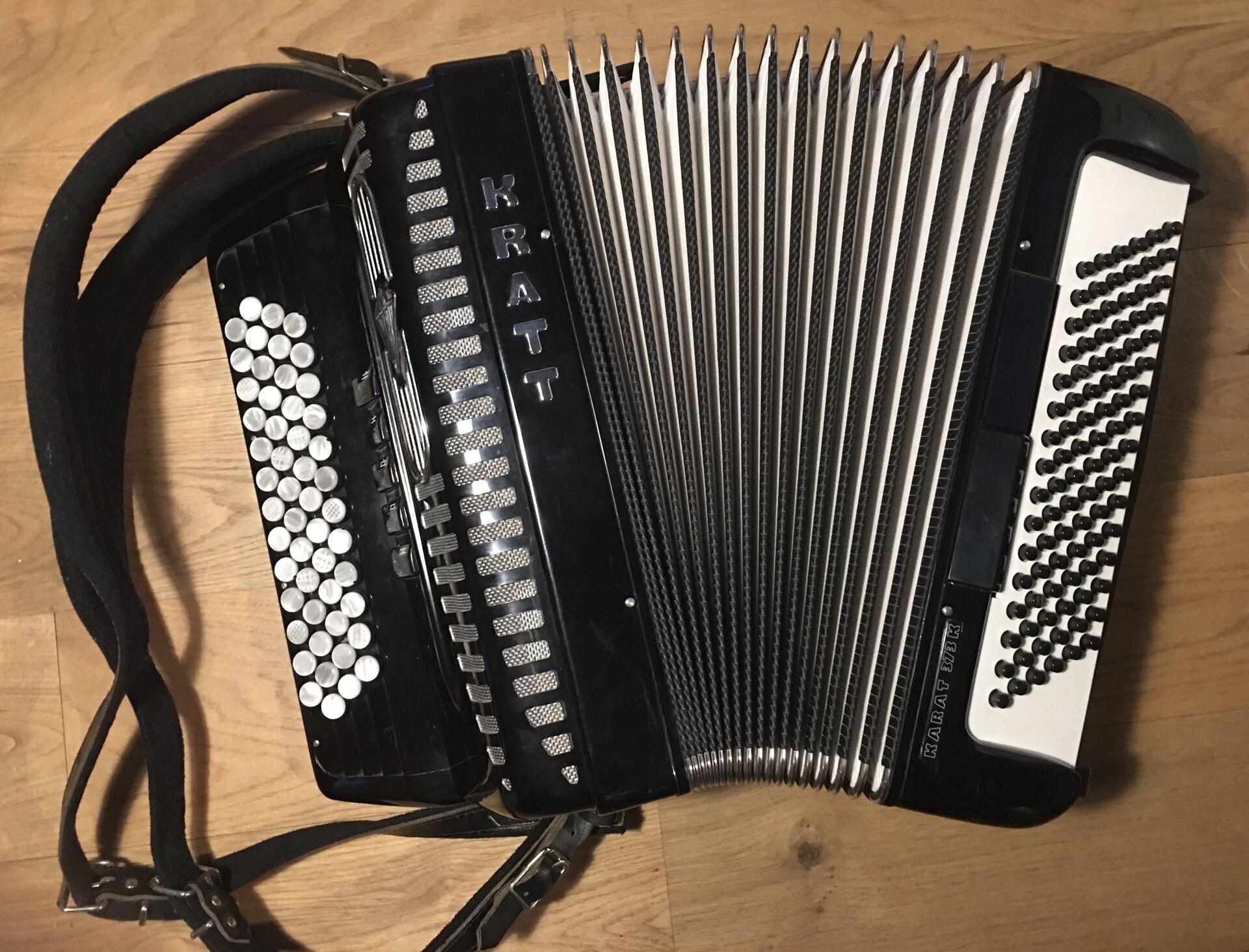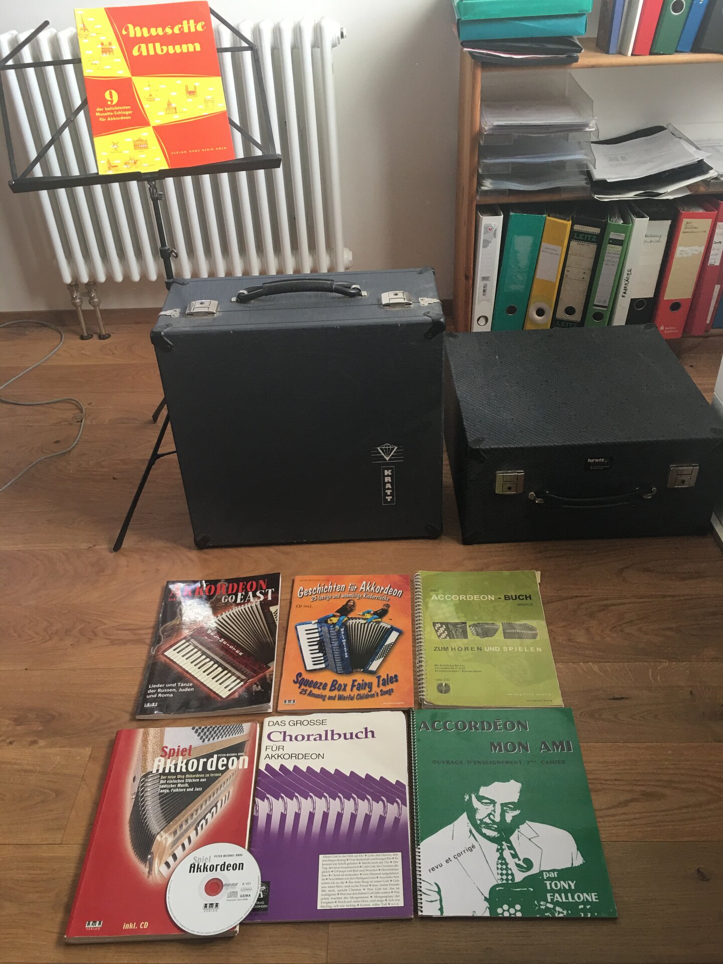 Zwei gleiche Knopfakkordeon KRATT 373 K mit Originalkoffer: C-Griff, 3 Chöre/5 Klangregister, 96 Bässe, Balg dicht und ohne Geruch, da niemals im Keller oder auf dem Dachboden gelagert, aus rauch- und tierfreiem Haushalt, geringes Gewicht (8 Kg), Schultergürtel in gutem Zustand, mit Noten und Notenständer, Verkaufsgrund: Musikaufgabe wegen beidseitiger Handgelenksarthrose.