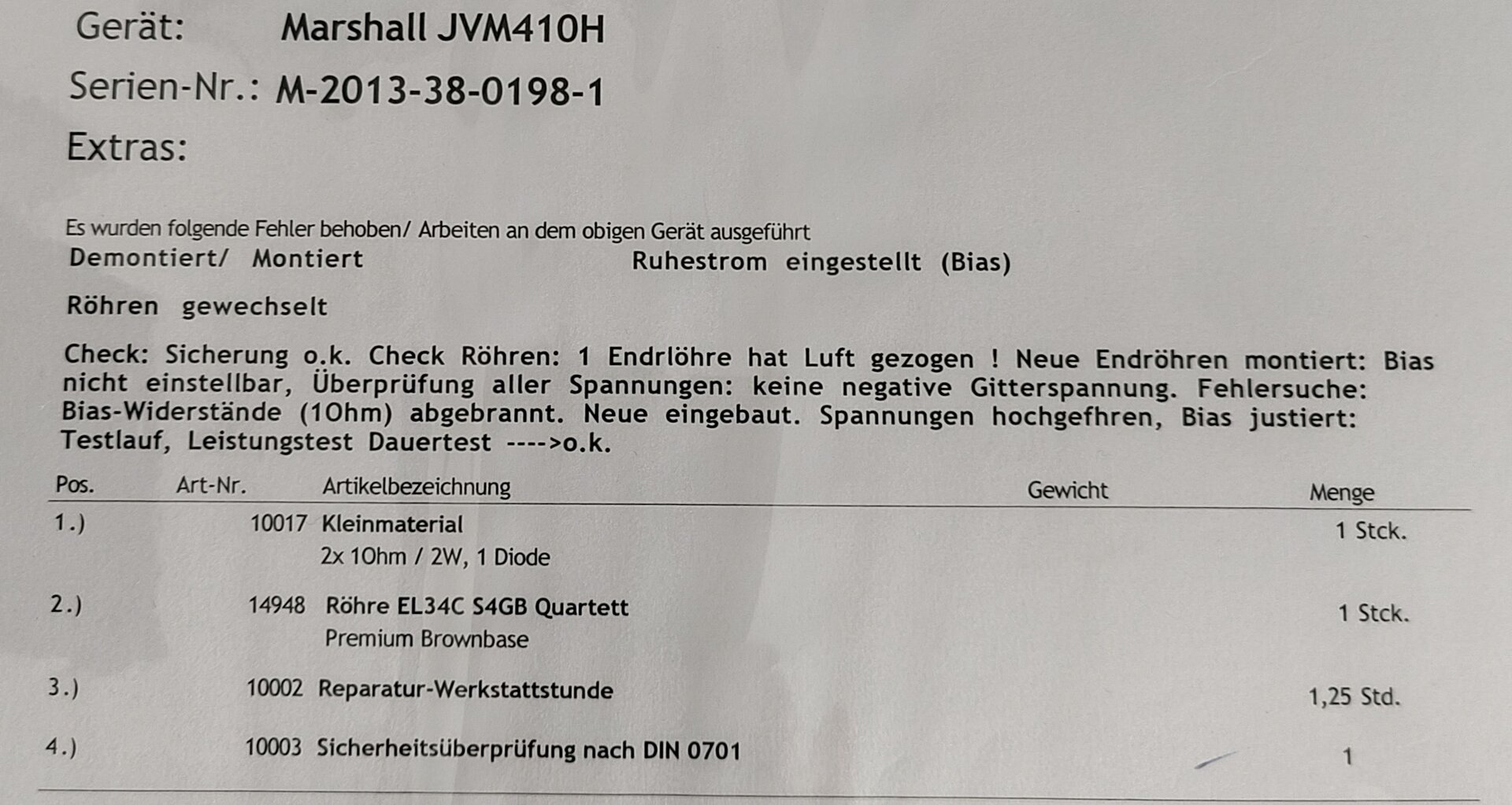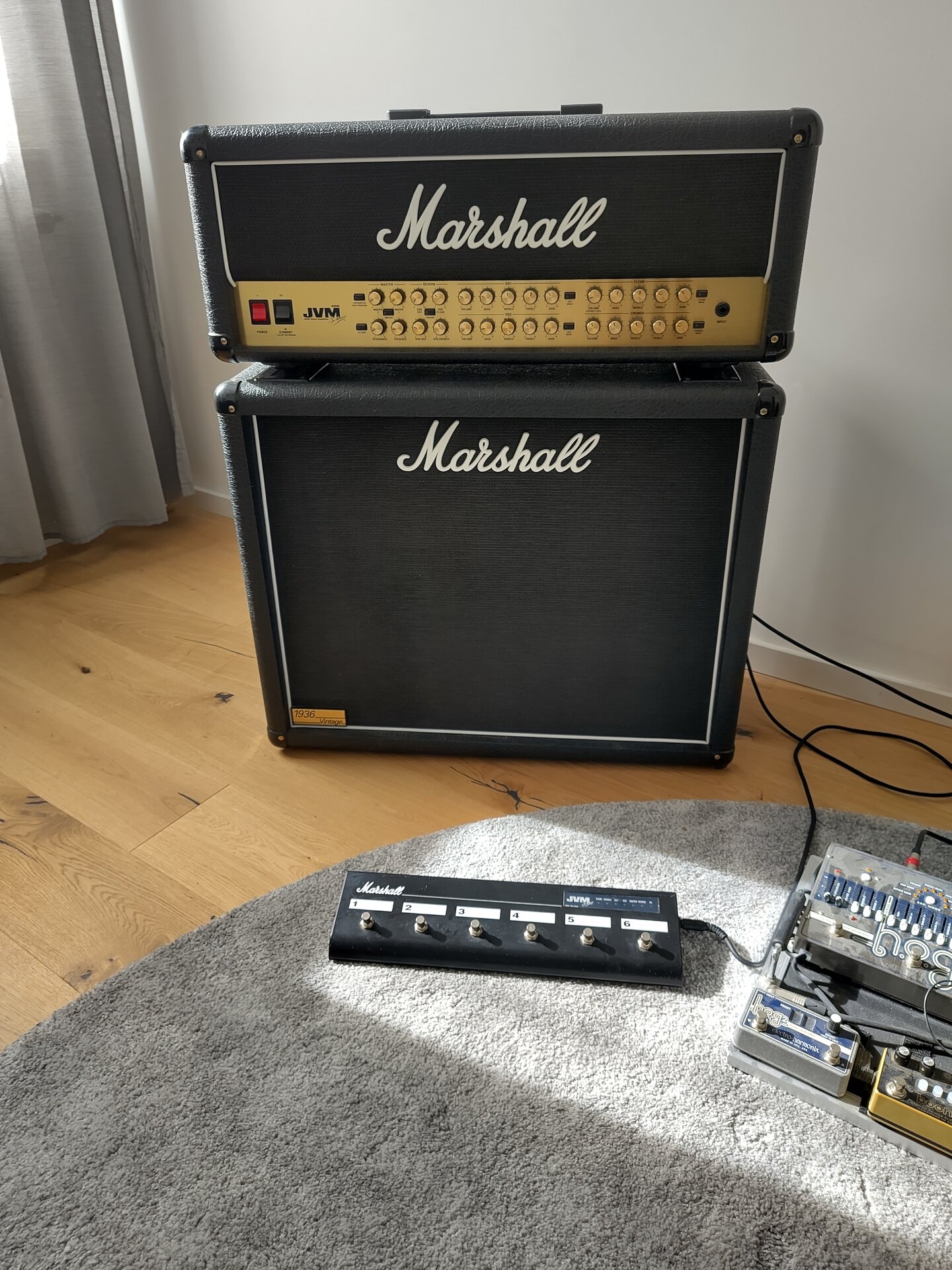 Verkaufe meinen Marshall JVM410H inklusive 2x12 Box. Revision erfolgt (s. Foto, 4 neue Röhren EL34C S4GB, Premium Brownbase):