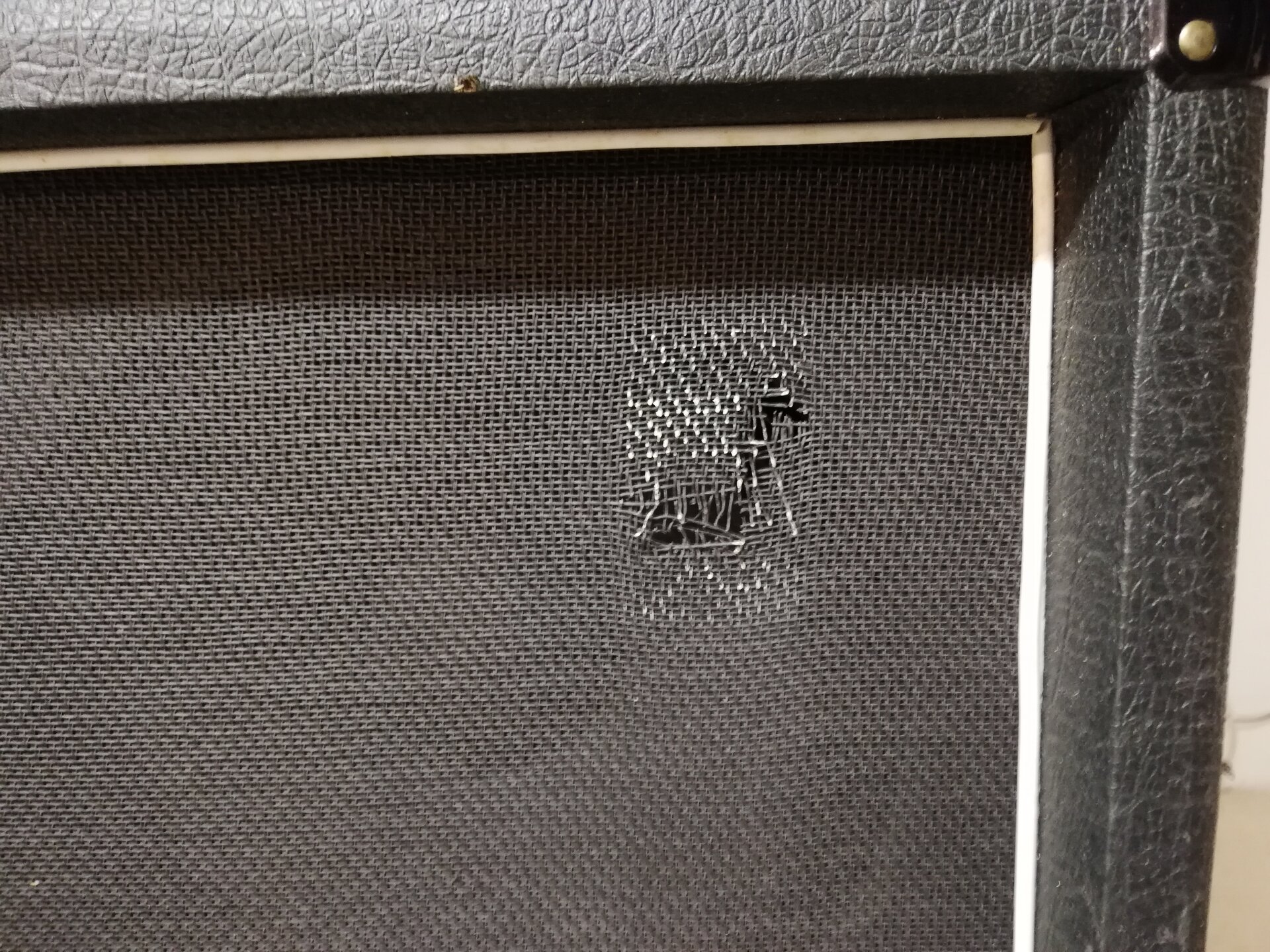 Die kleine Macke in der Bespannung (siehe Bilder) hat übrigens keinerlei Auswirkung auf die Funktion. Die vier 12" Speaker sind einwandfrei und unbeschädigt.