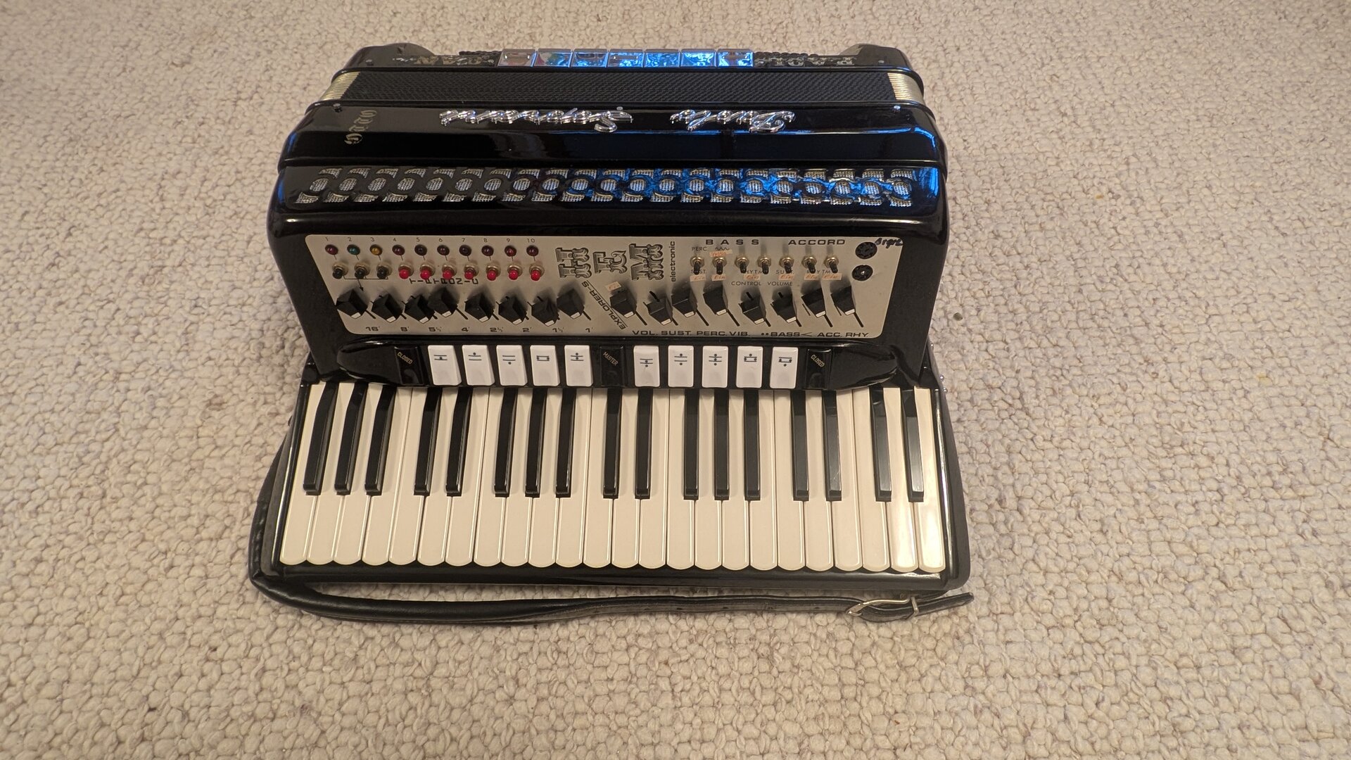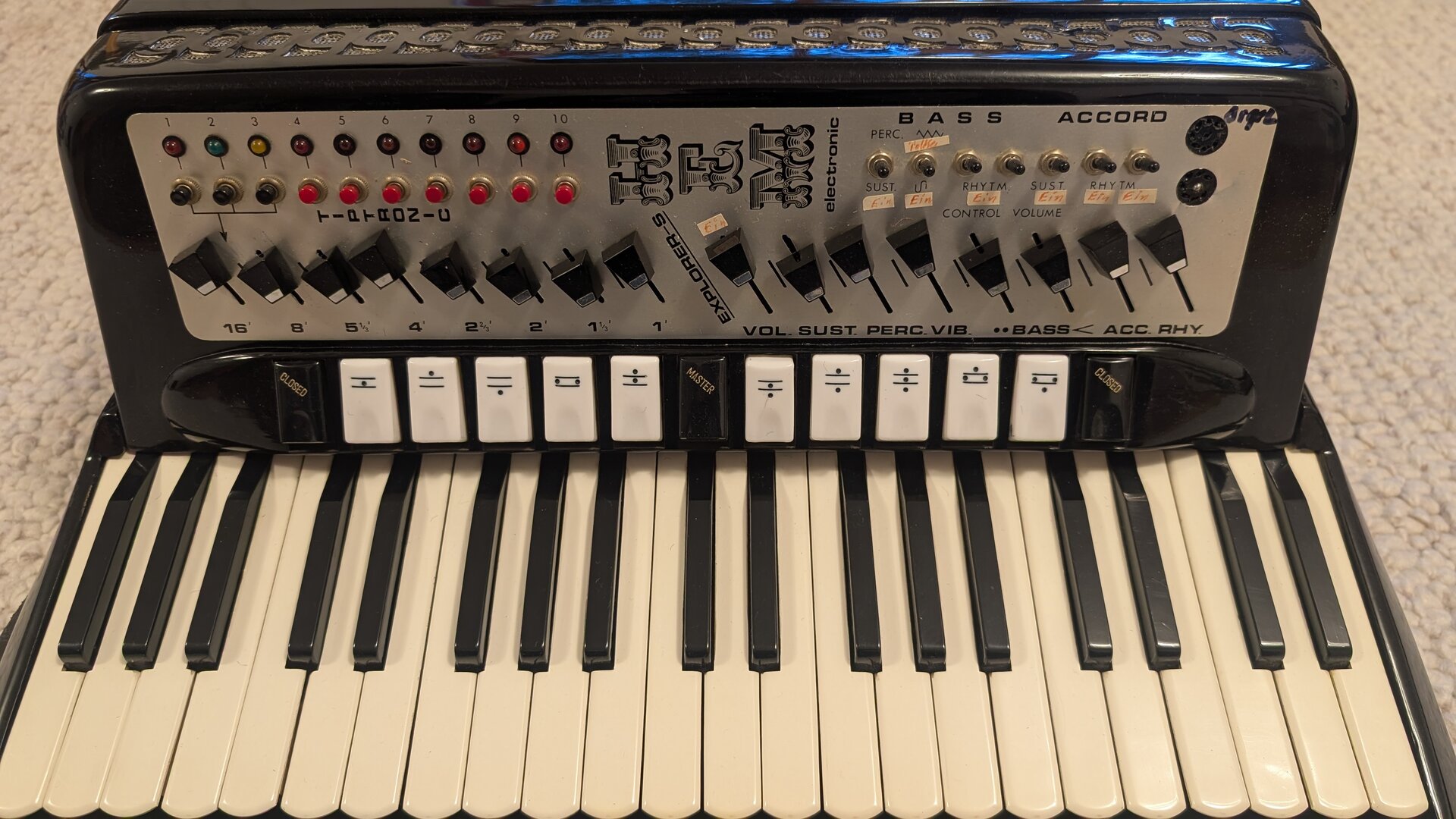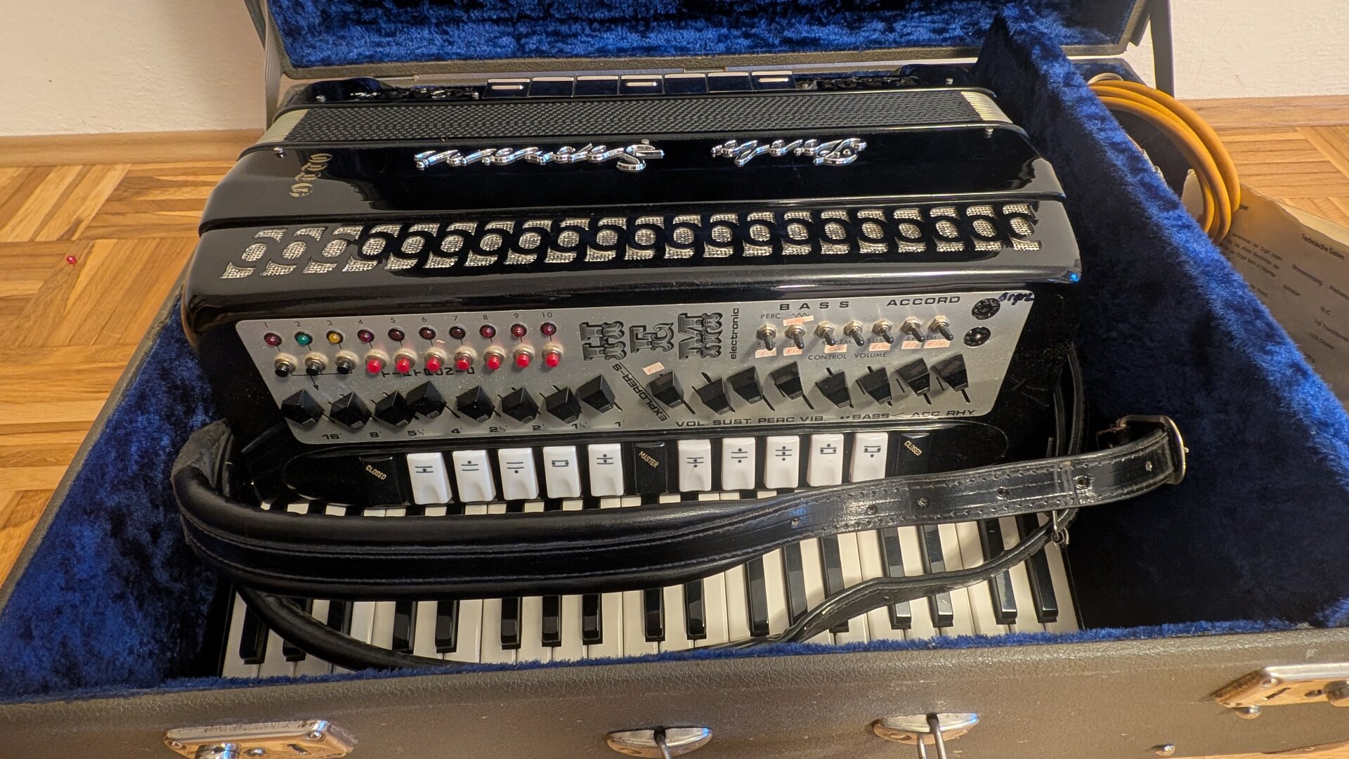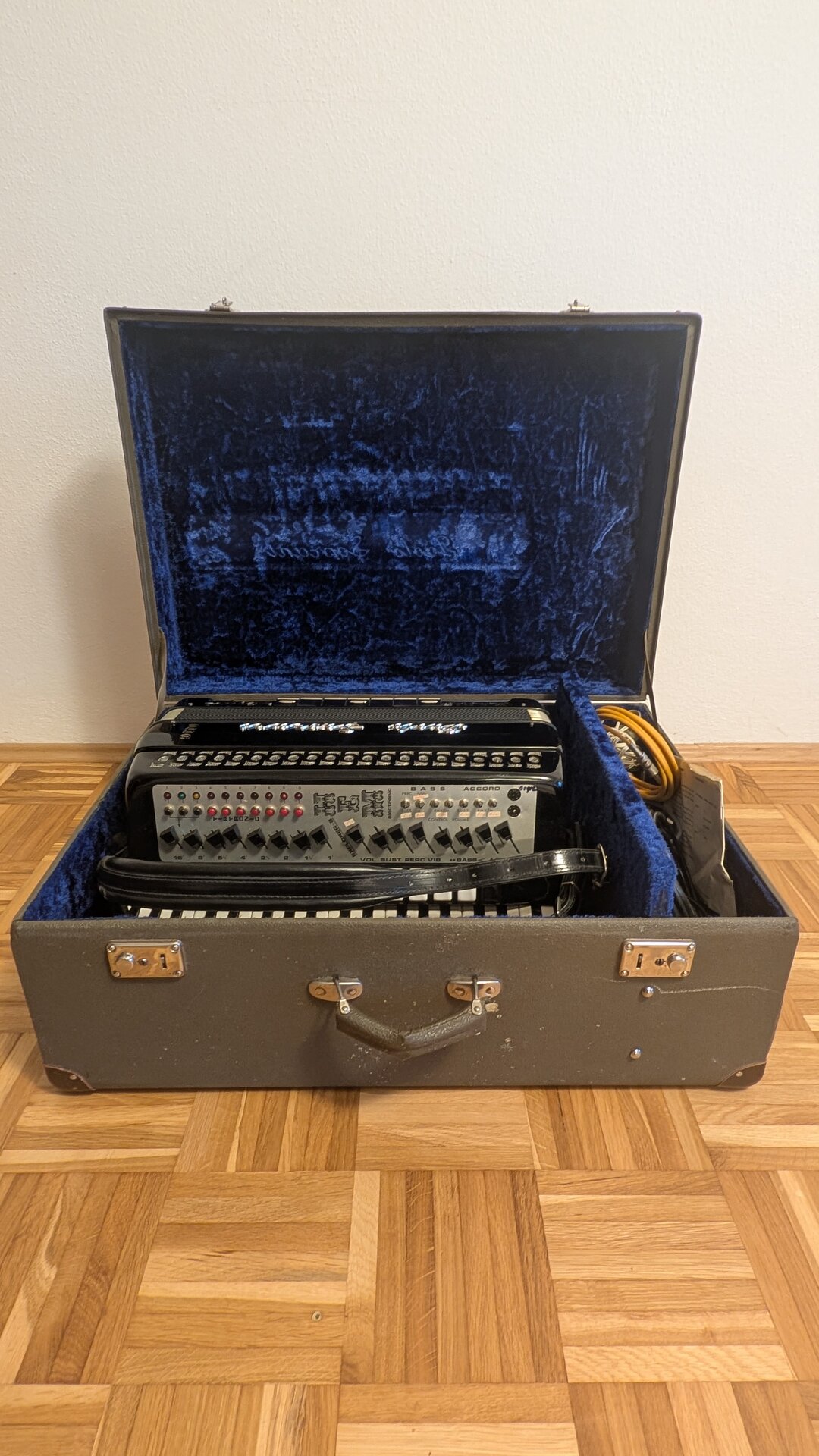Das Instrument stammt aus Familienbesitz, wurde trocken gelagert und zuletzt getestet – alles funktioniert wie es soll: kräftiger, klarer Klang, sauber ansprechende Mechanik und dichter Balg.