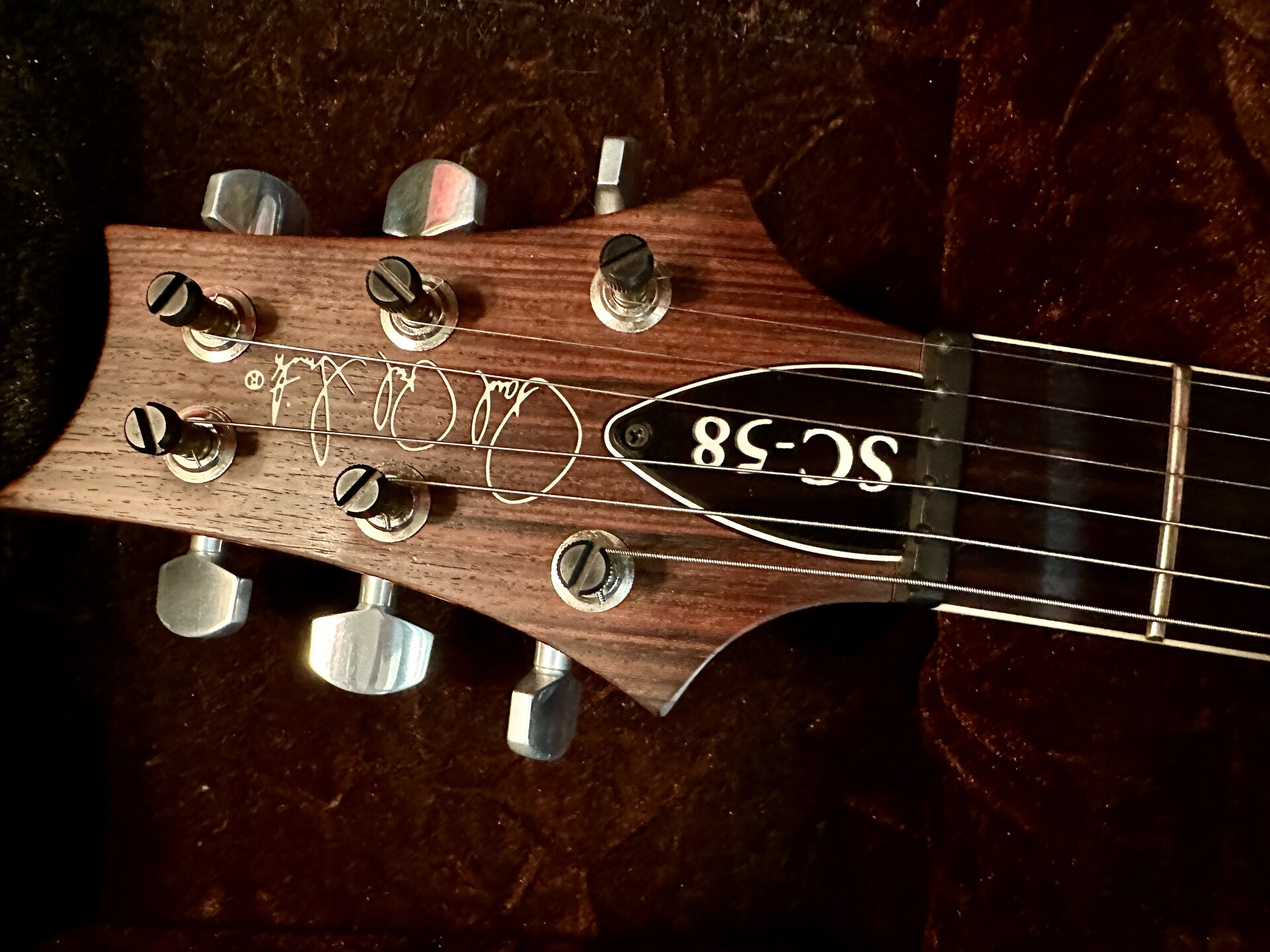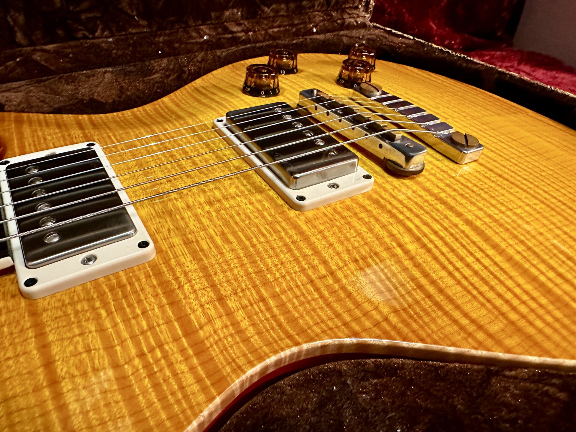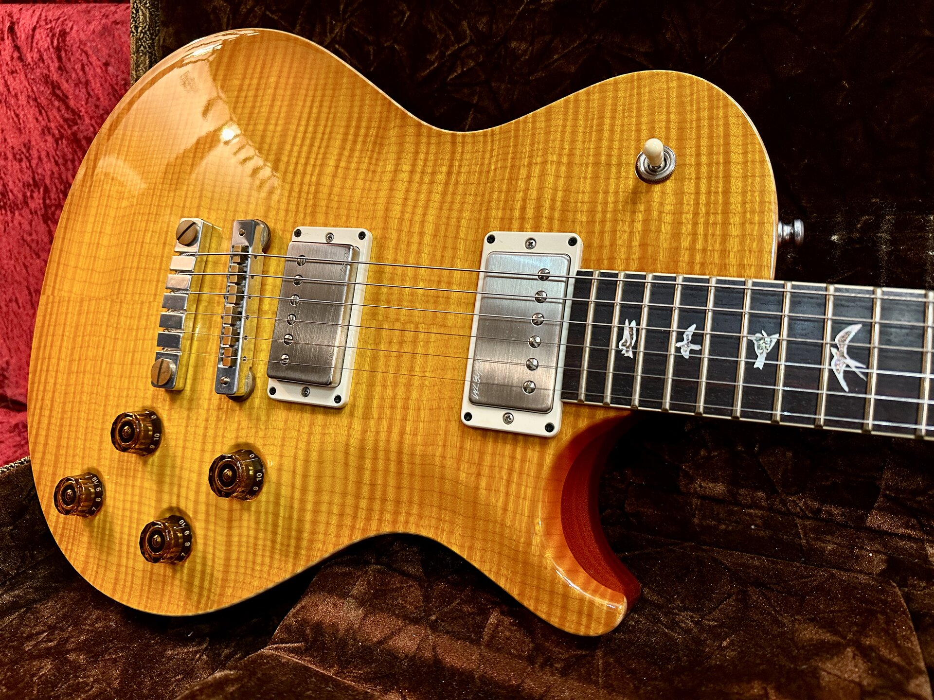 Zum Verkauf steht eine hochwertige PRS SC-58 Artist Grade mit aufwendig geschnitzter Ahorn-Decke (deutlich über Standardausführung). Extrem gute Bespielbarkeit durch Pattern-Hals und hervorragend abgerichtete Bünde. Die PRS 57/08 Pickups (gewickelt mit original altem Gibson-Draht) liefern einen offenen, resonanten PAF-Style-Sound mit singendem Ton und klarer Ansprache.