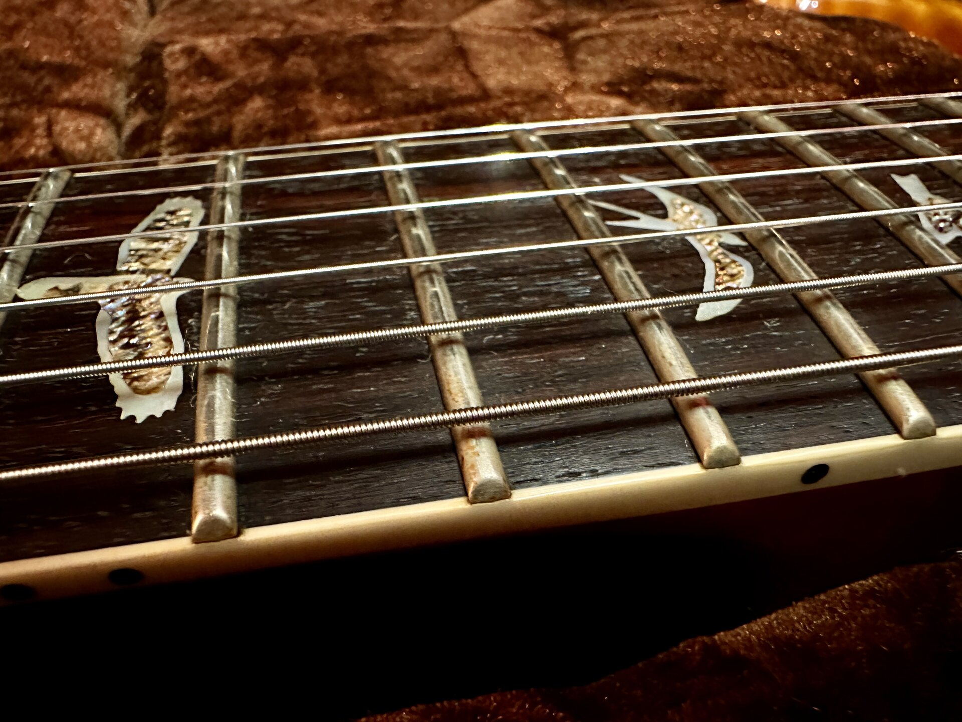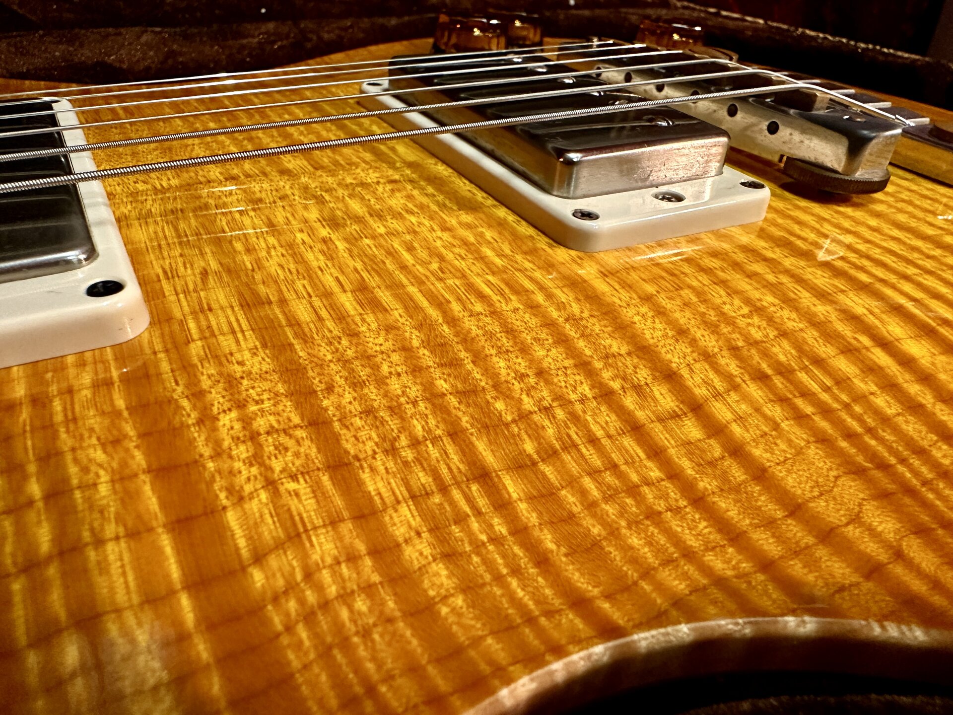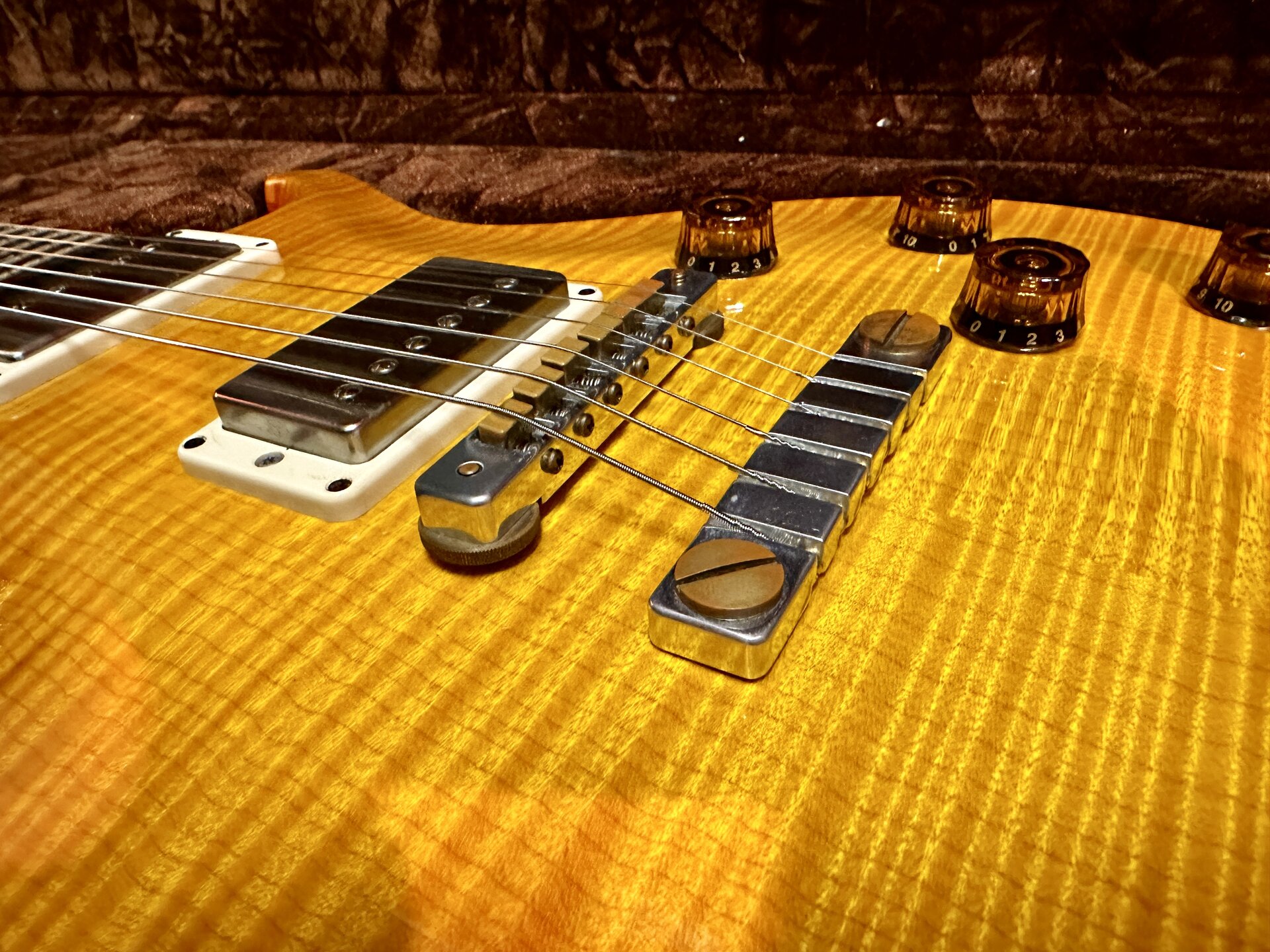 Zum Verkauf steht eine hochwertige PRS SC-58 Artist Grade mit aufwendig geschnitzter Ahorn-Decke (deutlich über Standardausführung). Extrem gute Bespielbarkeit durch Pattern-Hals und hervorragend abgerichtete Bünde. Die PRS 57/08 Pickups (gewickelt mit original altem Gibson-Draht) liefern einen offenen, resonanten PAF-Style-Sound mit singendem Ton und klarer Ansprache.