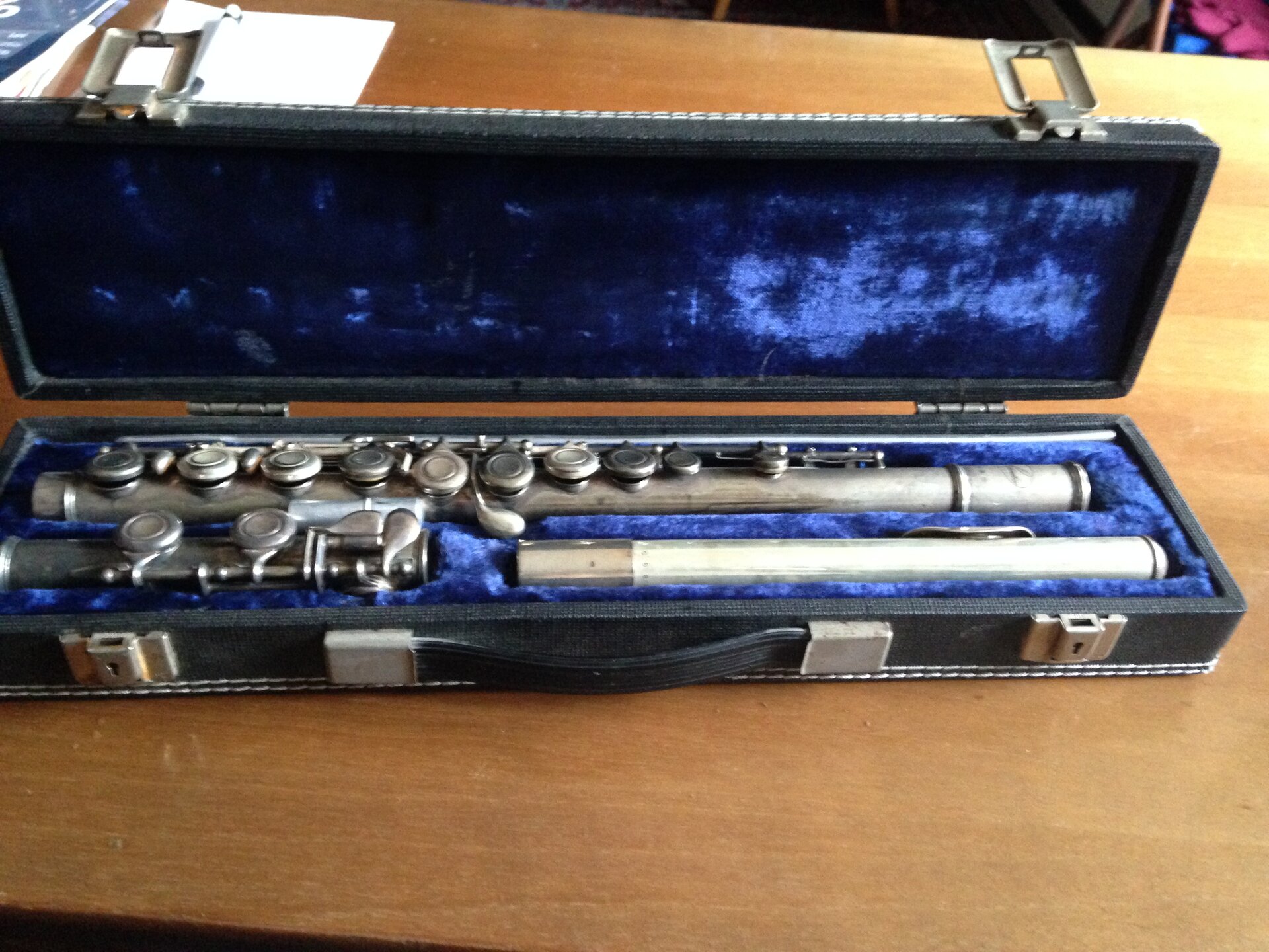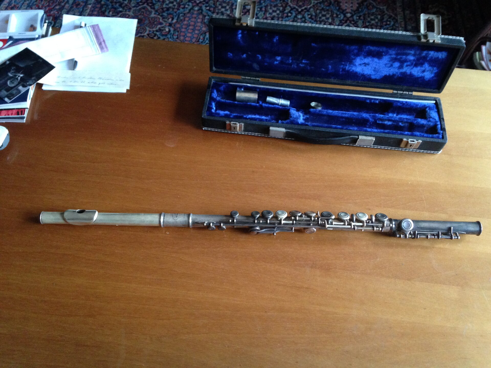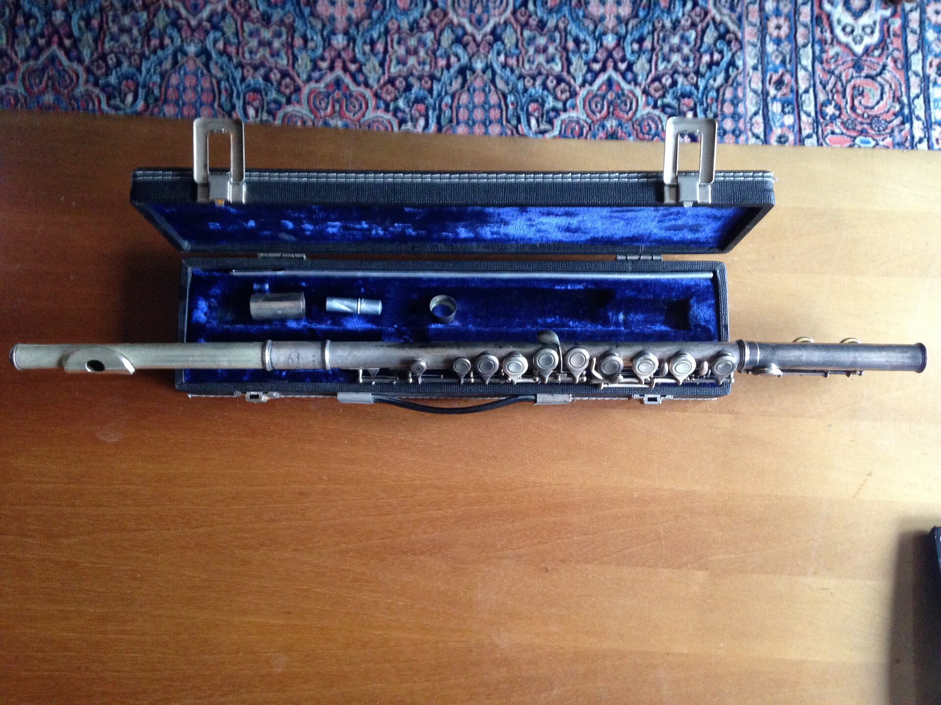 Querflöte Vollsilberkopf(925) Einzelanfertigung, von Hannes Riedel bei Schreiber/Nauheim,muß nicht neu gepolstert werden. Das Mundloch ist nach innen leicht konvexe Bohrung und ermöglicht so einen einzigartigen Klang.