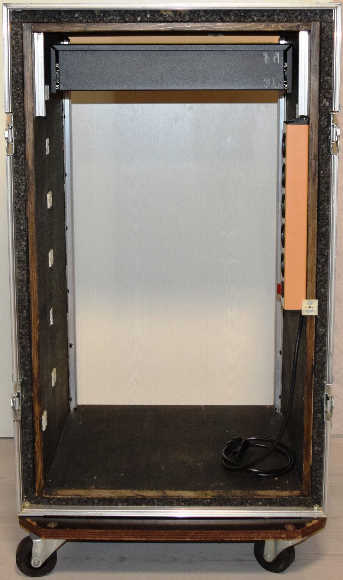 Das Rack ist auf einer 2 cm dicken Verbundholzplatte mit Rollen montiert