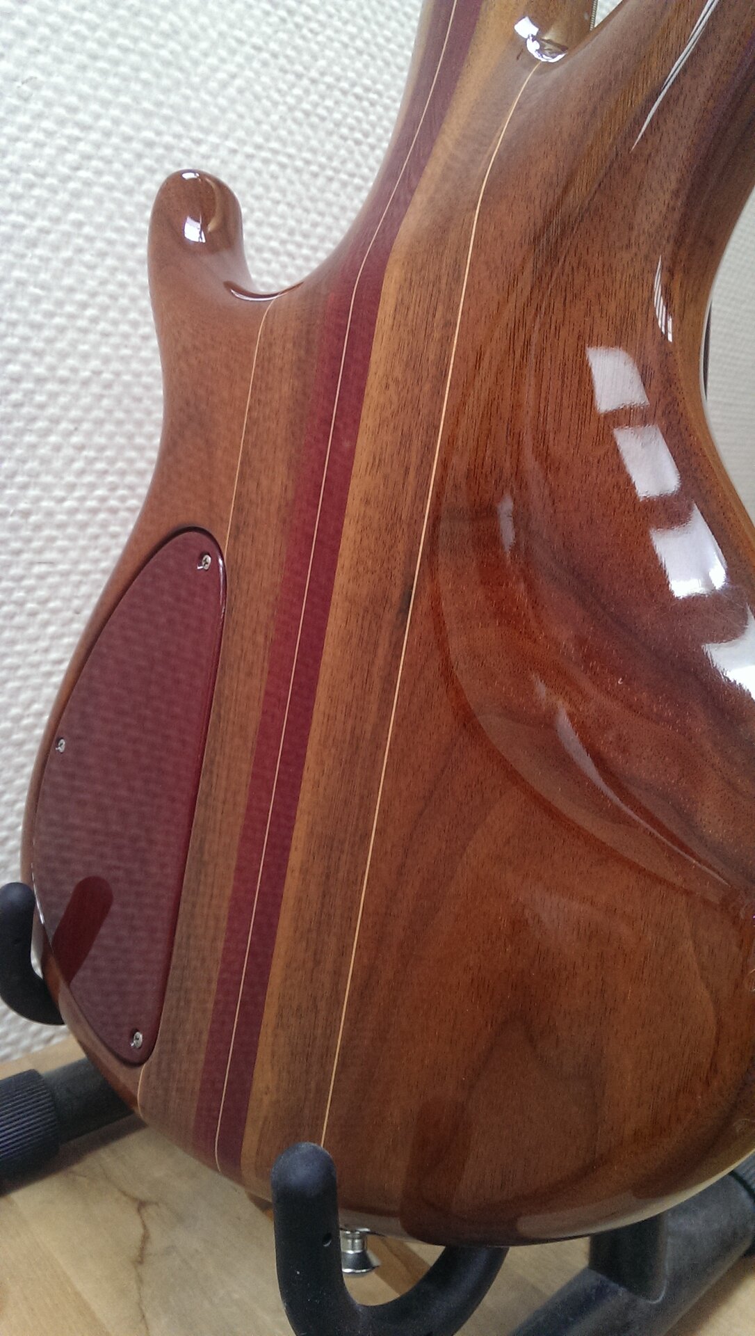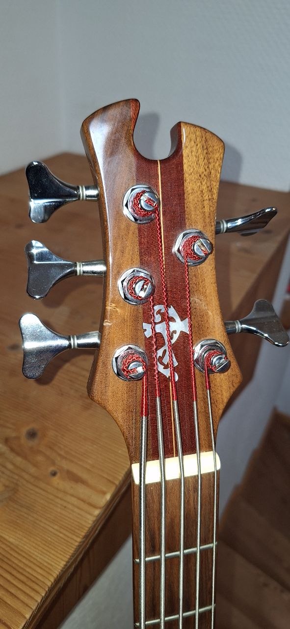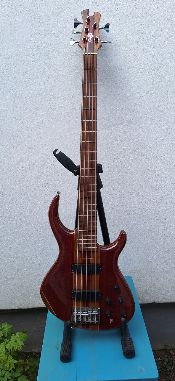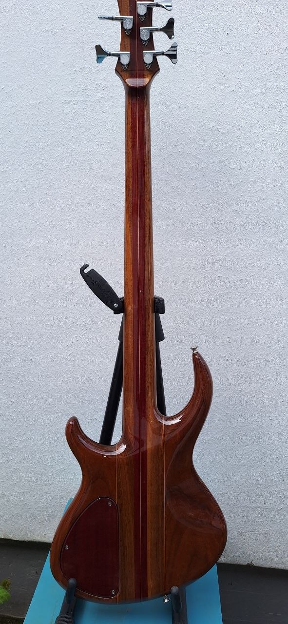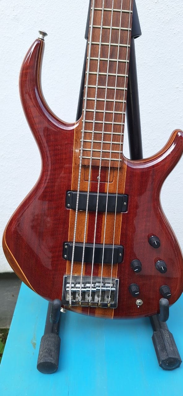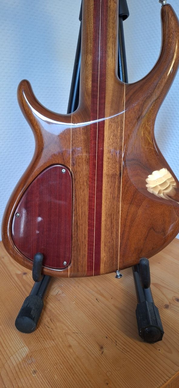 Der Bass hat einen Body aus Walnuss mit Amarantholz-Decke, Hals – Walnuss mit Amarantholz-Streifen, Griffbrett – Original Santos-Palisander, Aktiv / Passiv Schalter, Elektronik wie neu, Bartolini-Soapbar-Pickups, MT-Mechaniken.