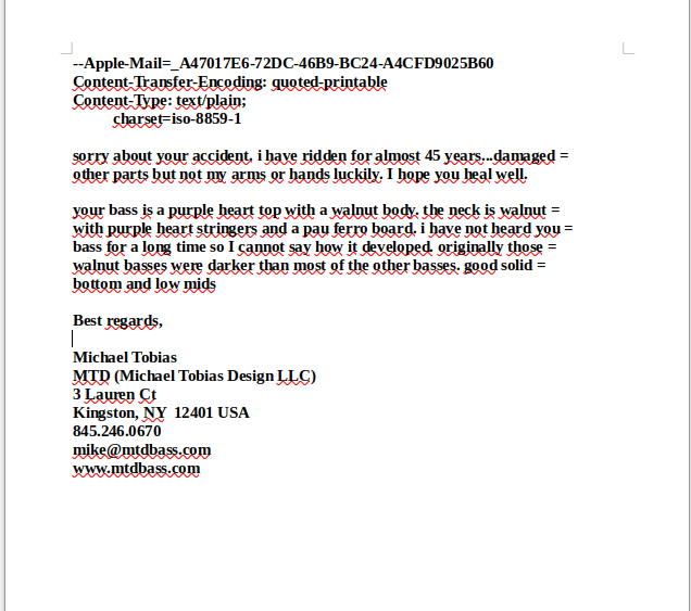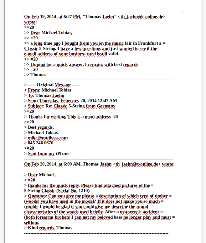 Sound : extreme Tiefbässe, top-klare H-Saite, schöne Tiefmitten, klare Höhen (siehe auch Email-Korrespondenz mit Michael Tobias von 2014).