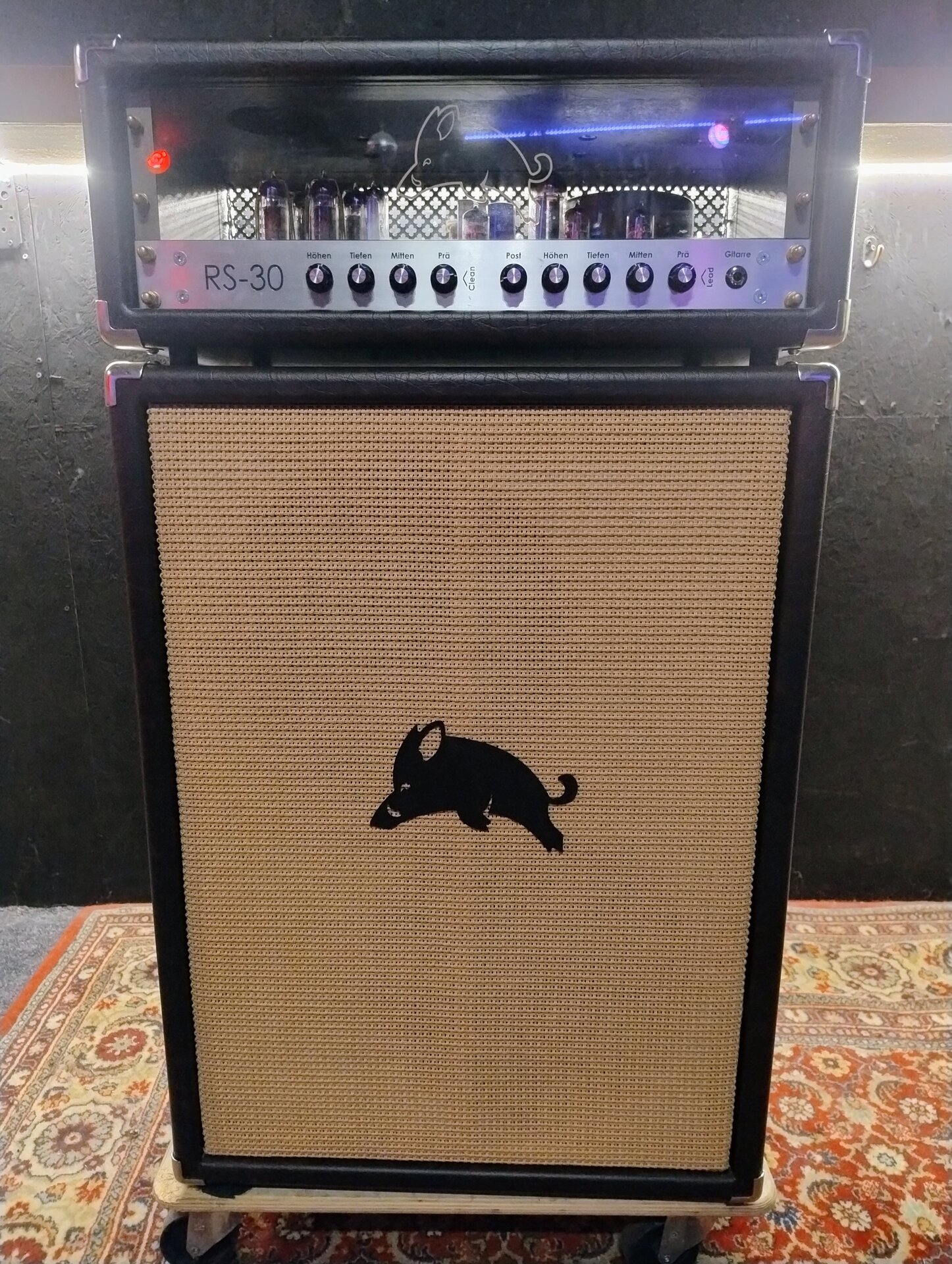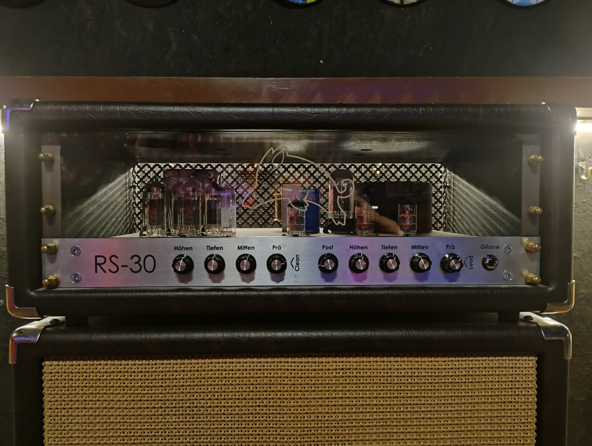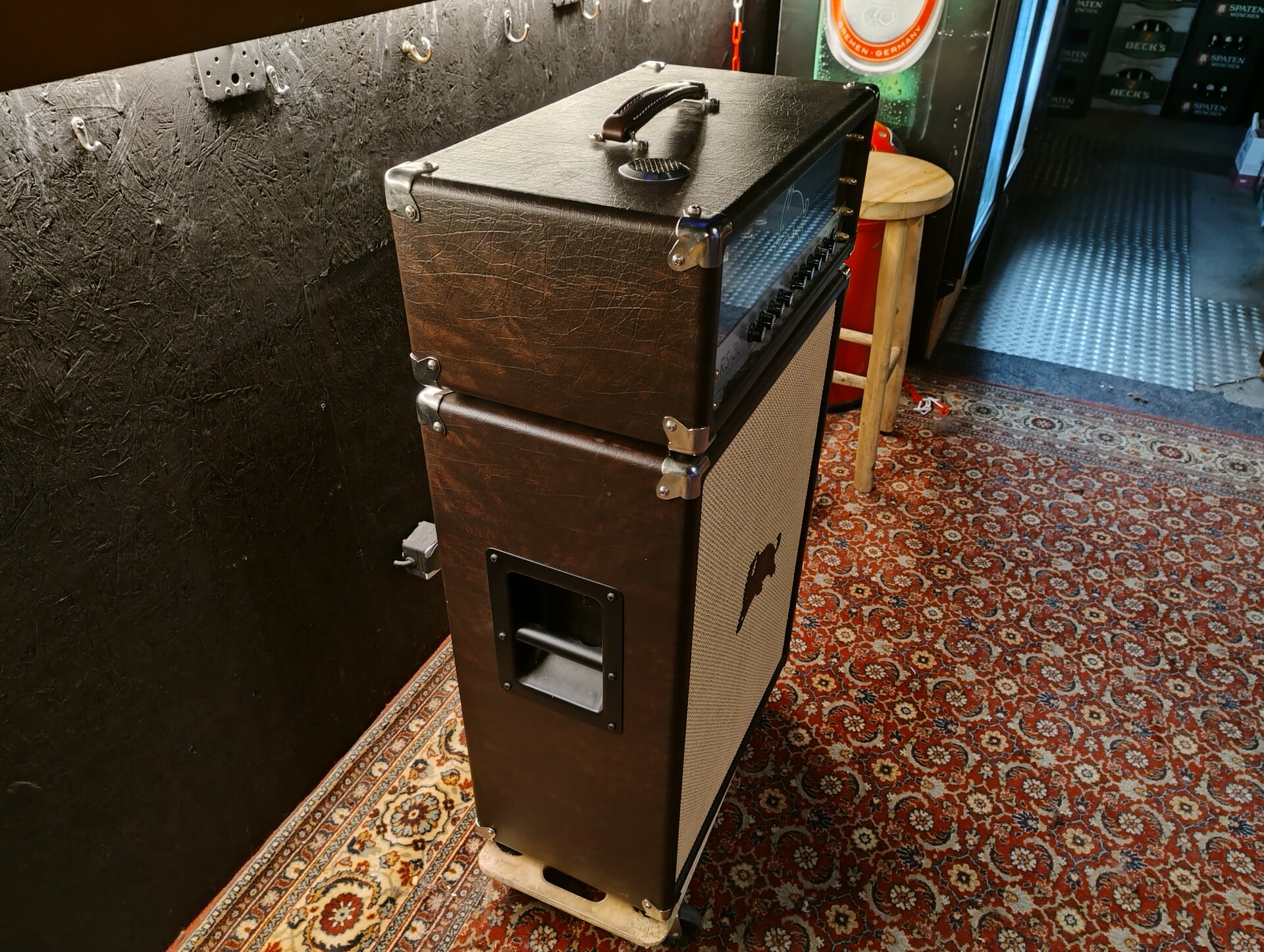 Ein 30 Watt Röhren-Topteil mit passender 2x12 Box handgemacht aus der Nähe von München. Ich habe mir vor ca. 6 Jahren das Top und die Box bauen lassen und das ist mit Abstand der beste Amp, den ich je hatte. Sehr direkte Ansprache, warm, sehr effektive Klangreglung. Clean ist wirklich clean mit gutem Headroom und die Zerre reicht von leichtem Crunch bis hin zu amtlichen Metal/Stoner Sounds.