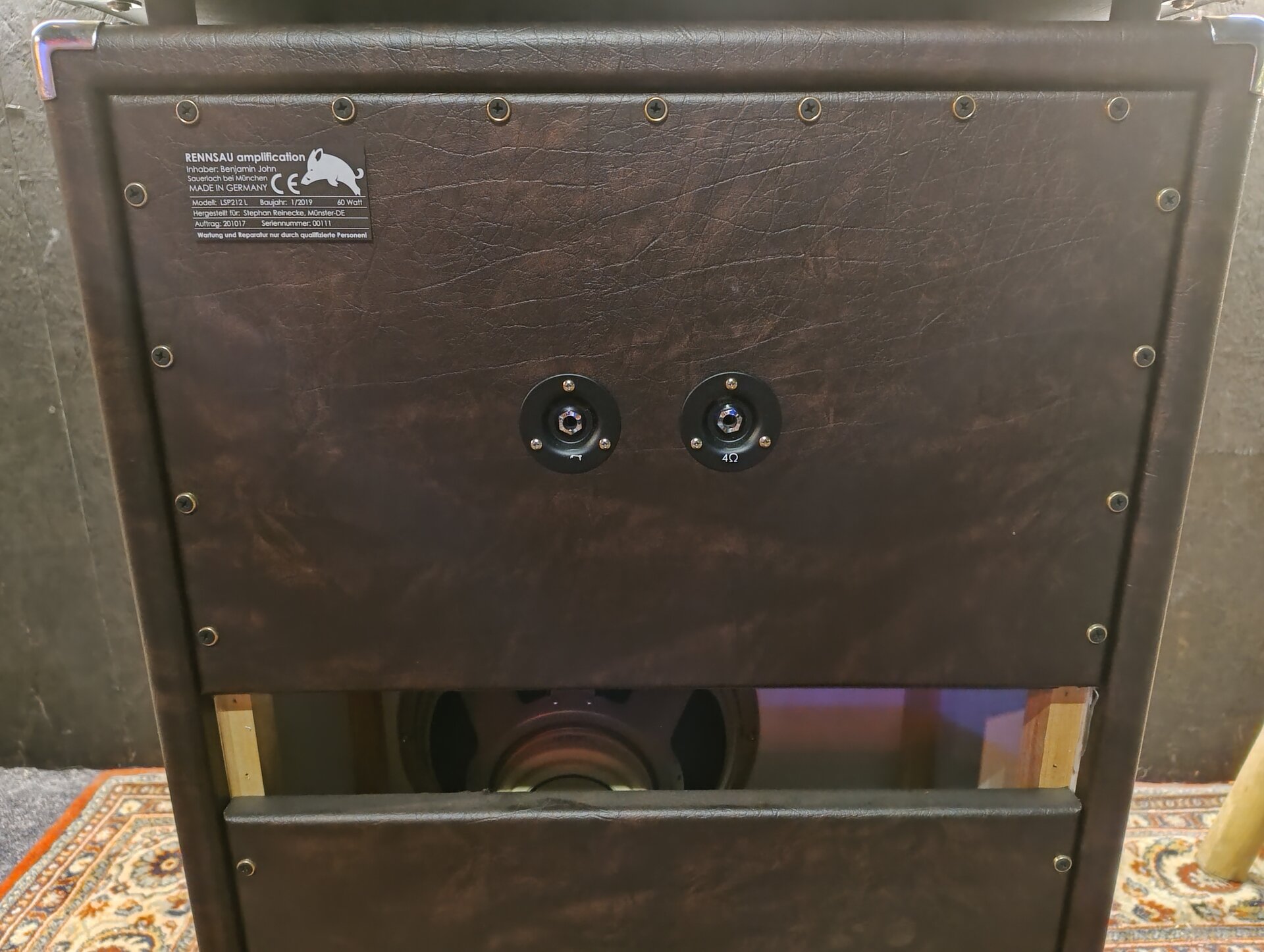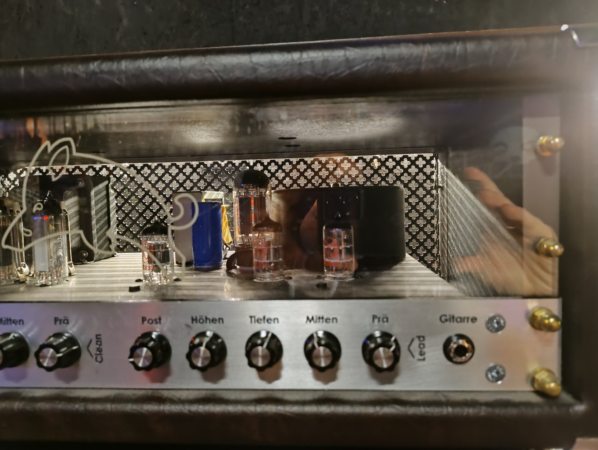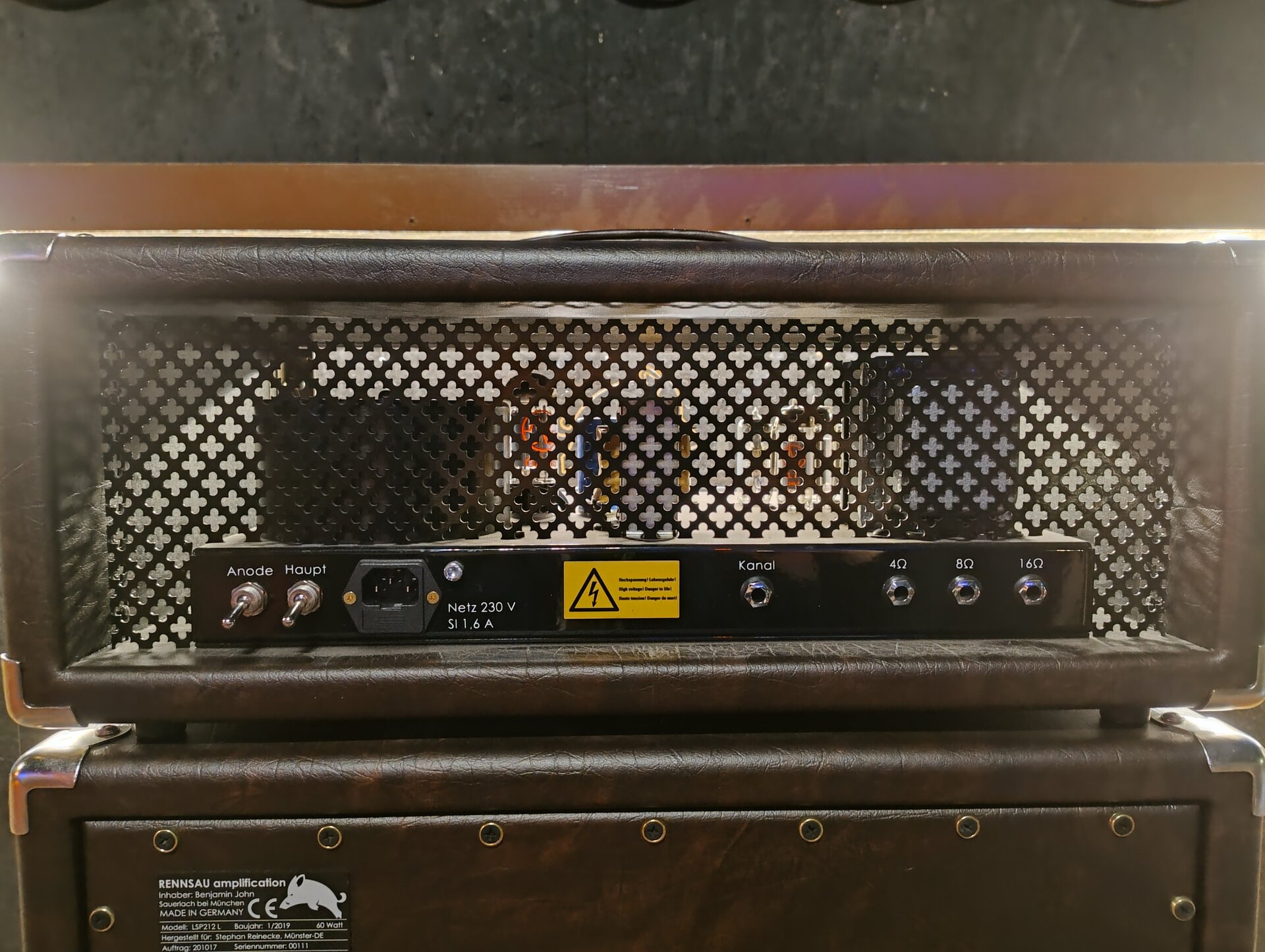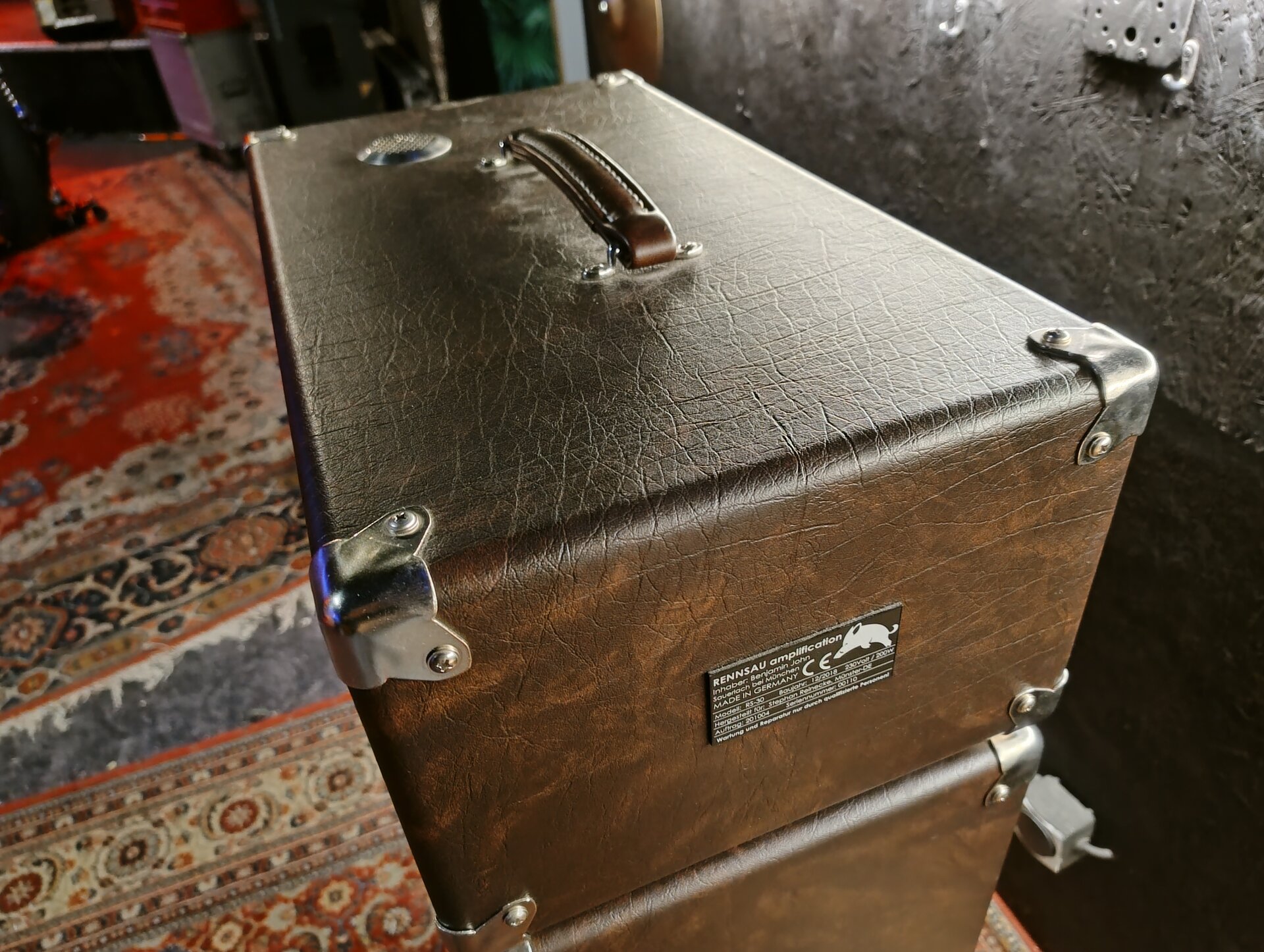 Ein 30 Watt Röhren-Topteil mit passender 2x12 Box handgemacht aus der Nähe von München. Ich habe mir vor ca. 6 Jahren das Top und die Box bauen lassen und das ist mit Abstand der beste Amp, den ich je hatte. Sehr direkte Ansprache, warm, sehr effektive Klangreglung. Clean ist wirklich clean mit gutem Headroom und die Zerre reicht von leichtem Crunch bis hin zu amtlichen Metal/Stoner Sounds.
