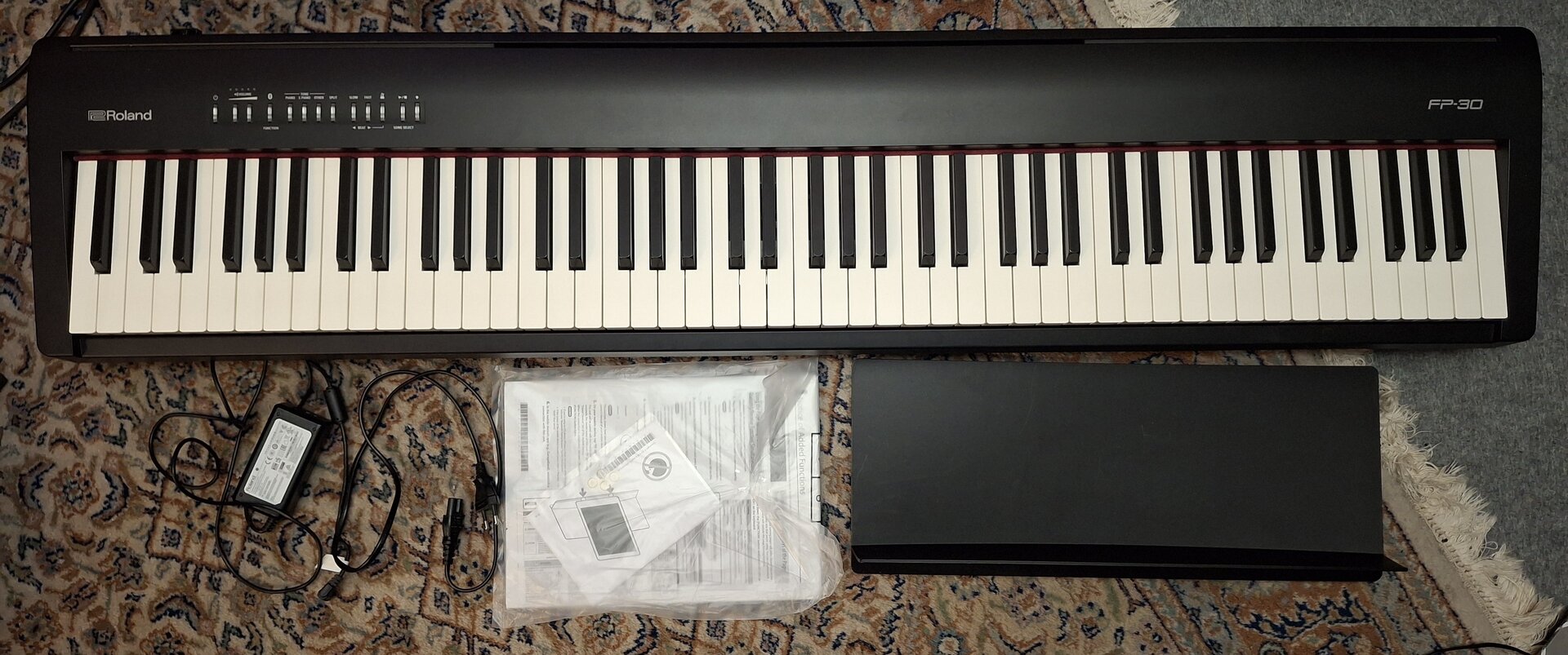 Zubehör: Manual, Original-Netzteil, Notenhalter, Gigbag und Sustain-Pedal (nicht auf den Fotos zu sehen).