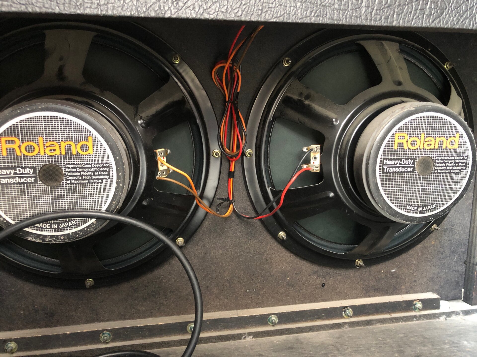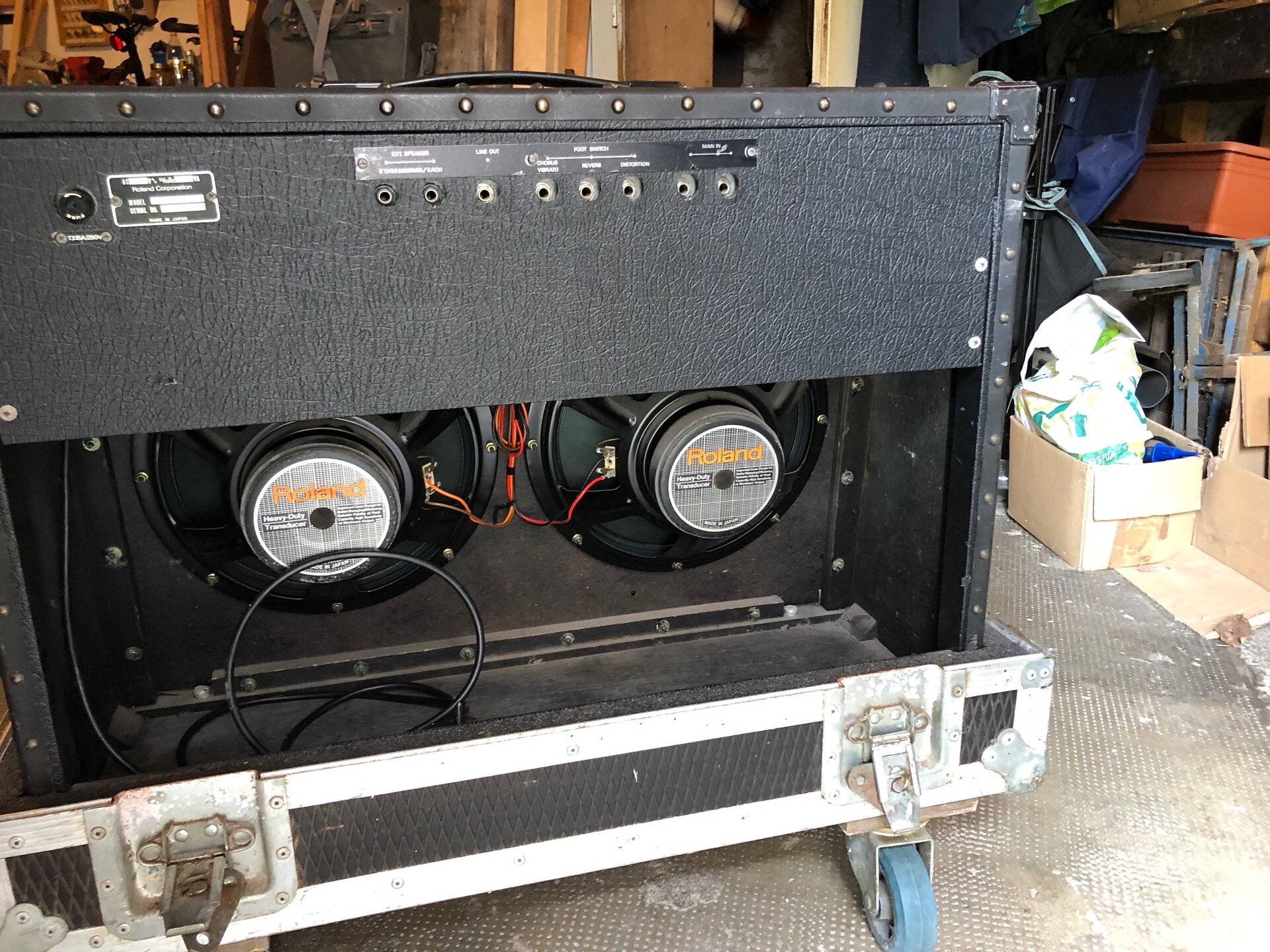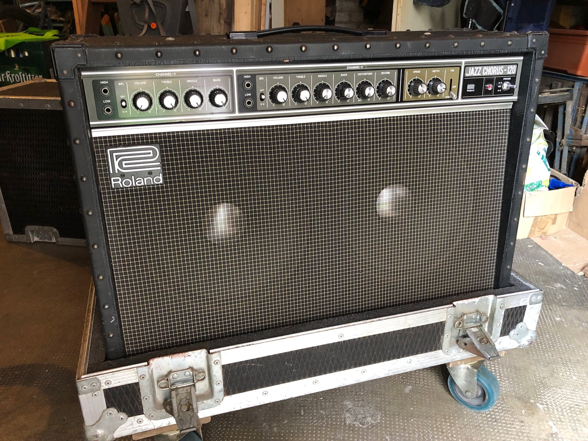Hallo, zum Verkauf steht der Roland 120 JC aus den 80ern, mit Bulldog-Case auf Rädern. Funktioniert einwandfrei, sehr guter Zustand, siehe Fotos. 2 x 60 Watt, 12“ Speaker, 2 Kanäle (1x clean + 1x Reverb, Vibrato, Distortion).
