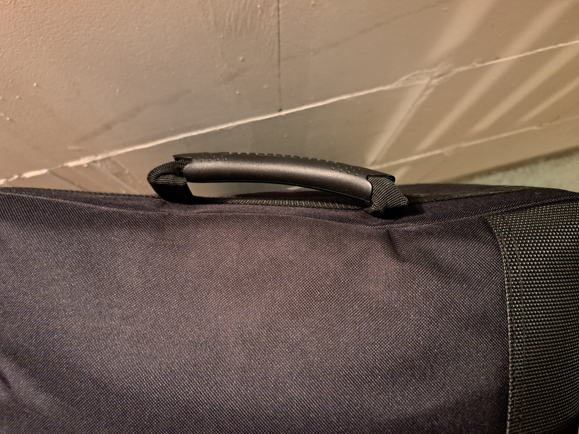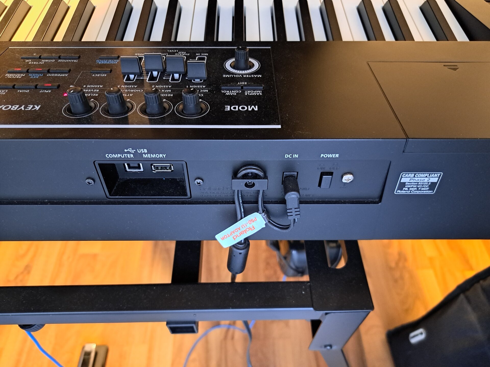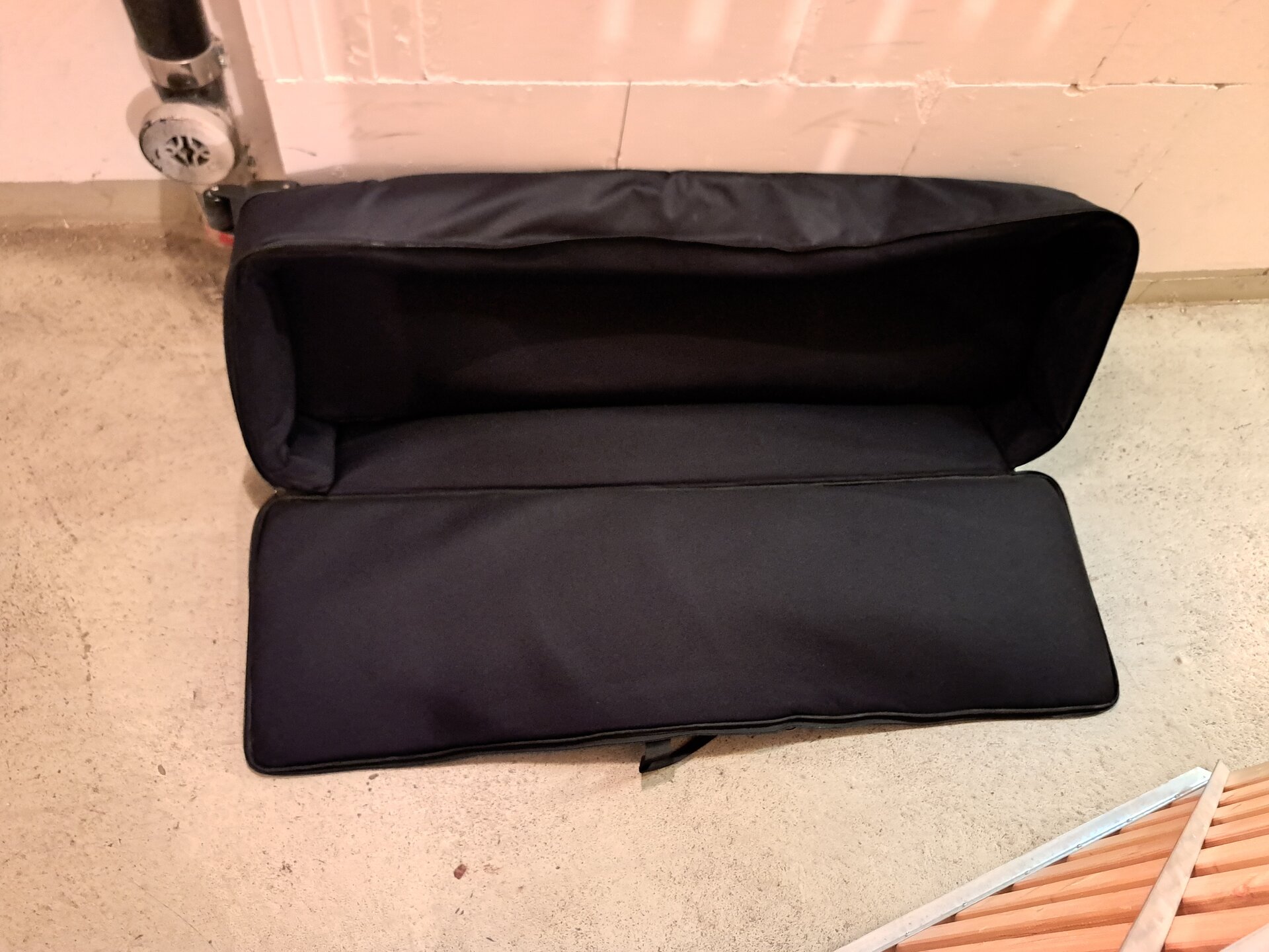 Mit dabei: Bedienungsanleitung, Original-Netzteil, Sustainpedal und gepolsterte Tragetasche mit Rollen.