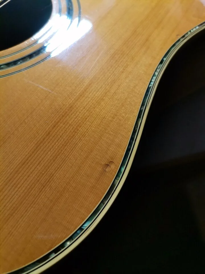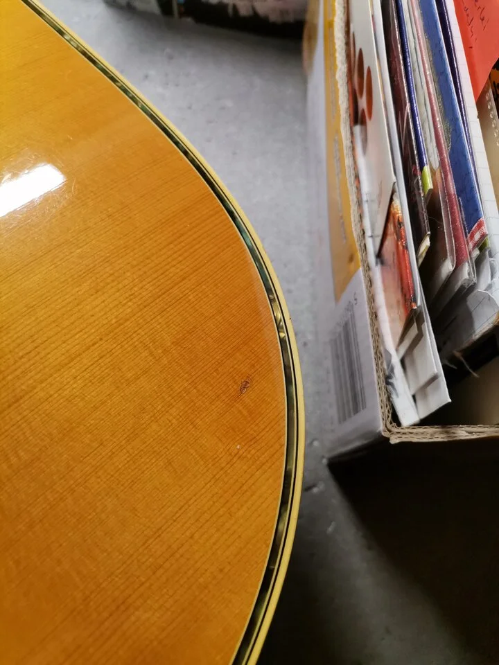 Altersbedingte Gebrauchsspuren sind natürlich schon vorhanden - siehe Fotos -, 2 sehr kleine Lackpatzer auf der vorderen Gitarrendecke, aber diese sind kaum der Rede wert auf die lange Zeit hin gesehen. Leider kann ich euch auch keine detaillierten Angaben zur Holzart der Gitarre machen, wie so viele es hier mit ihren Gitarren im Forum machen in Ihren Beschreibungen.