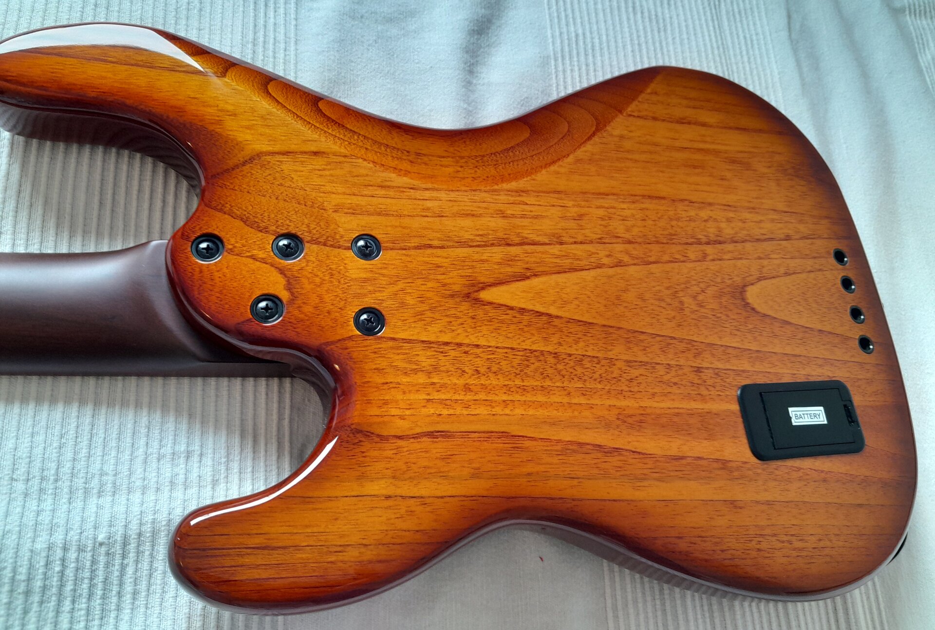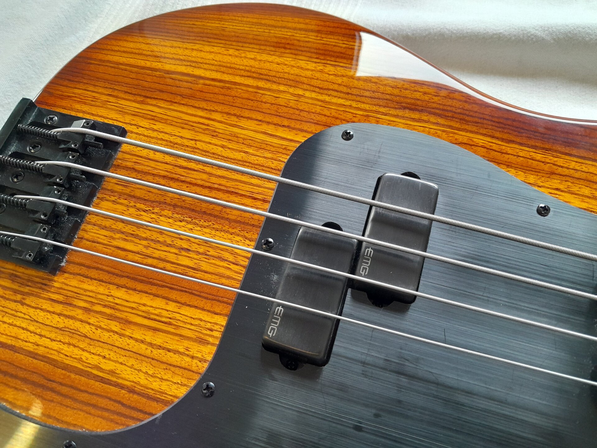 Ein absolut fantastischer Bass mit Zebrawood-Top, Swamp Ash Body (der ganze Bass wiegt 4,1 Kilo) roasted Maple Neck und EMG Pickup mit aktiver Klangregelung.
