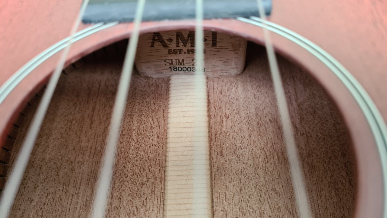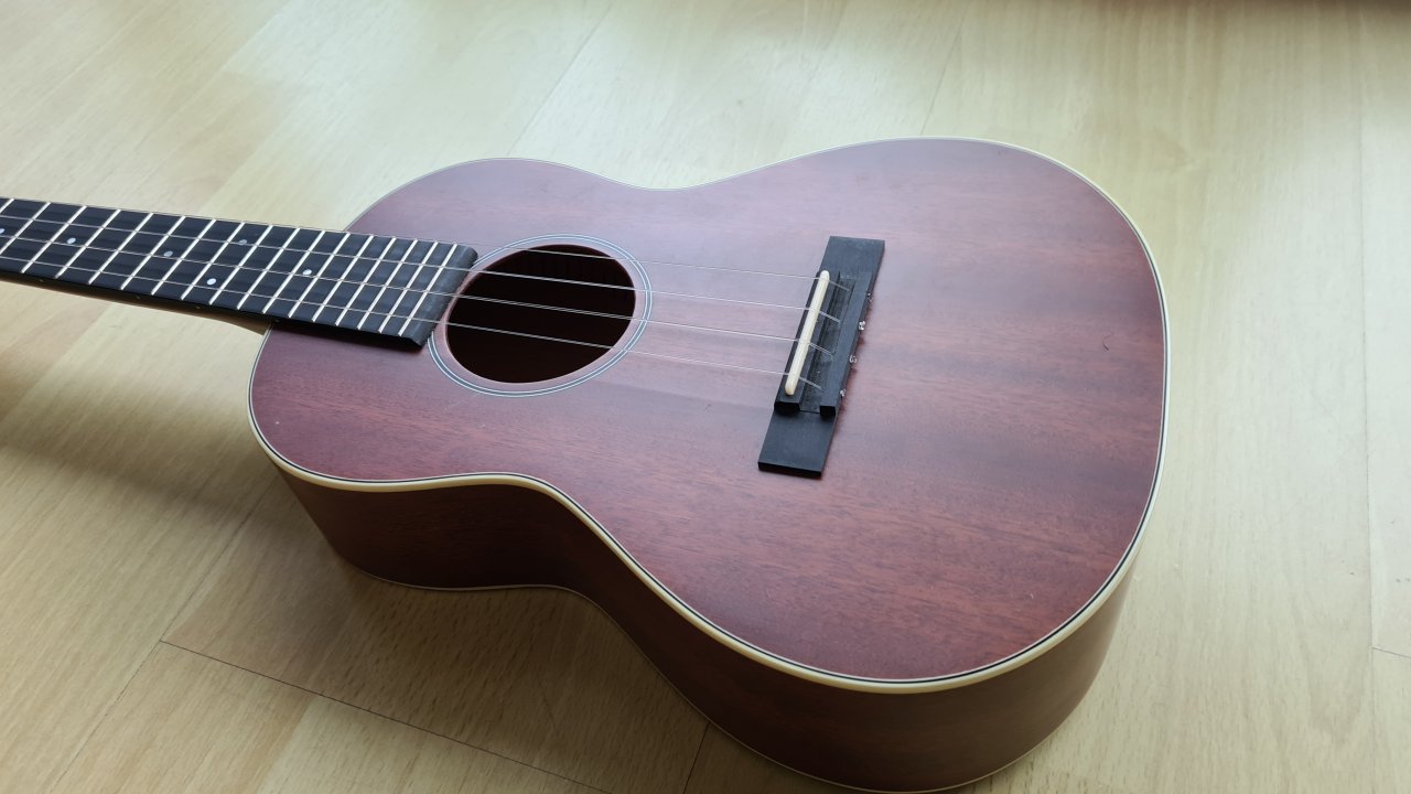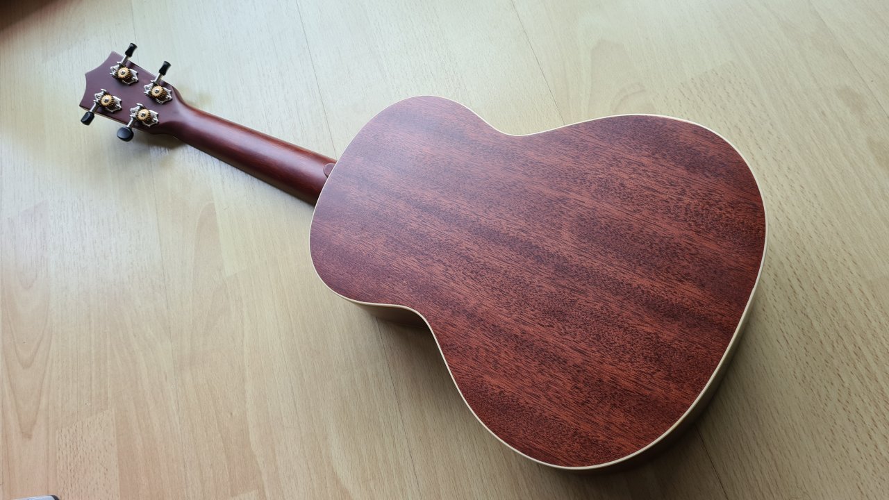 Aus massivem Mahagoni gebaut. Ist in neuwertigem Zustand, keine Kratzer oder Macken. Das einzige, was mir auffält, ist so eine Art Schliere links neben dem Schalloch, so als wenn man dort etwas Dreck mit einlackiert hätte.