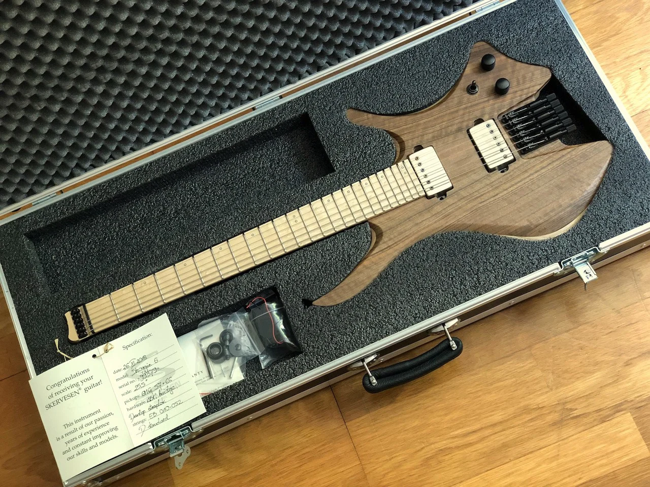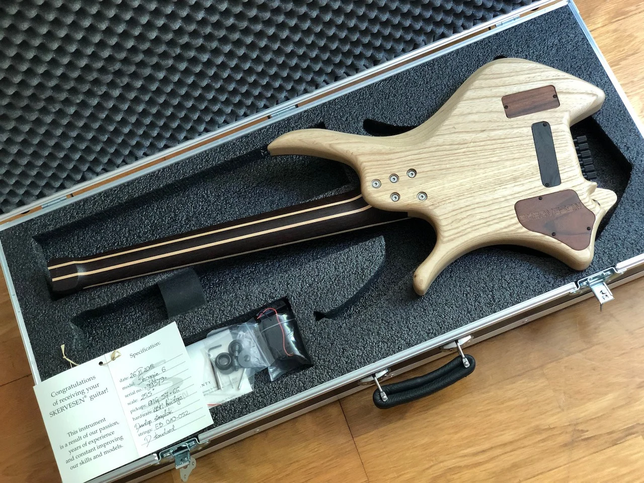 Zum Verkauf steht diese wunderschöne Shoggie DC 6 von 2018 aus der Polnischen Gitarrenschmiede Skervesen. Der Neupreis war ca. 2800 EUR. Die Gitarre wurde nur wenig gespielt, gut gepflegt und weißt praktisch keine Gebrauchsspuren auf. Ich bin nie mit der Gitarre irgendwo angeeckt und sie hat die meiste Zeit im Koffer verbracht. Die