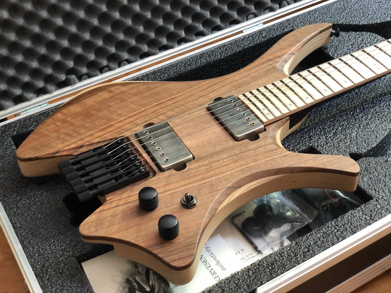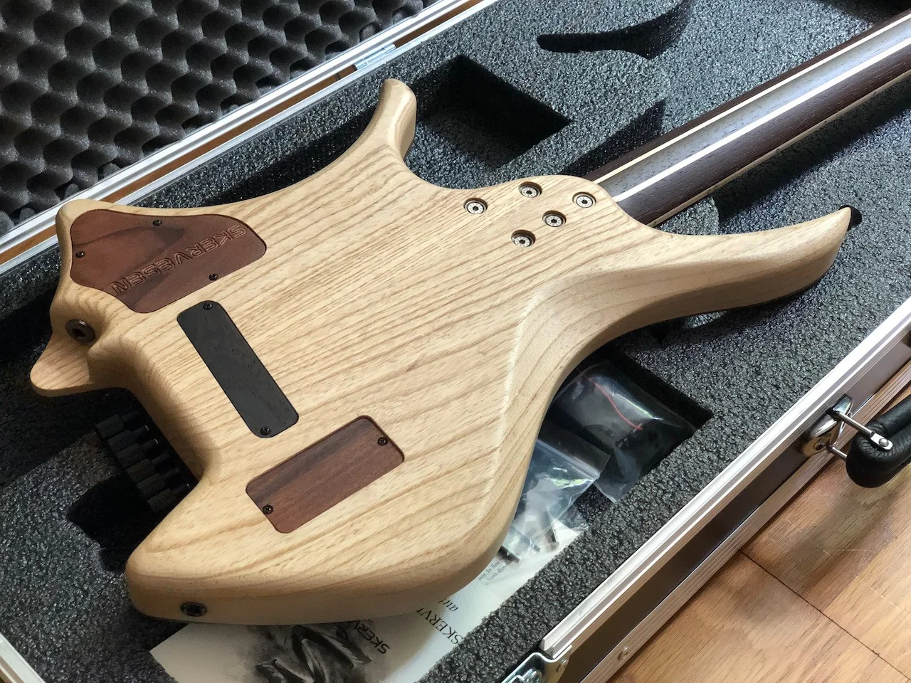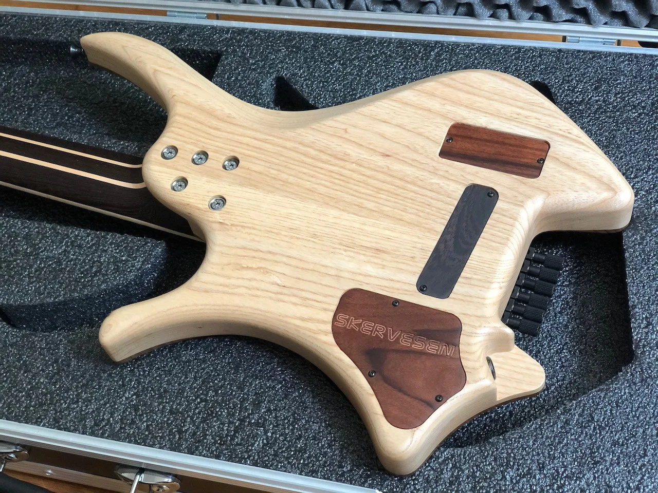 Am Anfang war die Gitarre mit aktiven Tonabnehmer geplant, daher gibt es eine entsprechende Fräsung für ein Batteriefach. Allerdings wurde dieses direkt nach der Fertigstellung von Skervesen mit einem Holzblock gefüllt, da ich auf passive Tonabnehmer umgeschwenkt bin. Ein Batteriefach liegt bei.