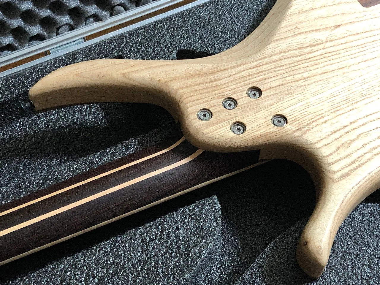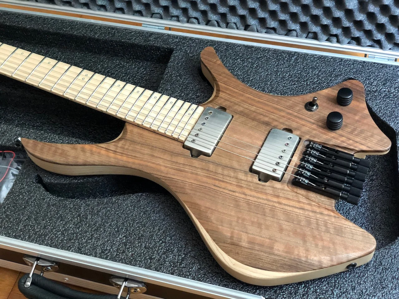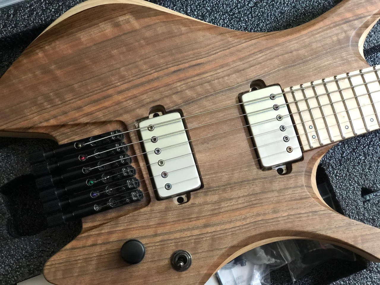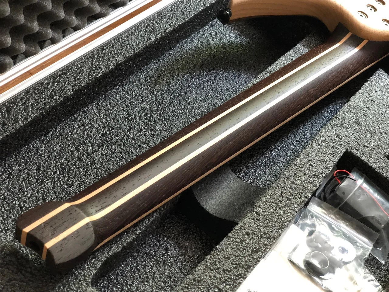 Am Anfang war die Gitarre mit aktiven Tonabnehmer geplant, daher gibt es eine entsprechende Fräsung für ein Batteriefach. Allerdings wurde dieses direkt nach der Fertigstellung von Skervesen mit einem Holzblock gefüllt, da ich auf passive Tonabnehmer umgeschwenkt bin. Ein Batteriefach liegt bei.