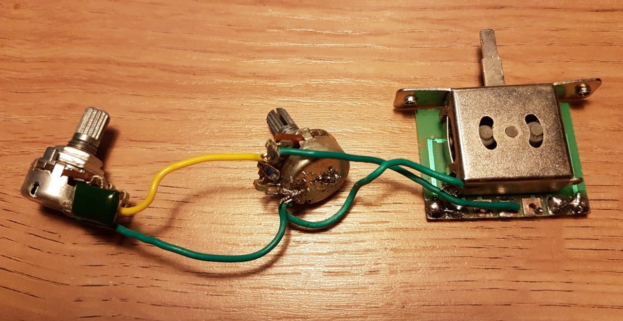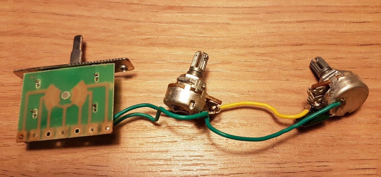 ich verkaufe hier aus einer No-Name-Telecaster einen 3-Way-Switch mit zwei Potis (A500K und B 500K, kleine Bauform, für 8mm Bohrungen), alles verdrahtet und verlötet und voll funktionstüchtig.