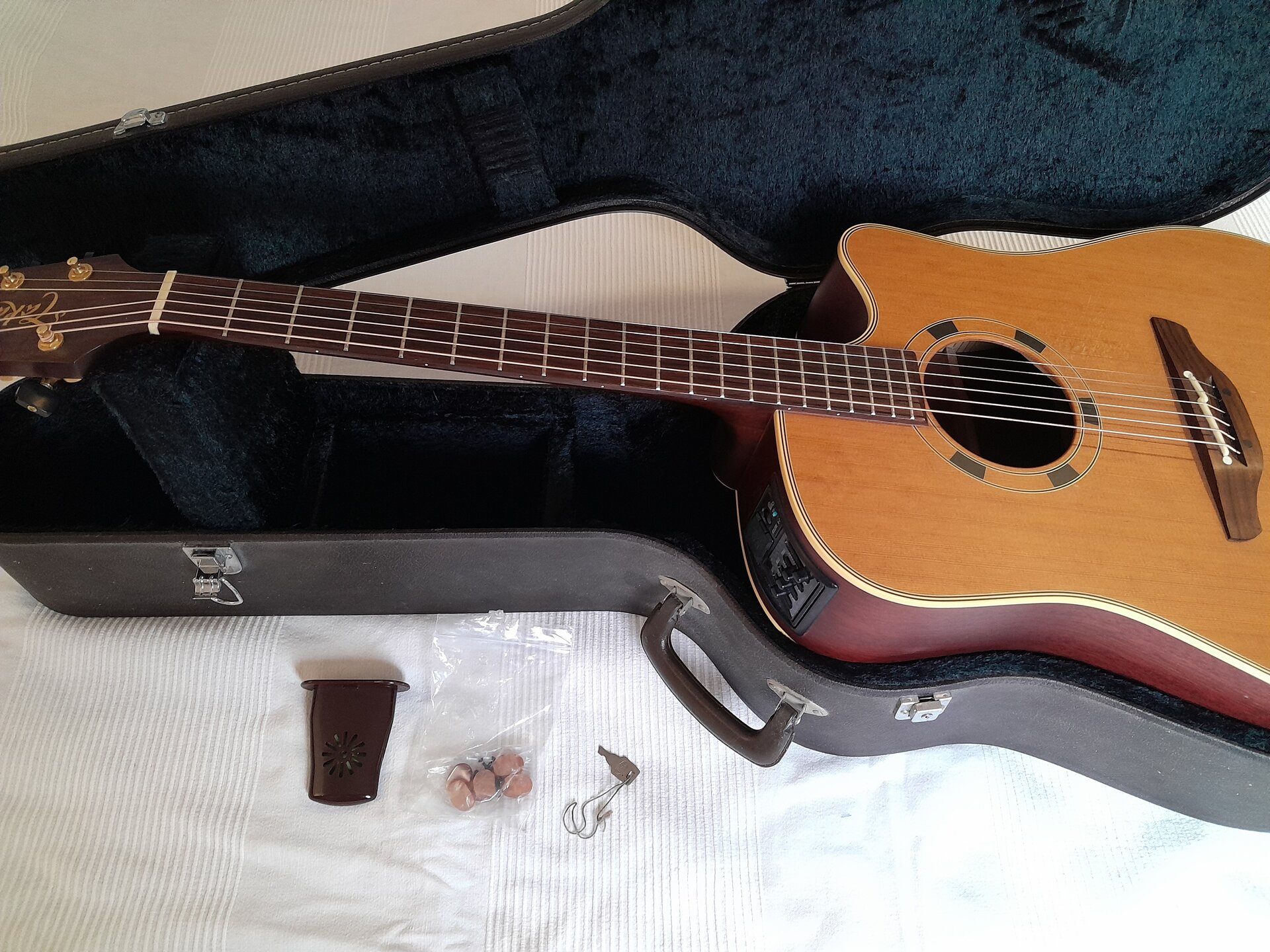 Ich hatte mal die Tunerbuttons ausgetauscht, die originalen sind aber dabei. Mit Koffer und Humidifier.