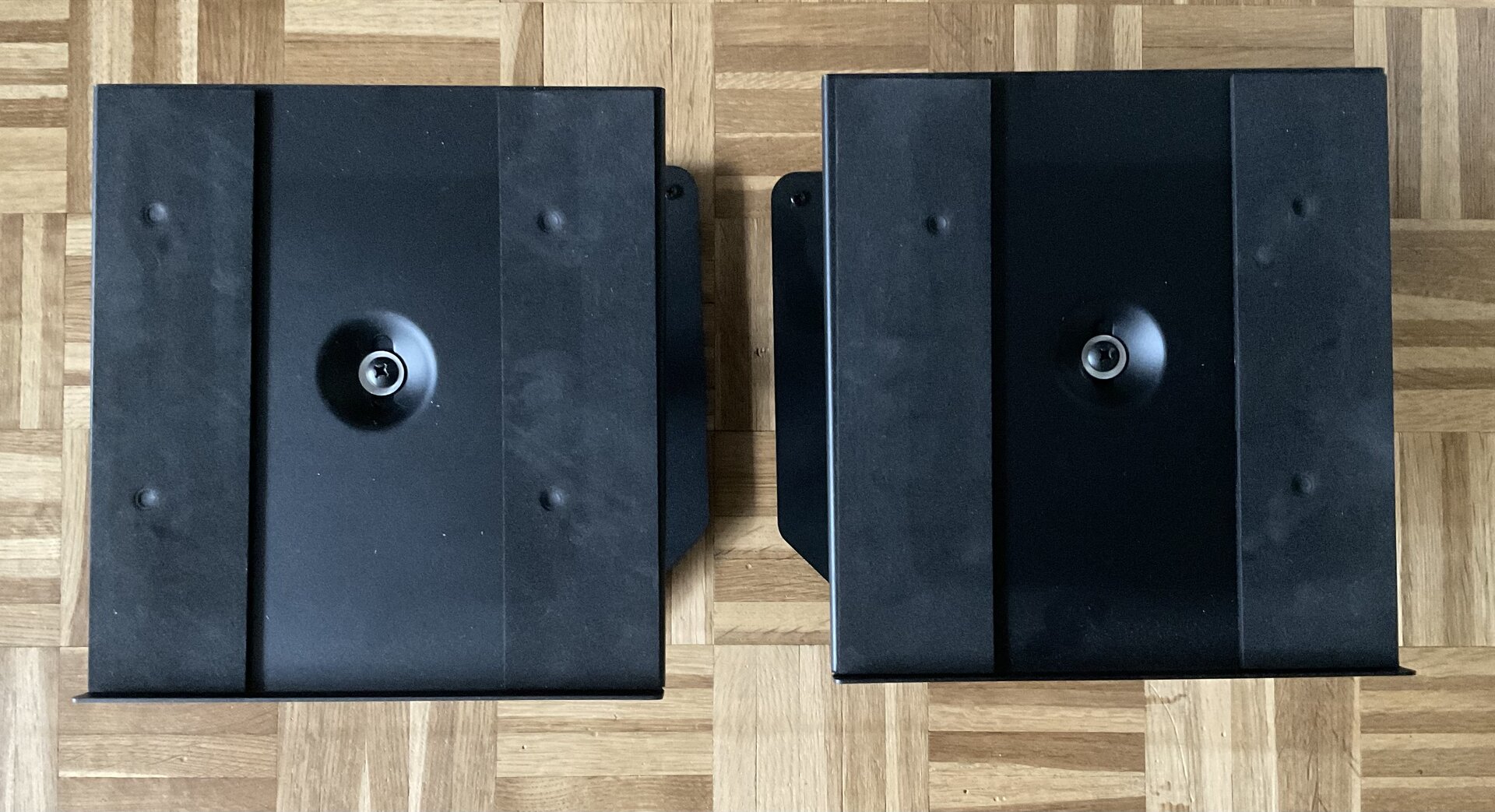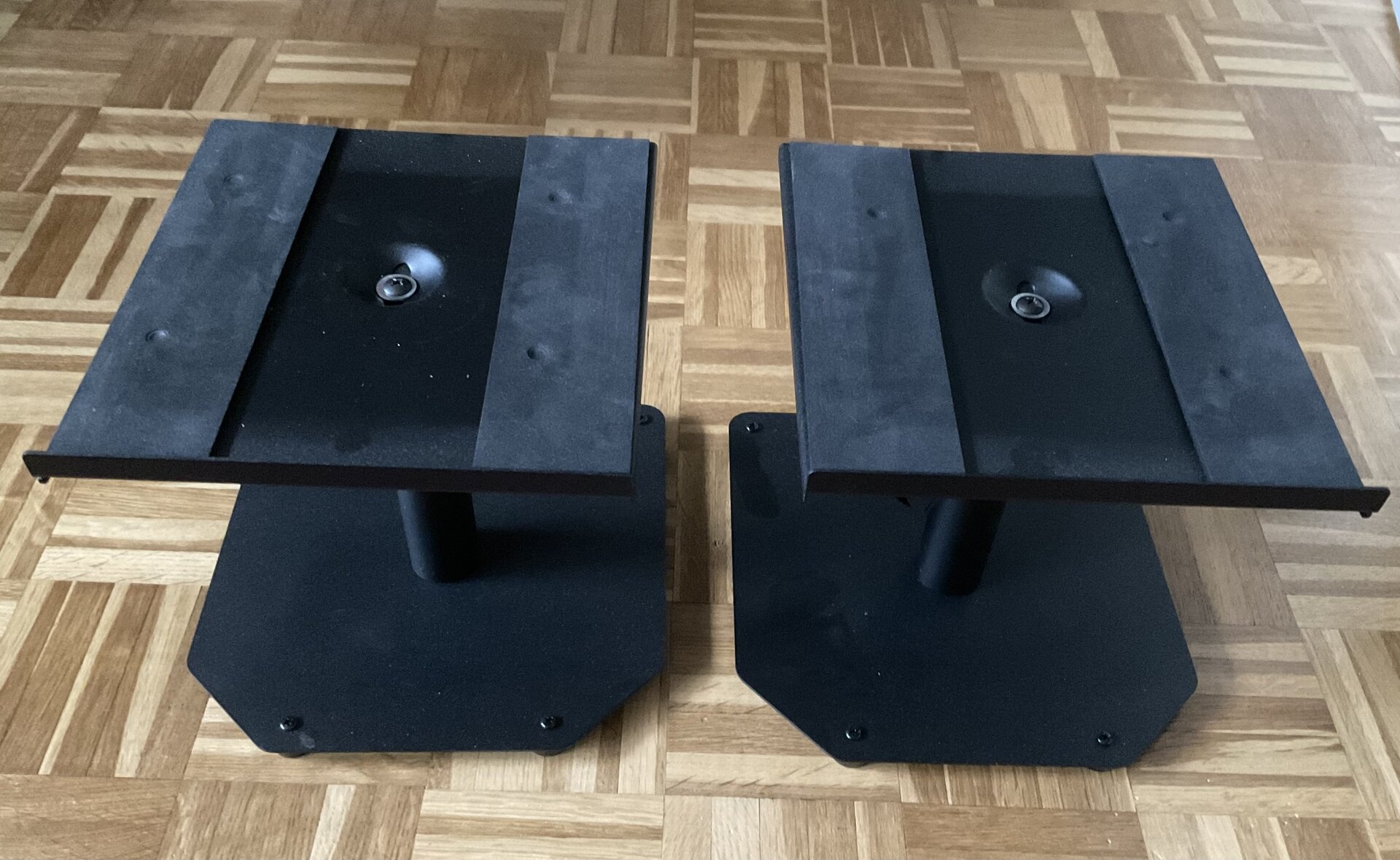 Meine Neumann K120 hatten darauf locker Platz. Die Ständer sind höhenverstellbar und gut abgesichert. Gebrauchsspuren vorhanden durch die Füße der Boxen (s. Foto)
