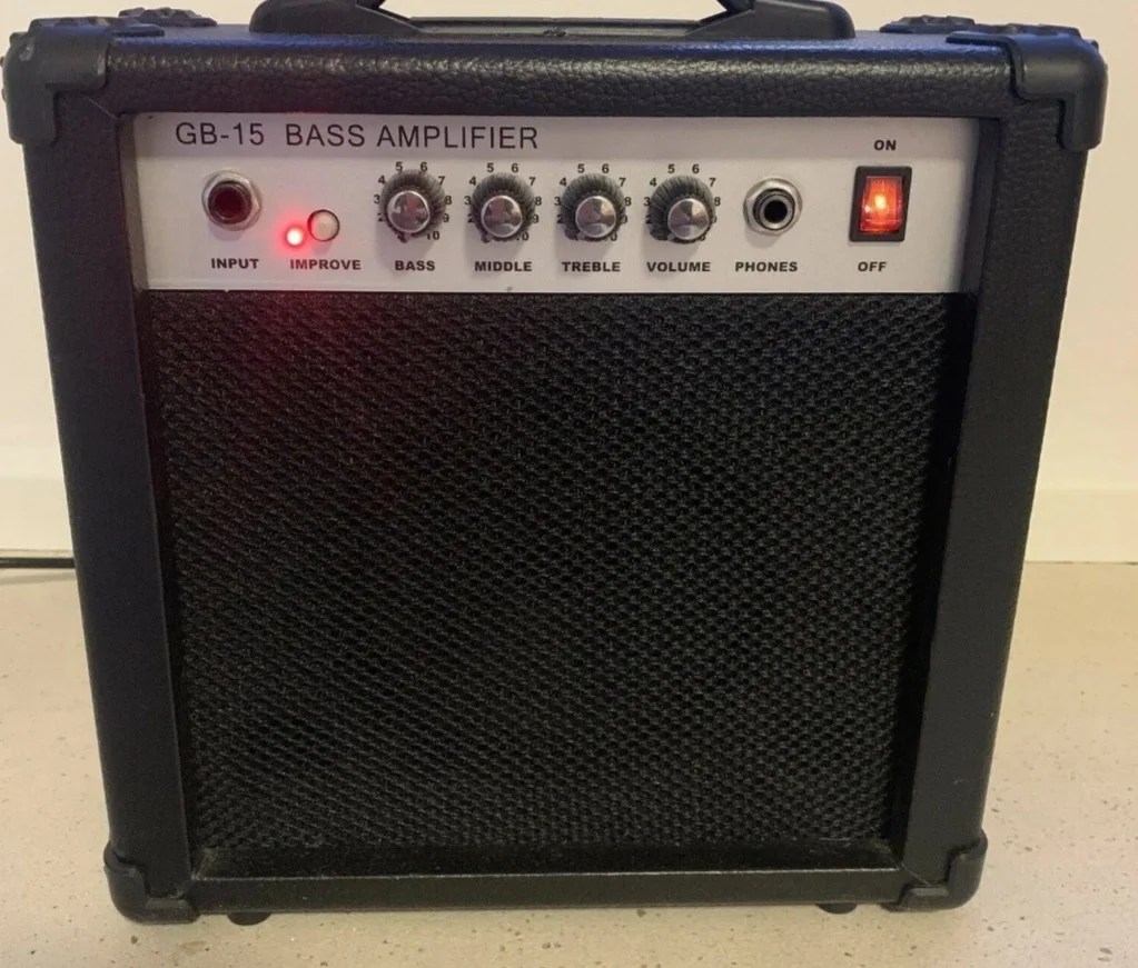 Verkaufe gebrauchten E-Bass von Rocktile mit Mg-15 Verstärker wo der Tragegriff fehlt.